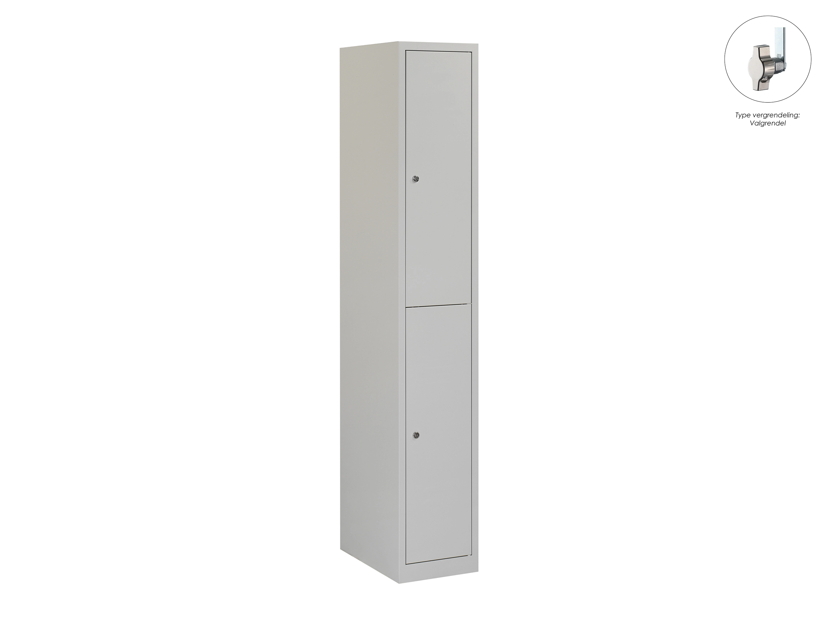 Type deuren: draaideur (glad zonder naamkaarthouder), type slot: valgrendelslot. Kleur romp: grijs (RAL7035), kleur deuren: grijs (RAL7035). Afmeting: 180x30x50 cm (HxBxD). Indeling: Kledingroede Aantal deuren: 2, aantal sleutels: geen.