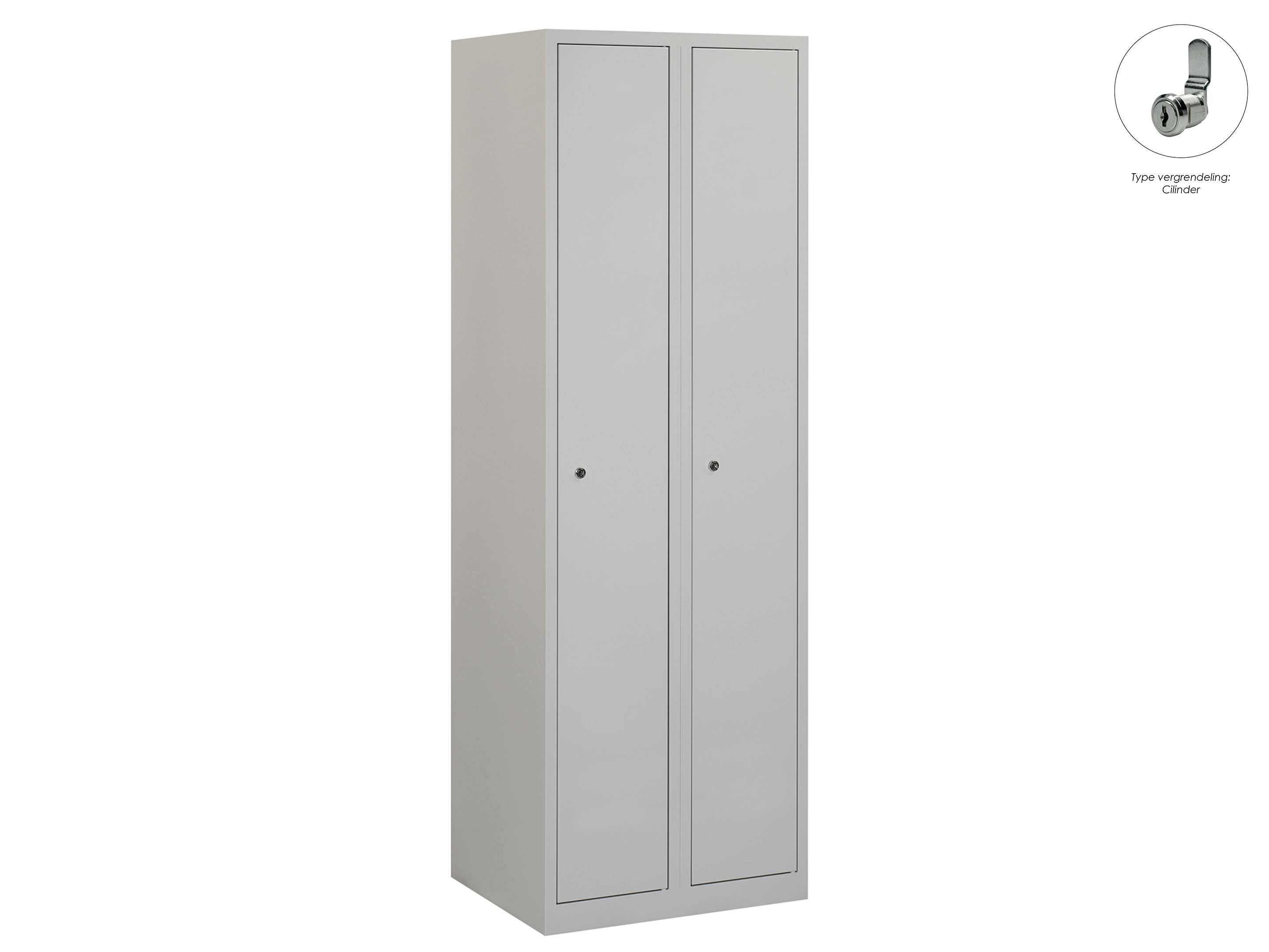 Type deuren: draaideur (glad zonder naamkaarthouder), type slot: cilinderslot. Kleur romp: grijs (RAL7035), kleur deuren: grijs (RAL7035). Afmeting: 180x60x50 cm (HxBxD). Indeling: Legbord & kledingroede Aantal deuren: 2, aantal sleutels: 2.
