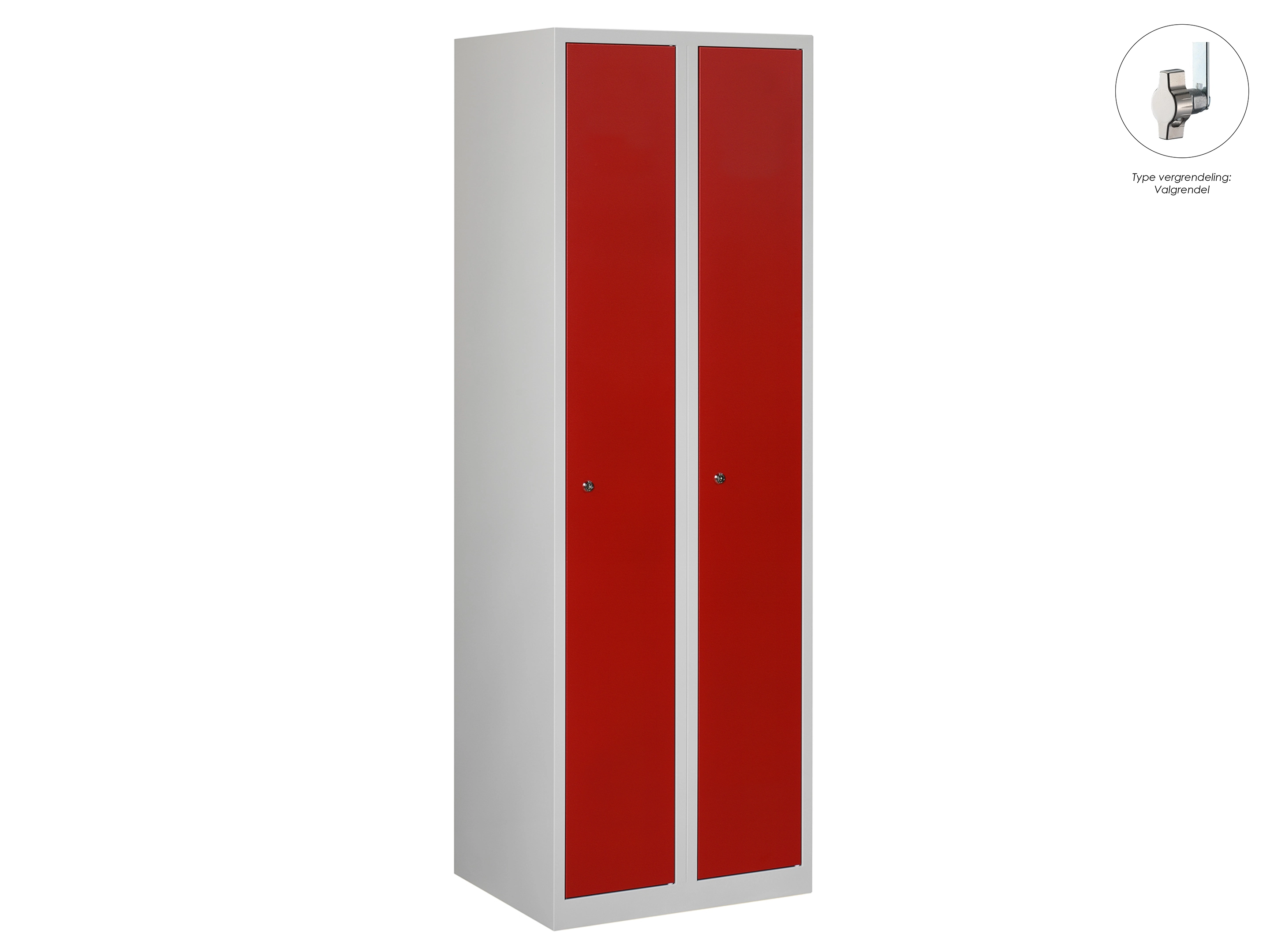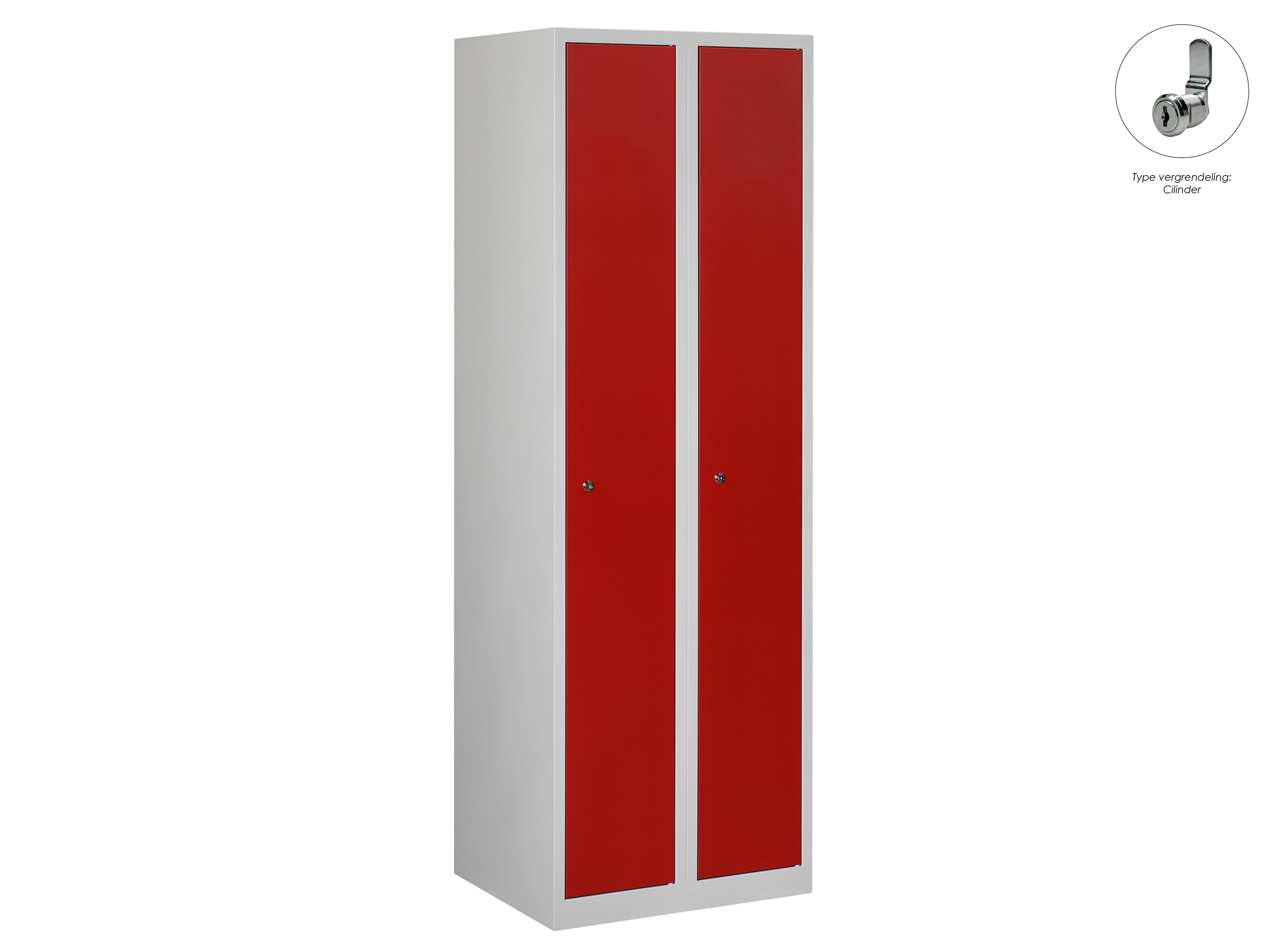 Type deuren: draaideur (ventilatiesleuven), type slot: cilinderslot. Kleur romp: grijs (RAL7035), kleur deuren: rood (RAL3000). Afmeting: 180x80x50 cm (HxBxD). Indeling: Legbord & kledingroede Aantal deuren: 2, aantal sleutels: 2.