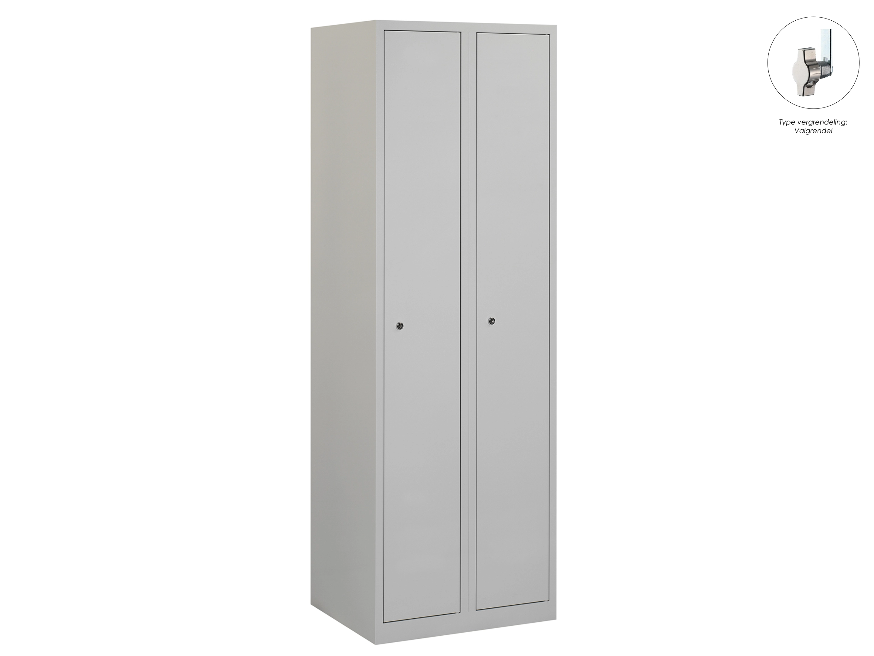 Type deuren: draaideur (glad zonder naamkaarthouder), type slot: valgrendelslot. Kleur romp: grijs (RAL7035), kleur deuren: grijs (RAL7035). Afmeting: 180x60x50 cm (HxBxD). Indeling: Legbord & kledingroede Aantal deuren: 2, aantal sleutels: geen.