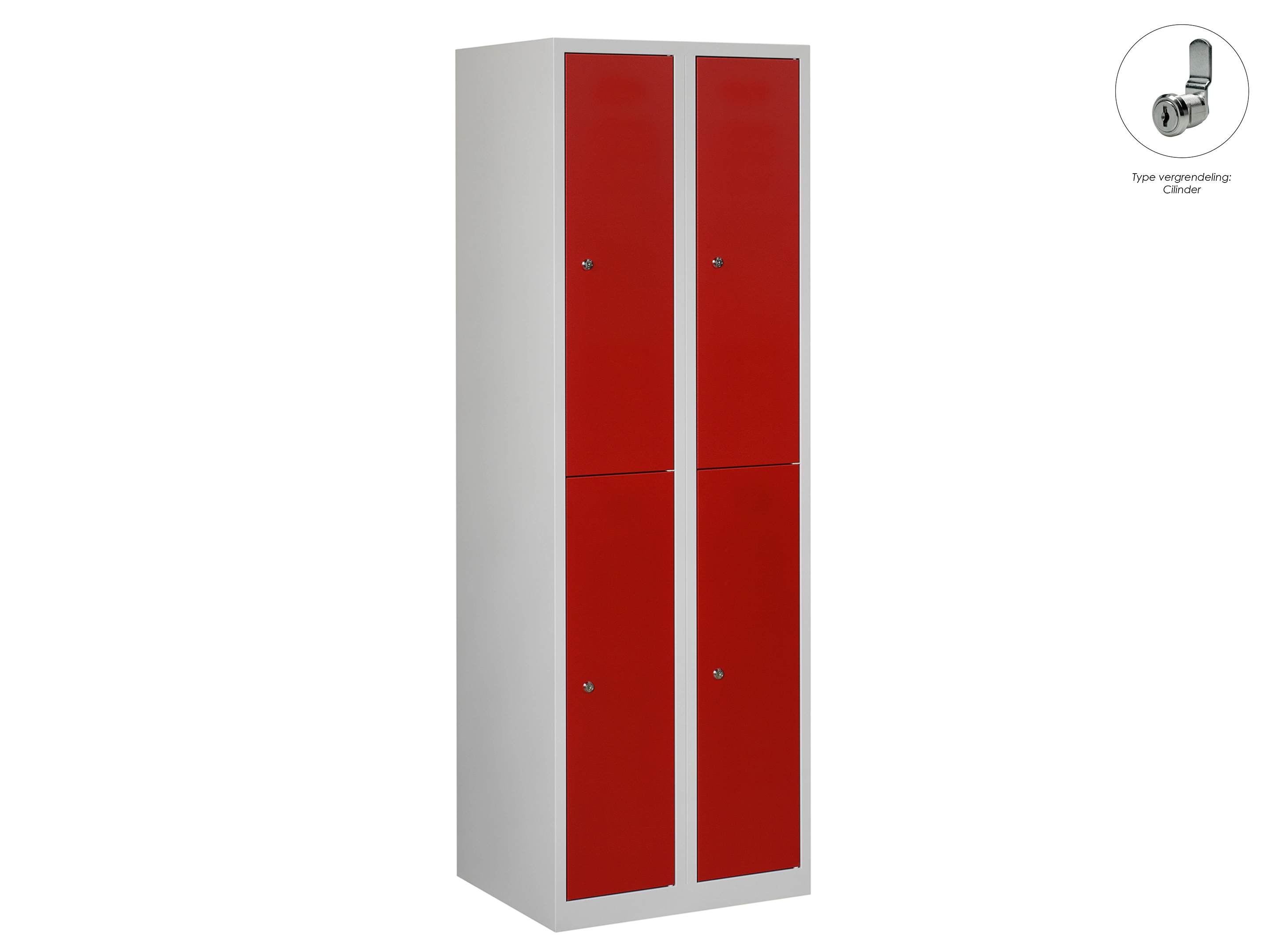 Type deuren: draaideur (glad zonder naamkaarthouder), type slot: cilinderslot. Kleur romp: grijs (RAL7035), kleur deuren: rood (RAL3000). Afmeting: 180x60x50 cm (HxBxD). Indeling: Kledingroede Aantal deuren: 4, aantal sleutels: 2.