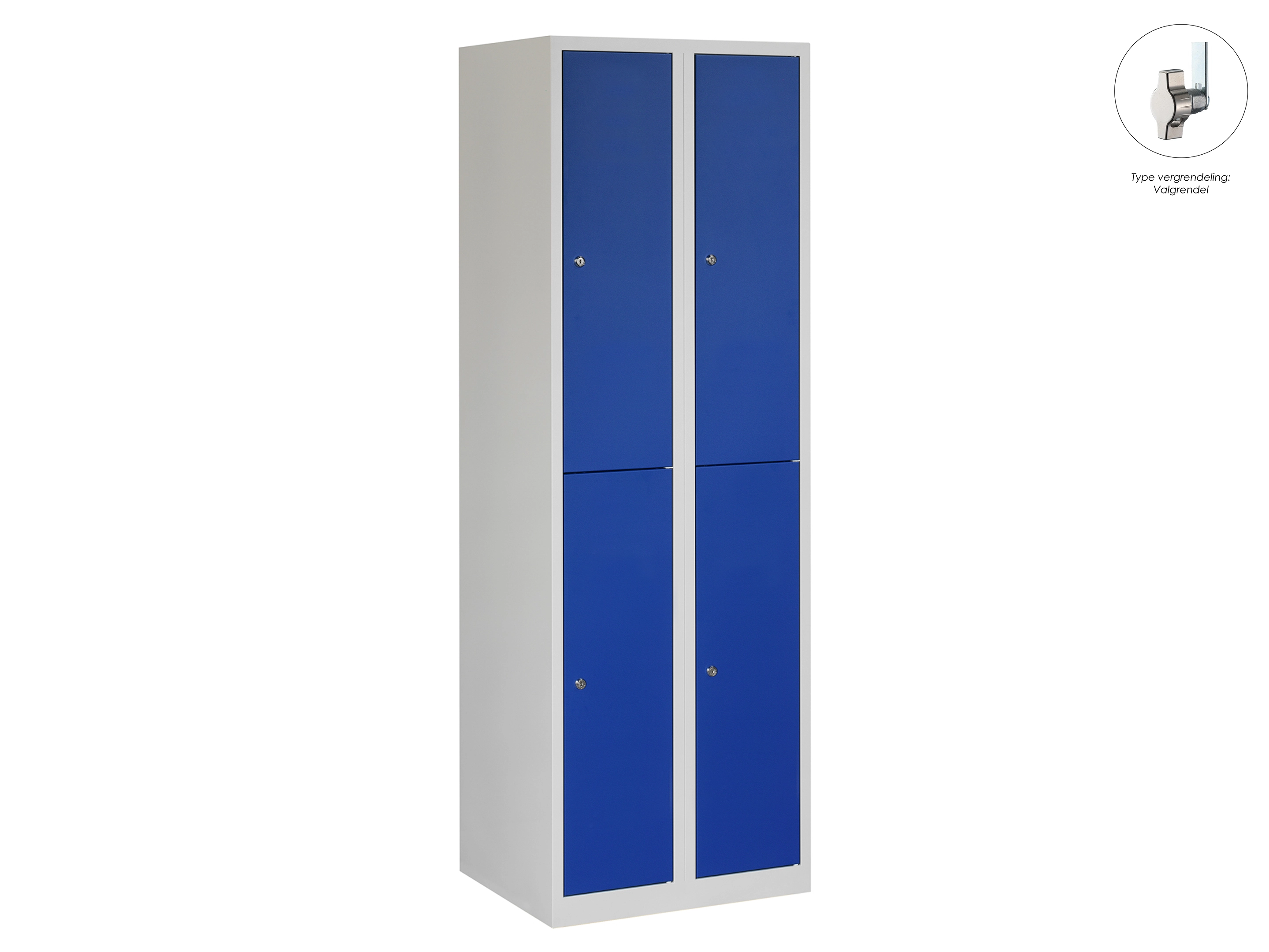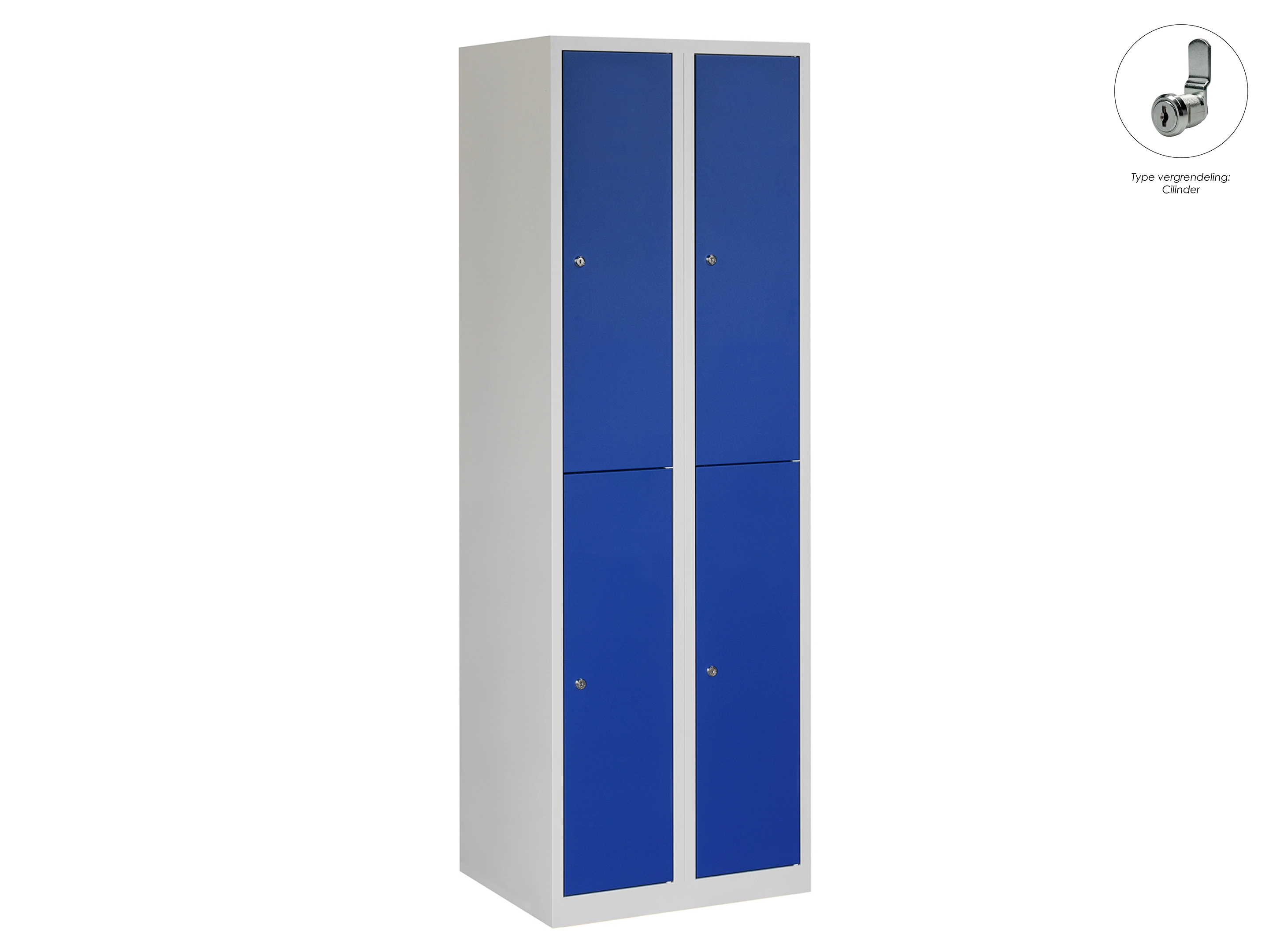 Type deuren: draaideur (ventilatiesleuven), type slot: cilinderslot. Kleur romp: grijs (RAL7035), kleur deuren: blauw (RAL5010). Afmeting: 180x80x50 cm (HxBxD). Indeling: Kledingroede Aantal deuren: 4, aantal sleutels: 2.