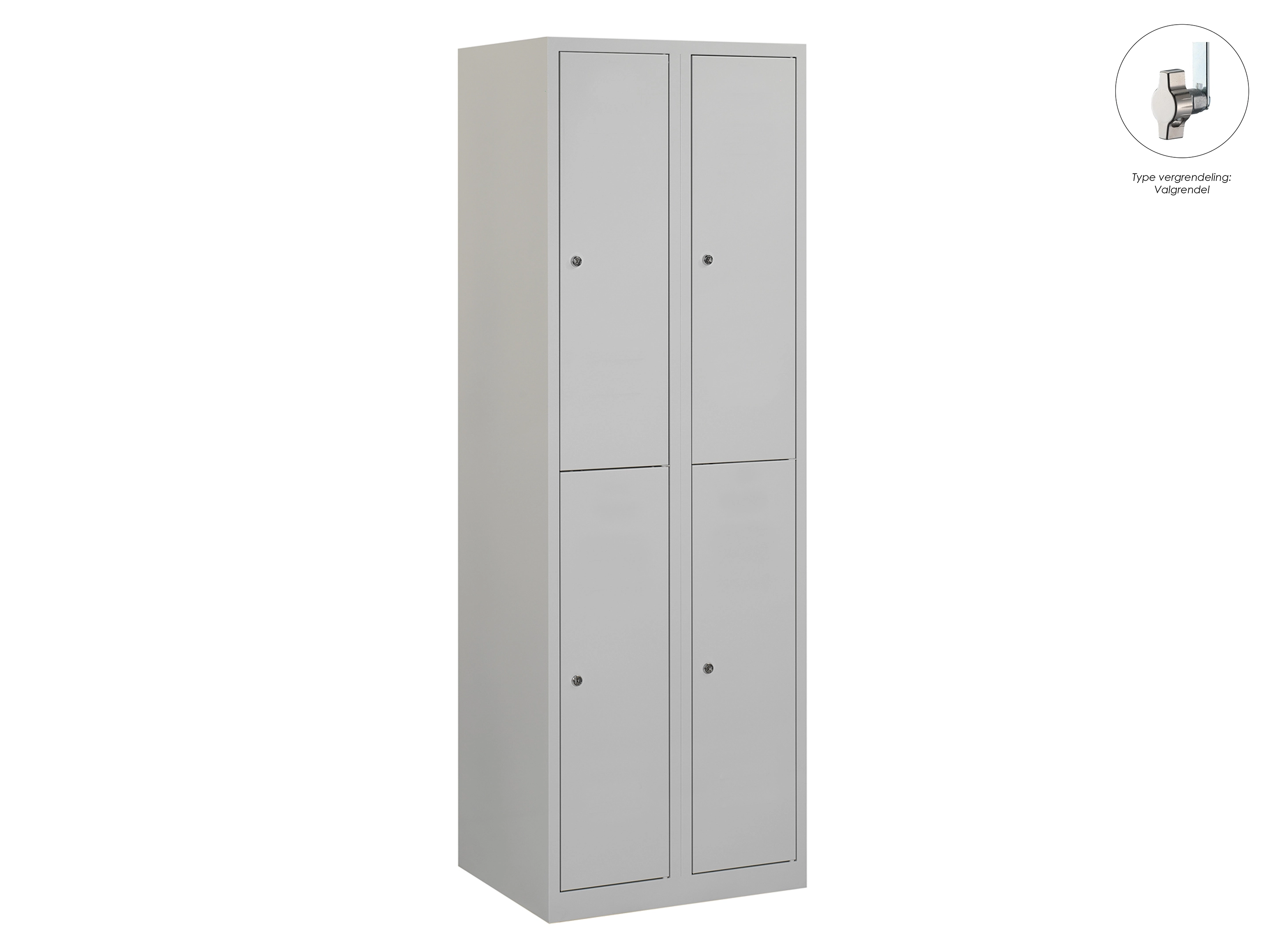 Type deuren: draaideur (glad zonder naamkaarthouder), type slot: valgrendelslot. Kleur romp: grijs (RAL7035), kleur deuren: grijs (RAL7035). Afmeting: 180x60x50 cm (HxBxD). Indeling: Kledingroede Aantal deuren: 4, aantal sleutels: geen.