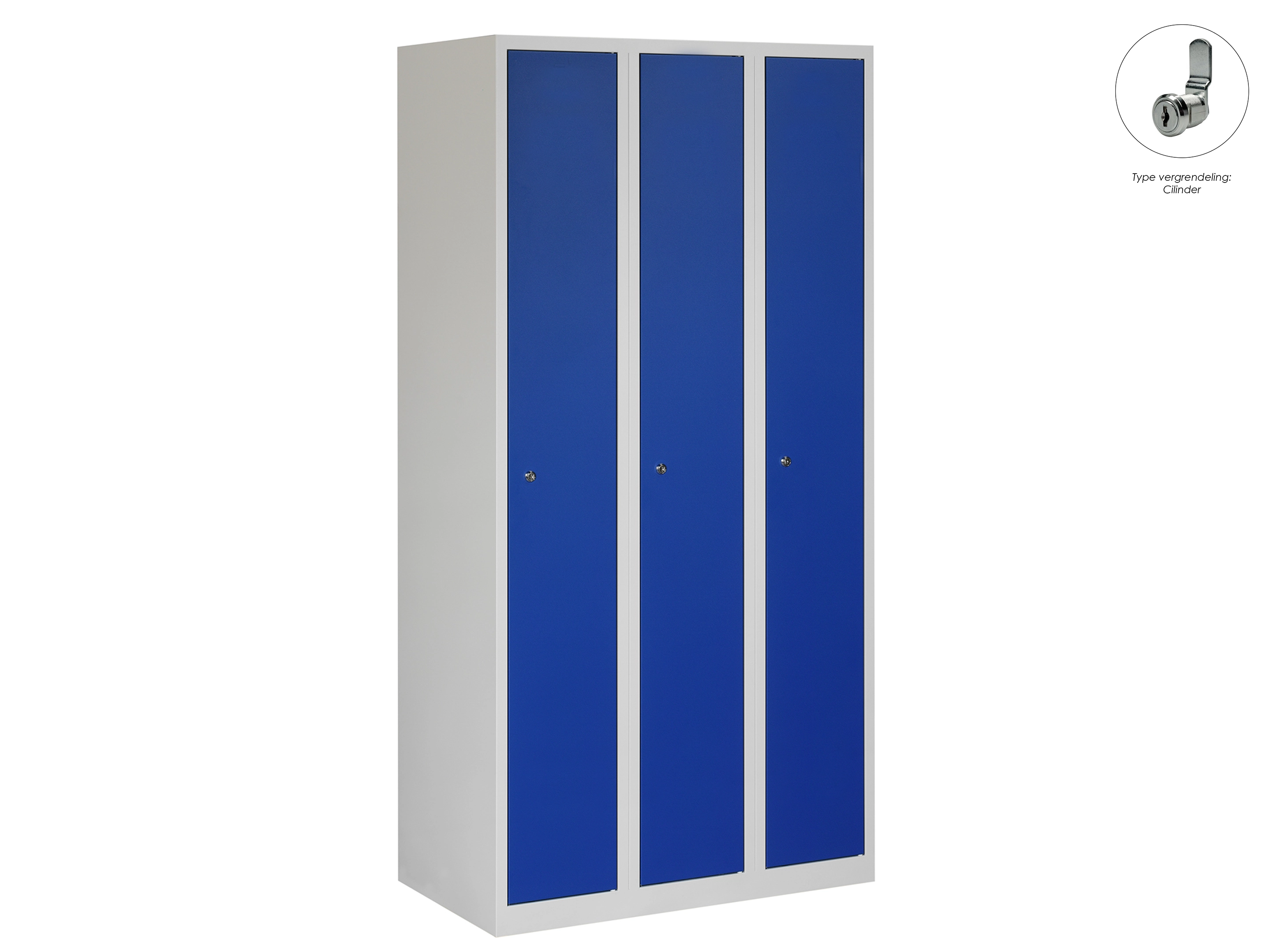Type deuren: draaideur (glad zonder naamkaarthouder), type slot: cilinderslot. Kleur romp: grijs (RAL7035), kleur deuren: blauw (RAL5010). Afmeting: 180x90x50 cm (HxBxD). Indeling: Legbord & kledingroede Aantal deuren: 3, aantal sleutels: 2.