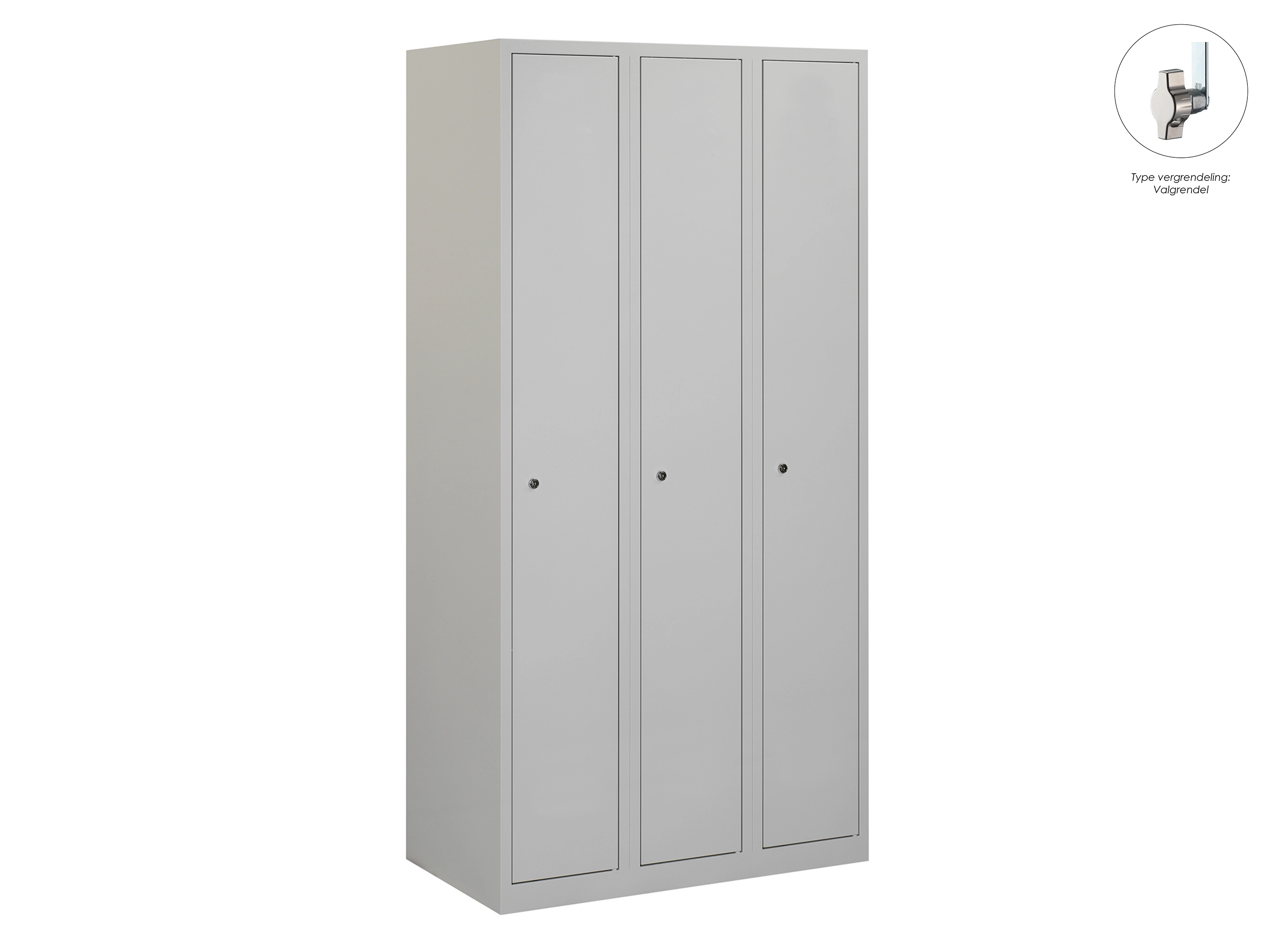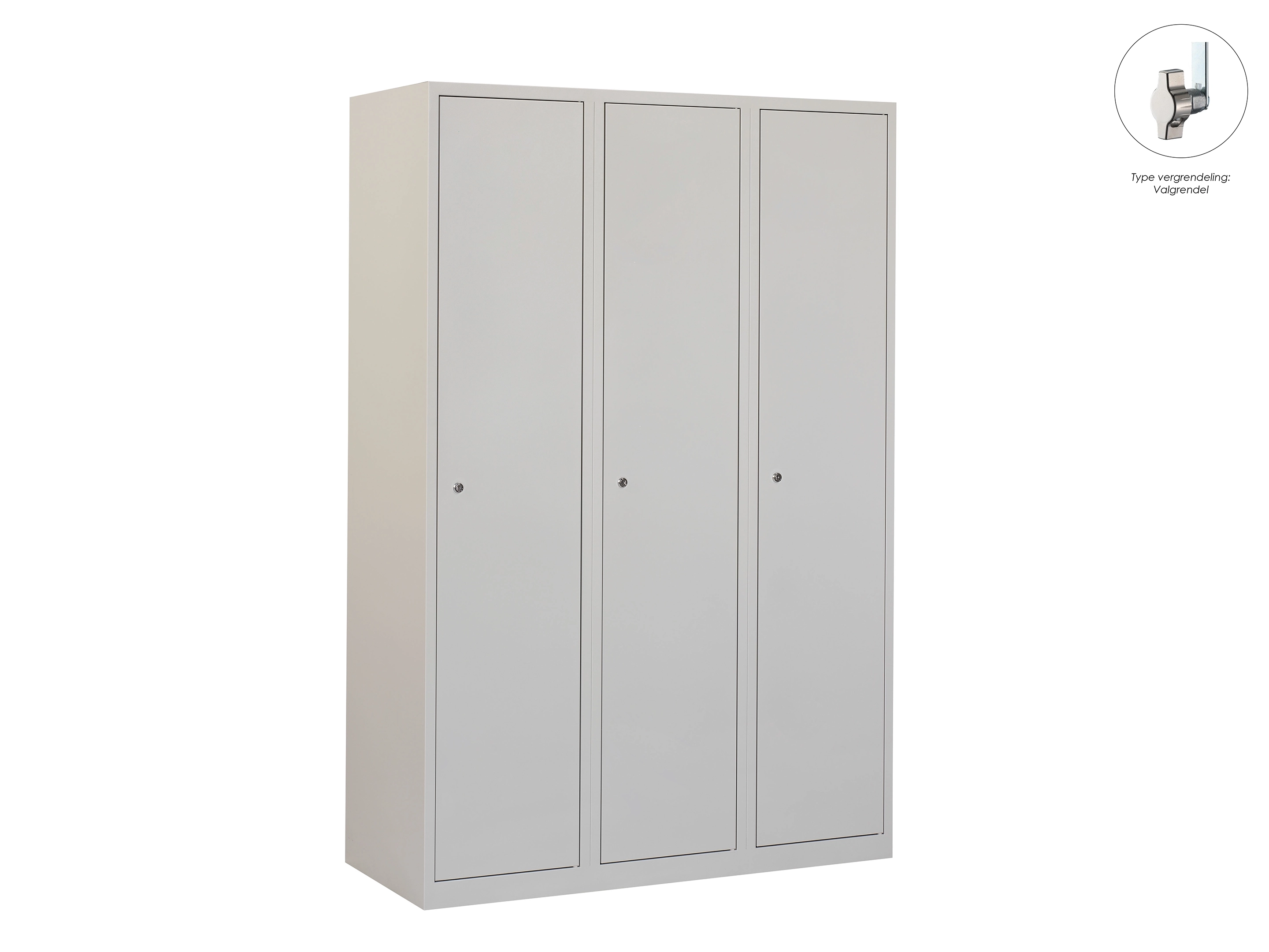 Type deuren: draaideur (glad zonder naamkaarthouder), type slot: valgrendelslot. Kleur romp: grijs (RAL7035), kleur deuren: grijs (RAL7035). Afmeting: 180x90x50 cm (HxBxD). Indeling: Legbord & kledingroede Aantal deuren: 3, aantal sleutels: geen.