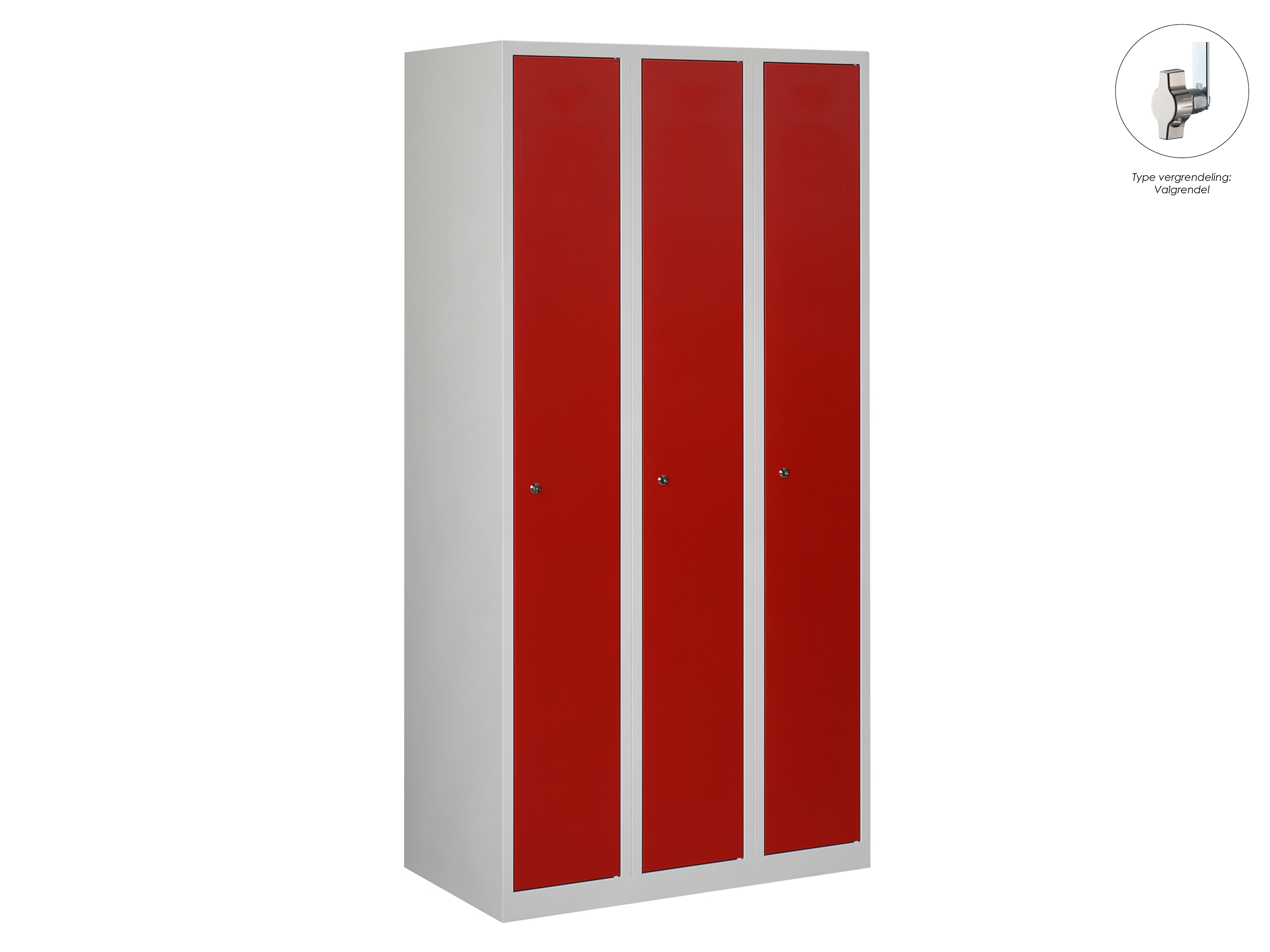 Type deuren: draaideur (glad zonder naamkaarthouder), type slot: valgrendelslot. Kleur romp: grijs (RAL7035), kleur deuren: rood (RAL3000). Afmeting: 180x90x50 cm (HxBxD). Indeling: Legbord & kledingroede Aantal deuren: 3, aantal sleutels: geen.