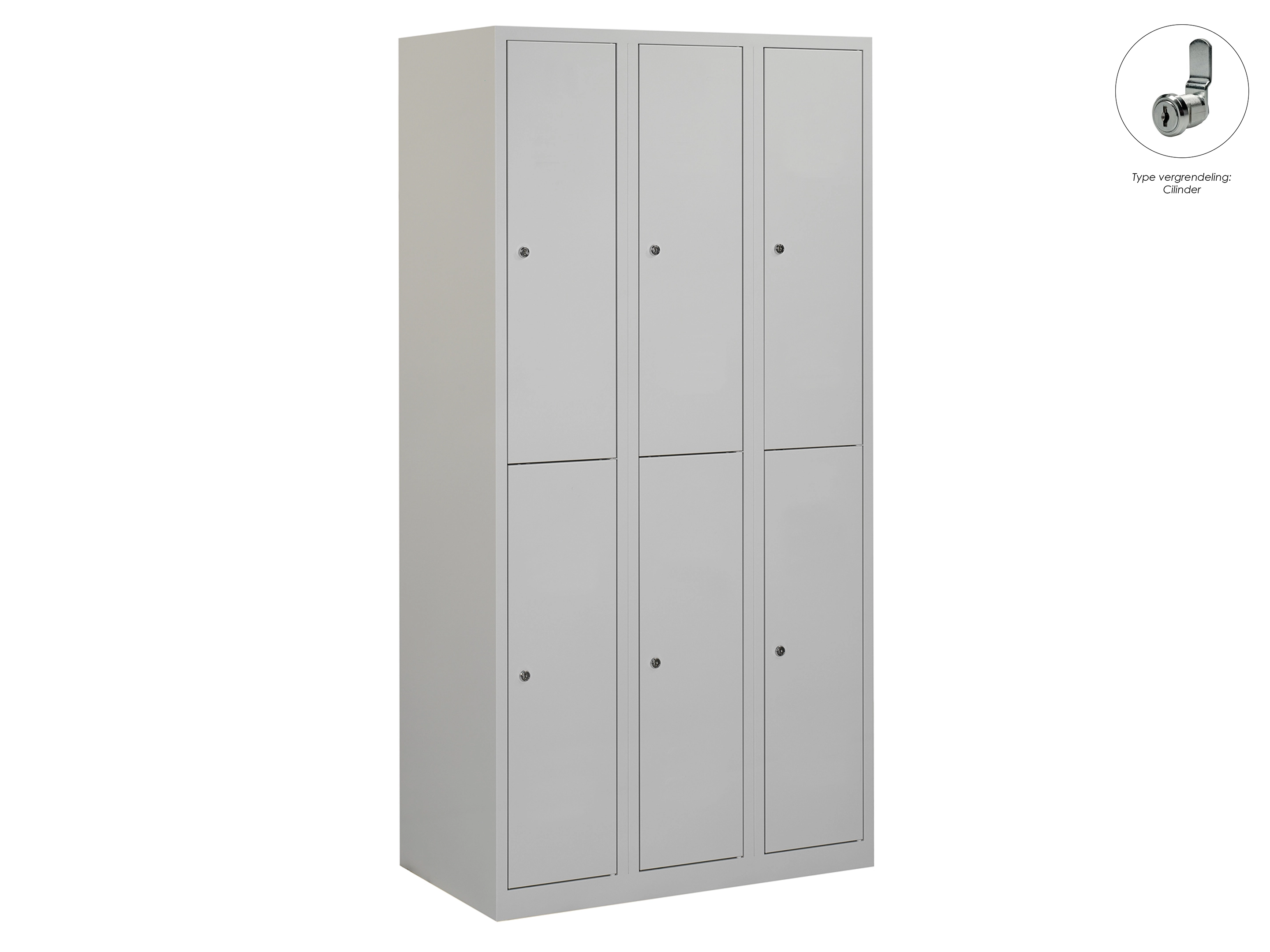 Type deuren: draaideur (glad zonder naamkaarthouder), type slot: cilinderslot. Kleur romp: grijs (RAL7035), kleur deuren: grijs (RAL7035). Afmeting: 180x90x50 cm (HxBxD). Indeling: Kledingroede Aantal deuren: 6, aantal sleutels: 2.