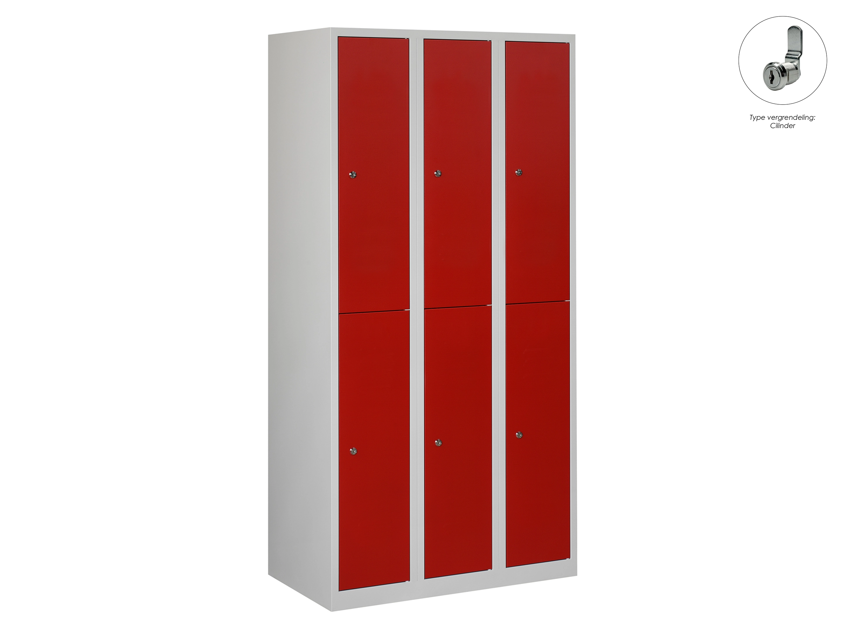 Type deuren: draaideur (glad zonder naamkaarthouder), type slot: cilinderslot. Kleur romp: grijs (RAL7035), kleur deuren: rood (RAL3000). Afmeting: 180x90x50 cm (HxBxD). Indeling: Kledingroede Aantal deuren: 6, aantal sleutels: 2.