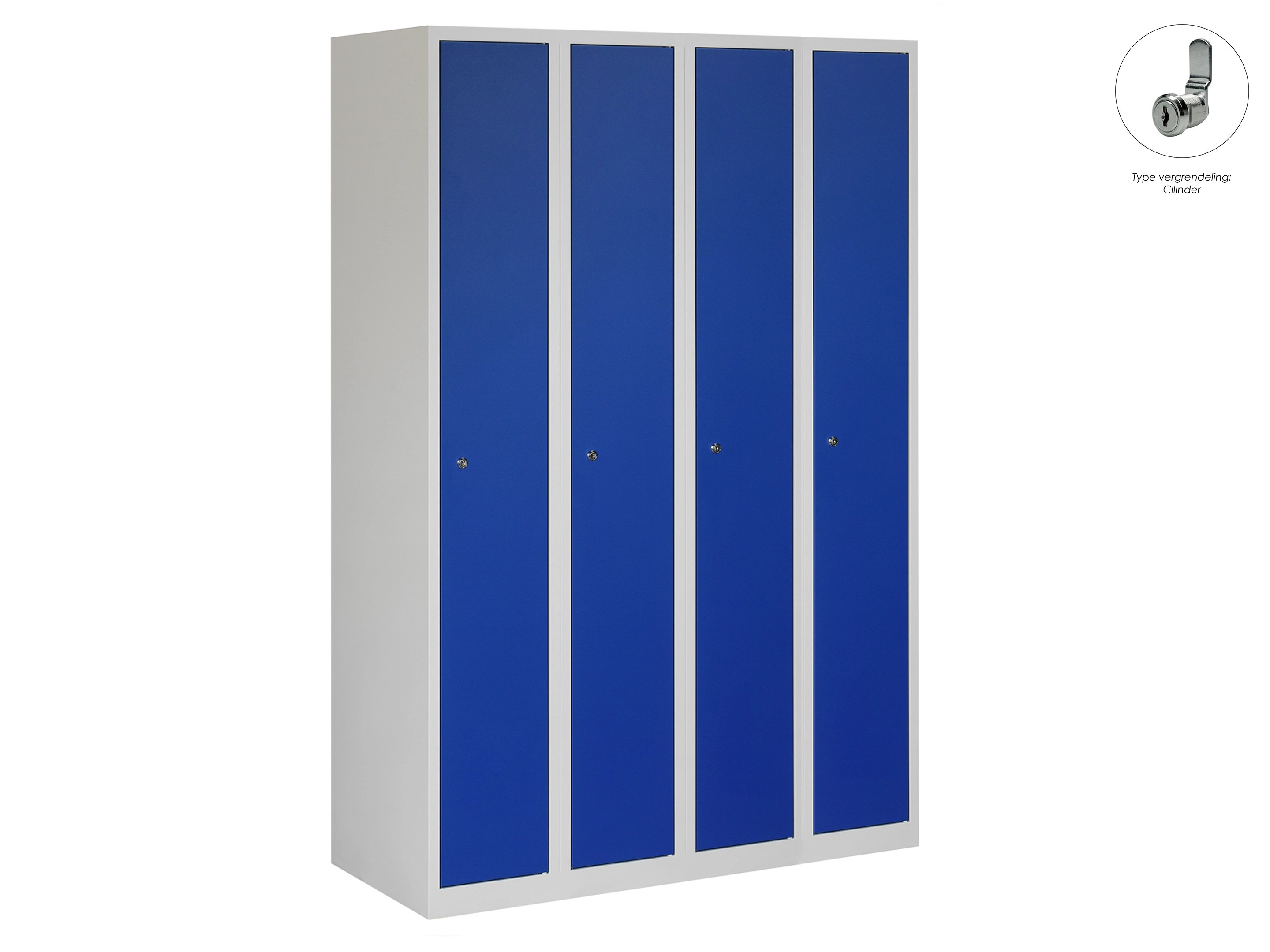 Type deuren: draaideur (glad zonder naamkaarthouder), type slot: cilinderslot. Kleur romp: grijs (RAL7035), kleur deuren: blauw (RAL5010). Afmeting: 180x120x50 cm (HxBxD). Indeling: Kledingroede Aantal deuren: 4, aantal sleutels: 2.