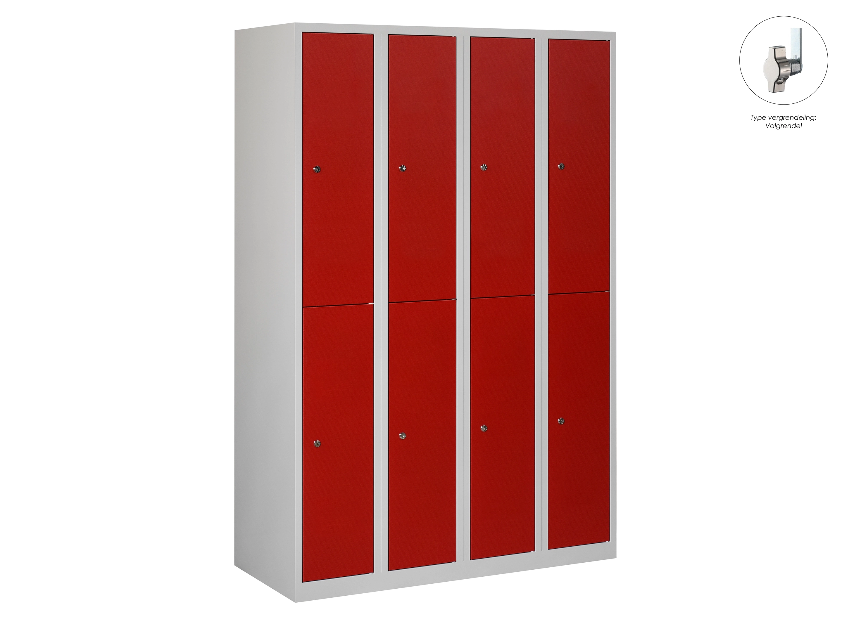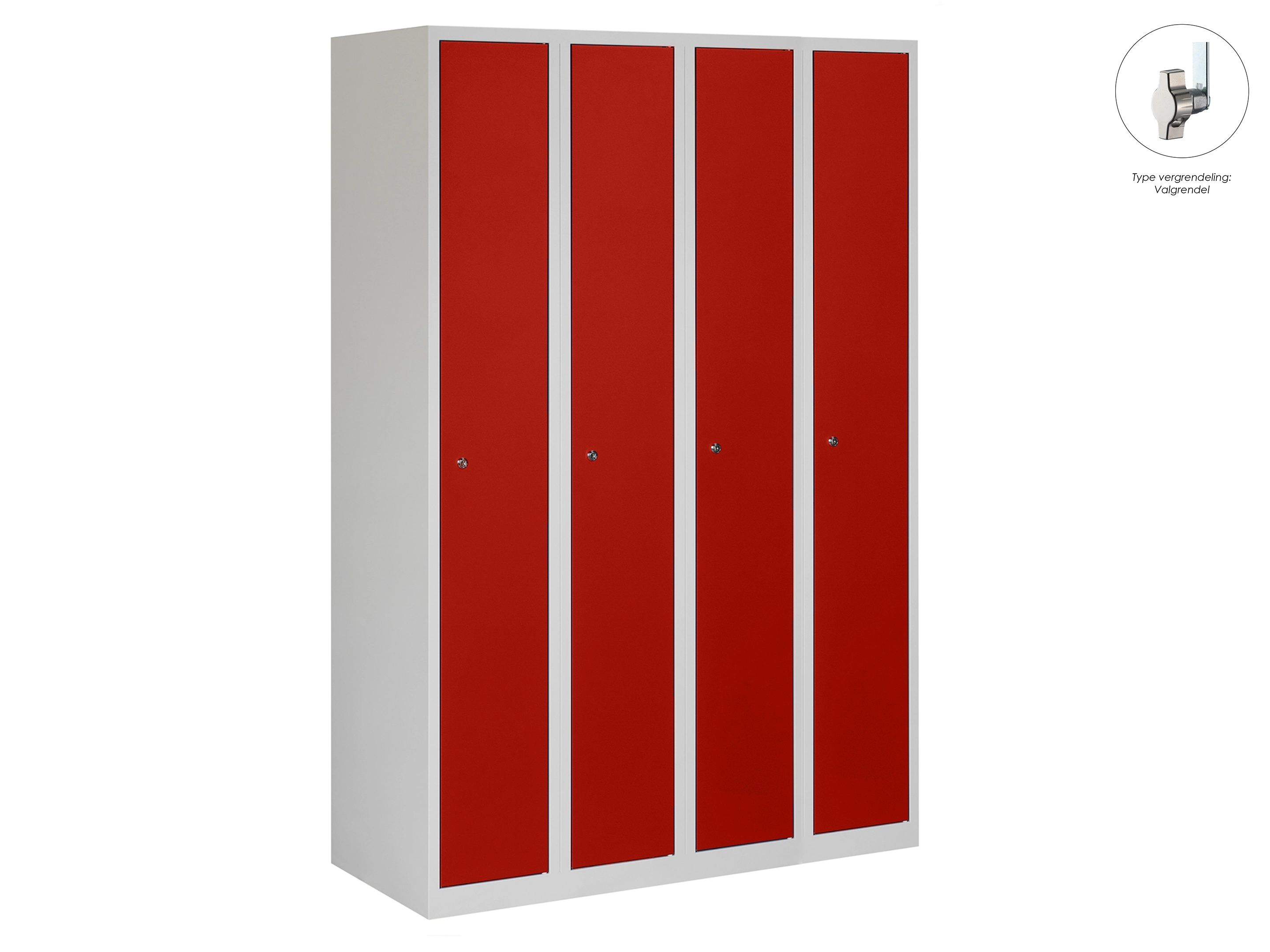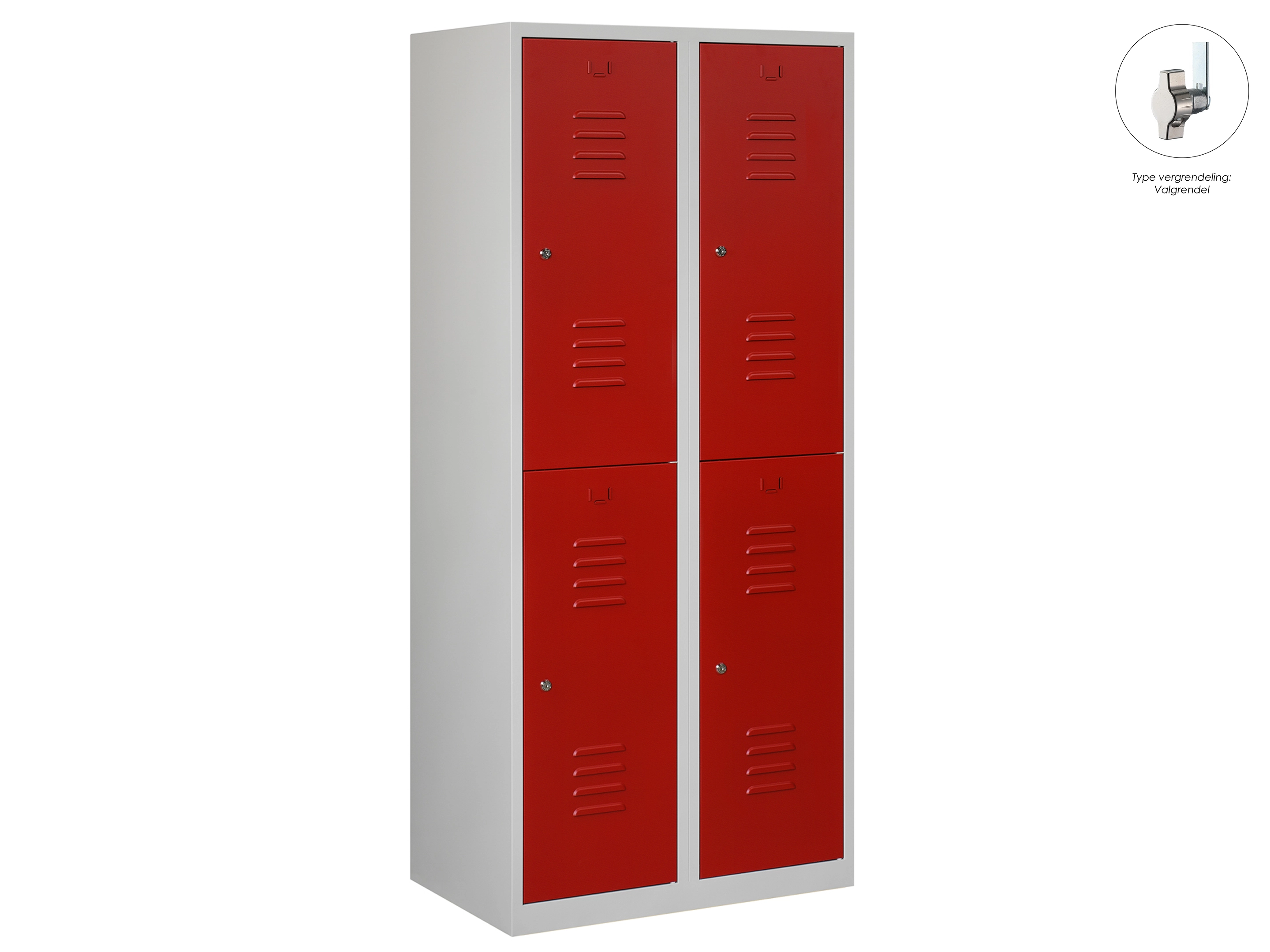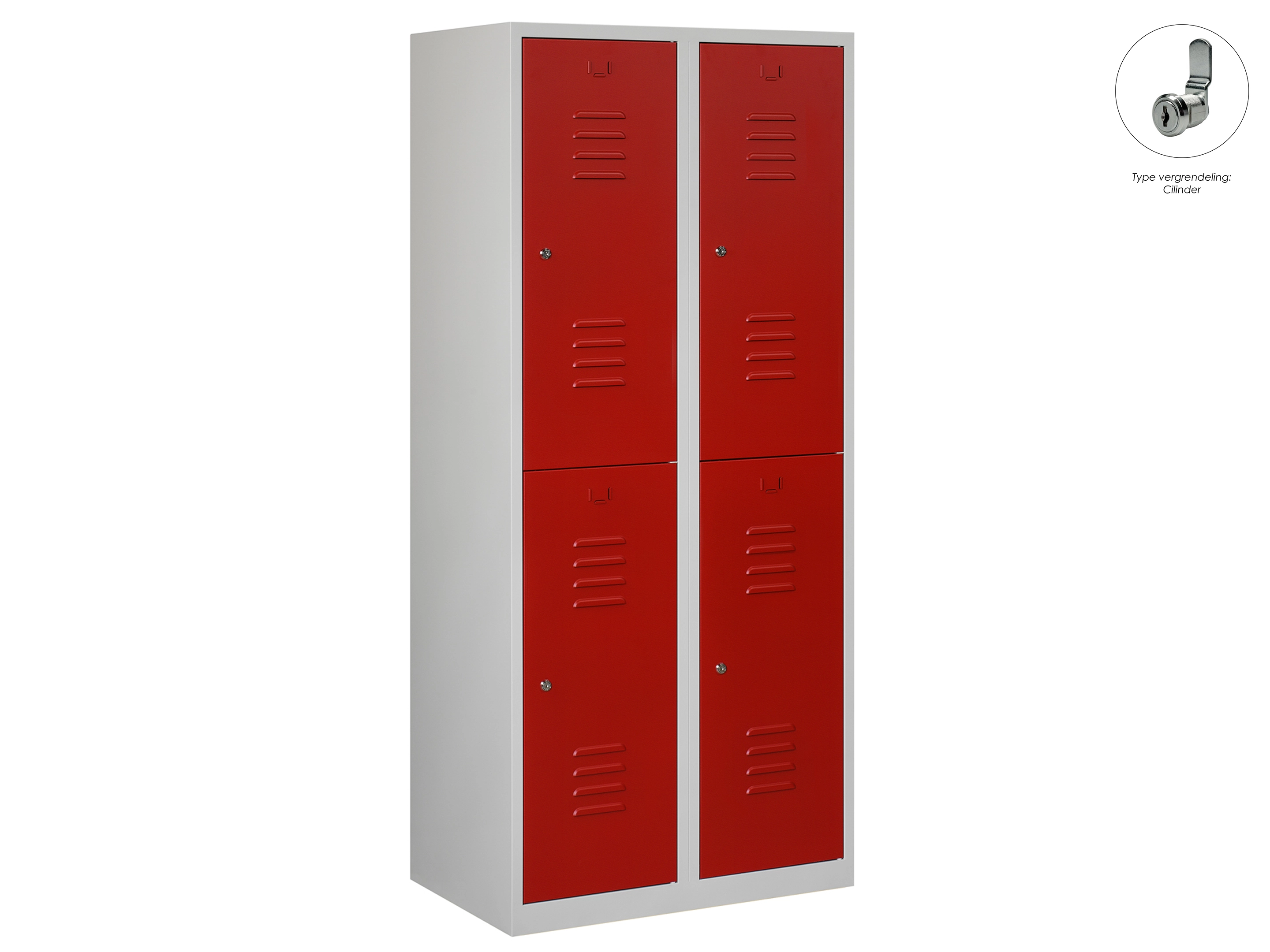 Type deuren: draaideur (ventilatiesleuven), type slot: valgrendelslot. Kleur romp: grijs (RAL7035), kleur deuren: rood (RAL3000). Afmeting: 180x80x50 cm (HxBxD). Indeling: Kledingroede Aantal deuren: 4, aantal sleutels: geen.