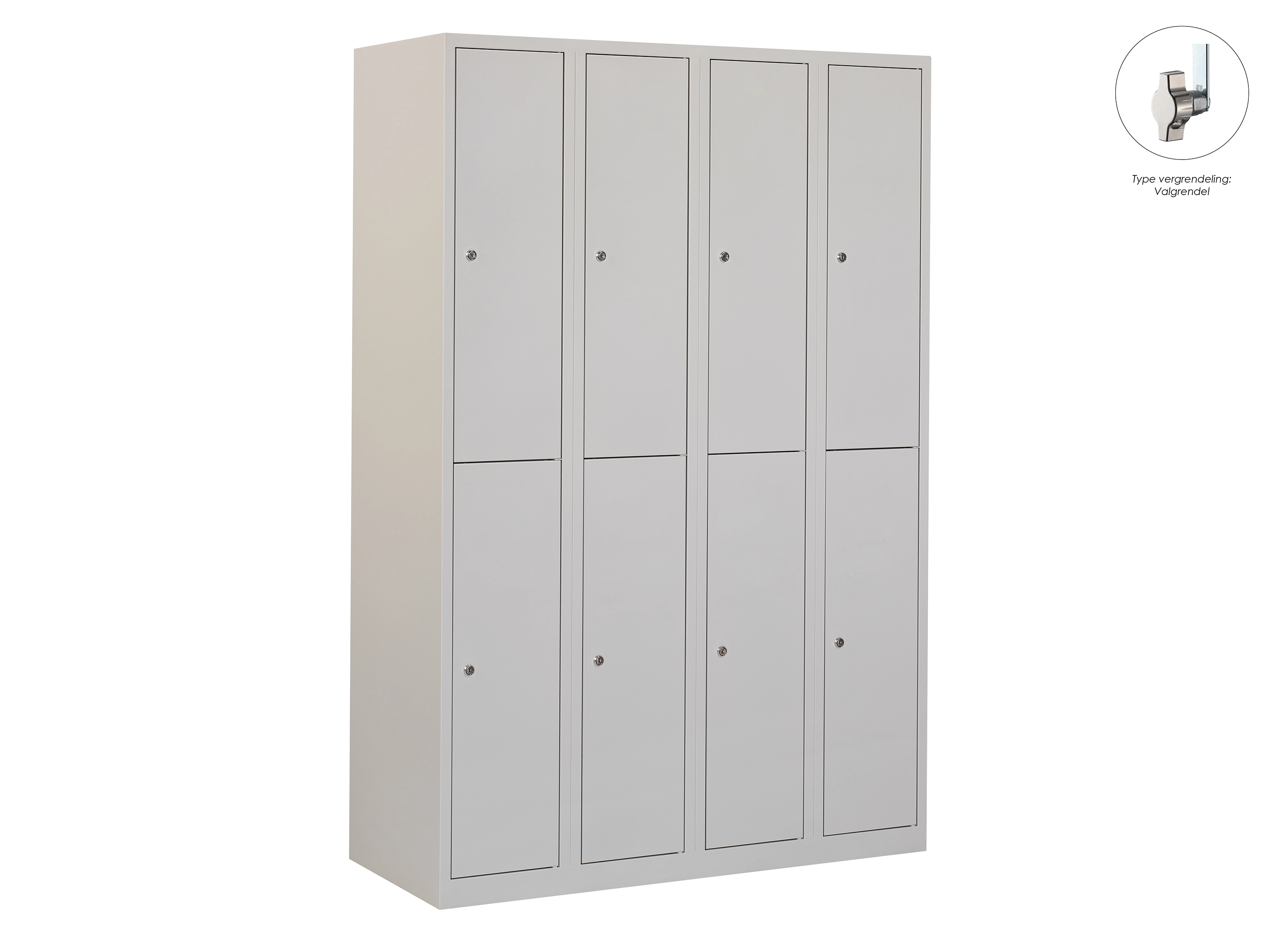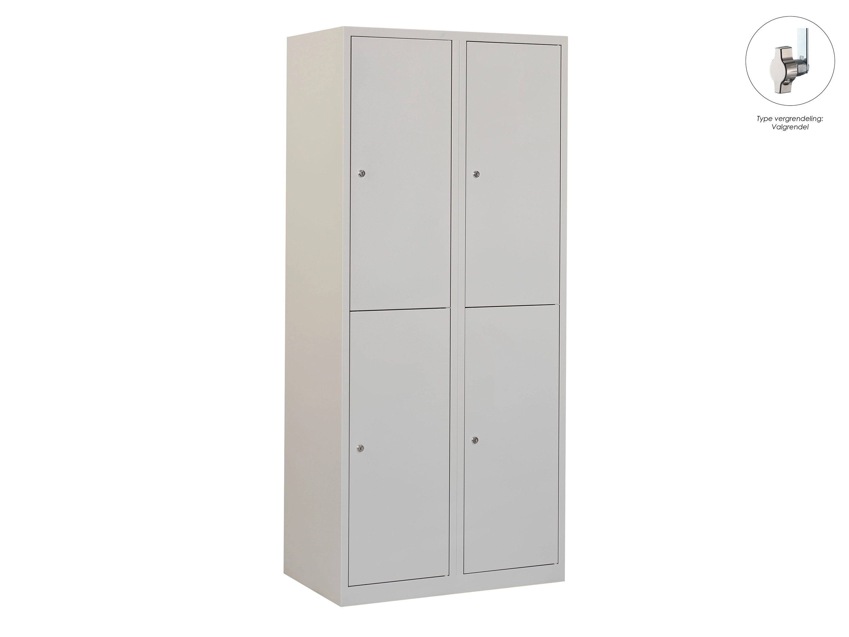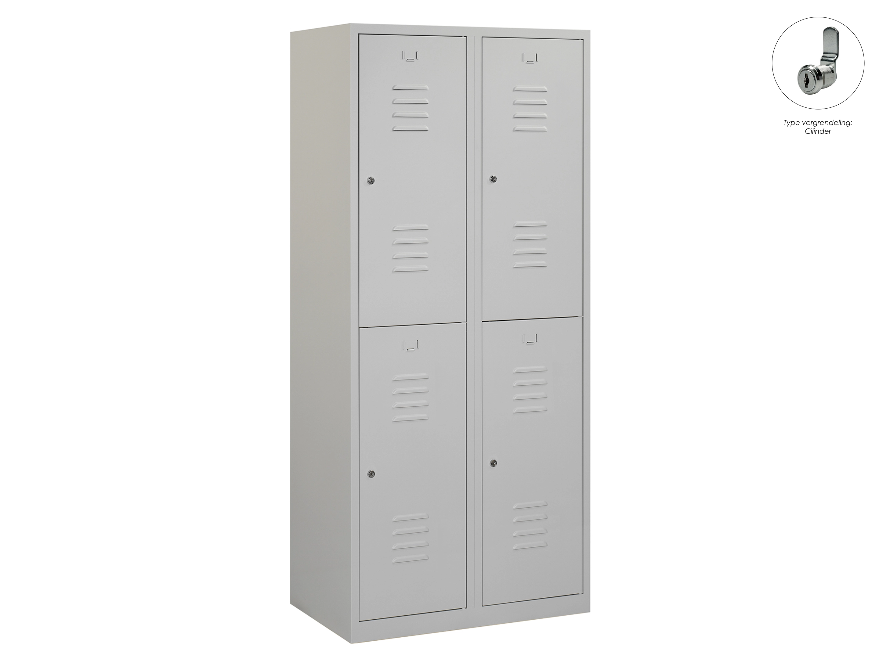 Type deuren: draaideur (ventilatiesleuven), type slot: valgrendelslot. Kleur romp: grijs (RAL7035), kleur deuren: grijs (RAL7035). Afmeting: 180x80x50 cm (HxBxD). Indeling: Kledingroede Aantal deuren: 4, aantal sleutels: geen.