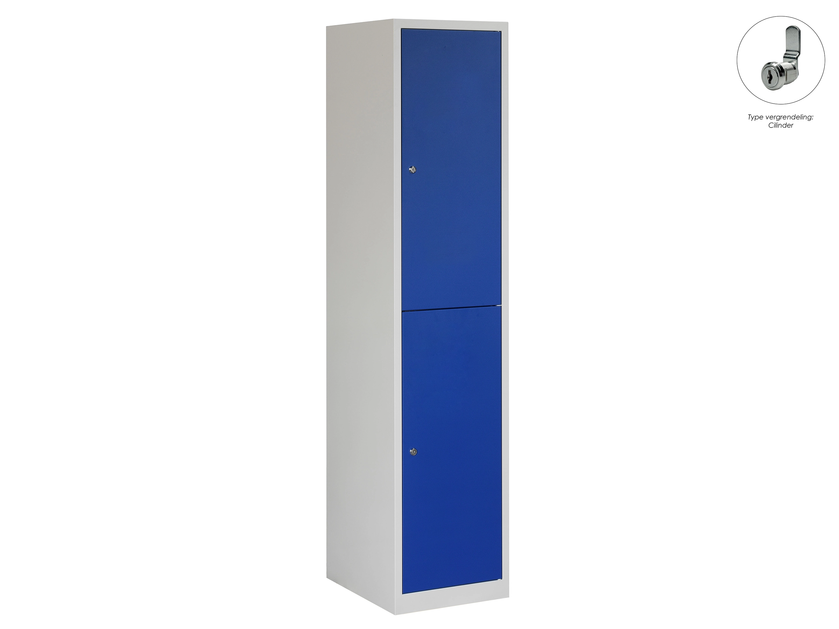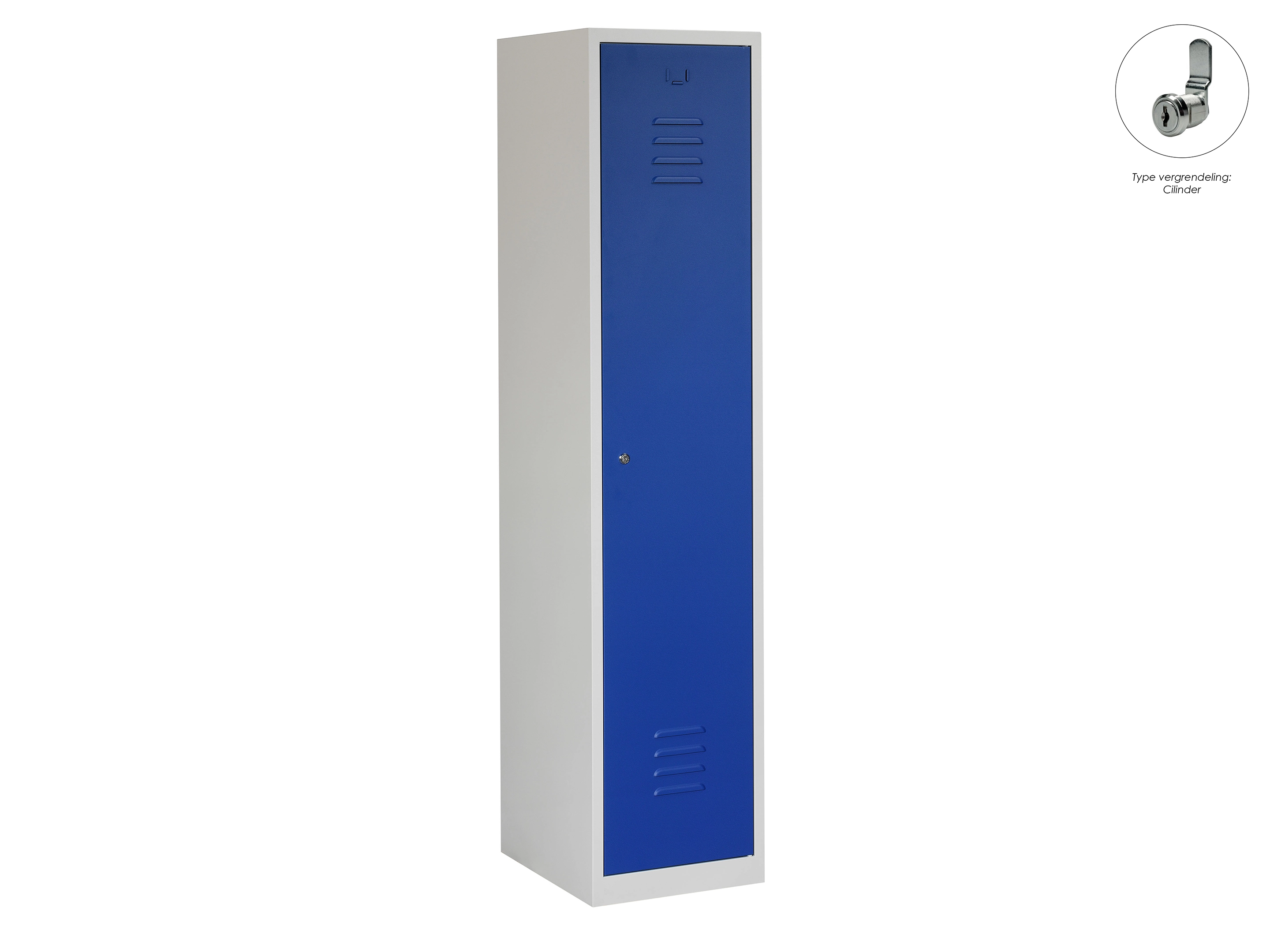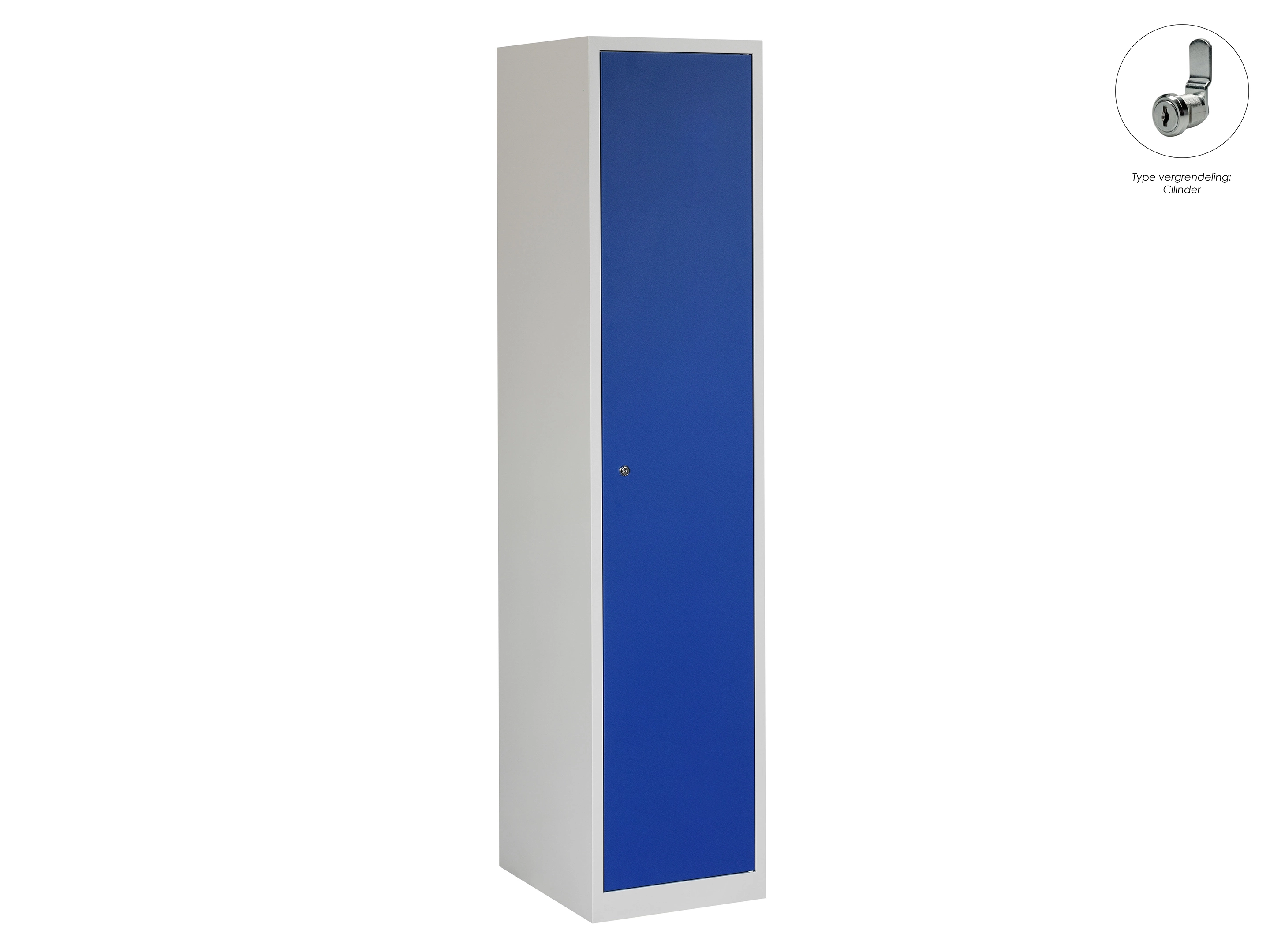 Type deuren: draaideur (ventilatiesleuven), type slot: cilinderslot. Kleur romp: grijs (RAL7035), kleur deuren: blauw (RAL5010). Afmeting: 180x40x50 cm (HxBxD). Indeling: Kledingroede Aantal deuren: 2, aantal sleutels: 2.
