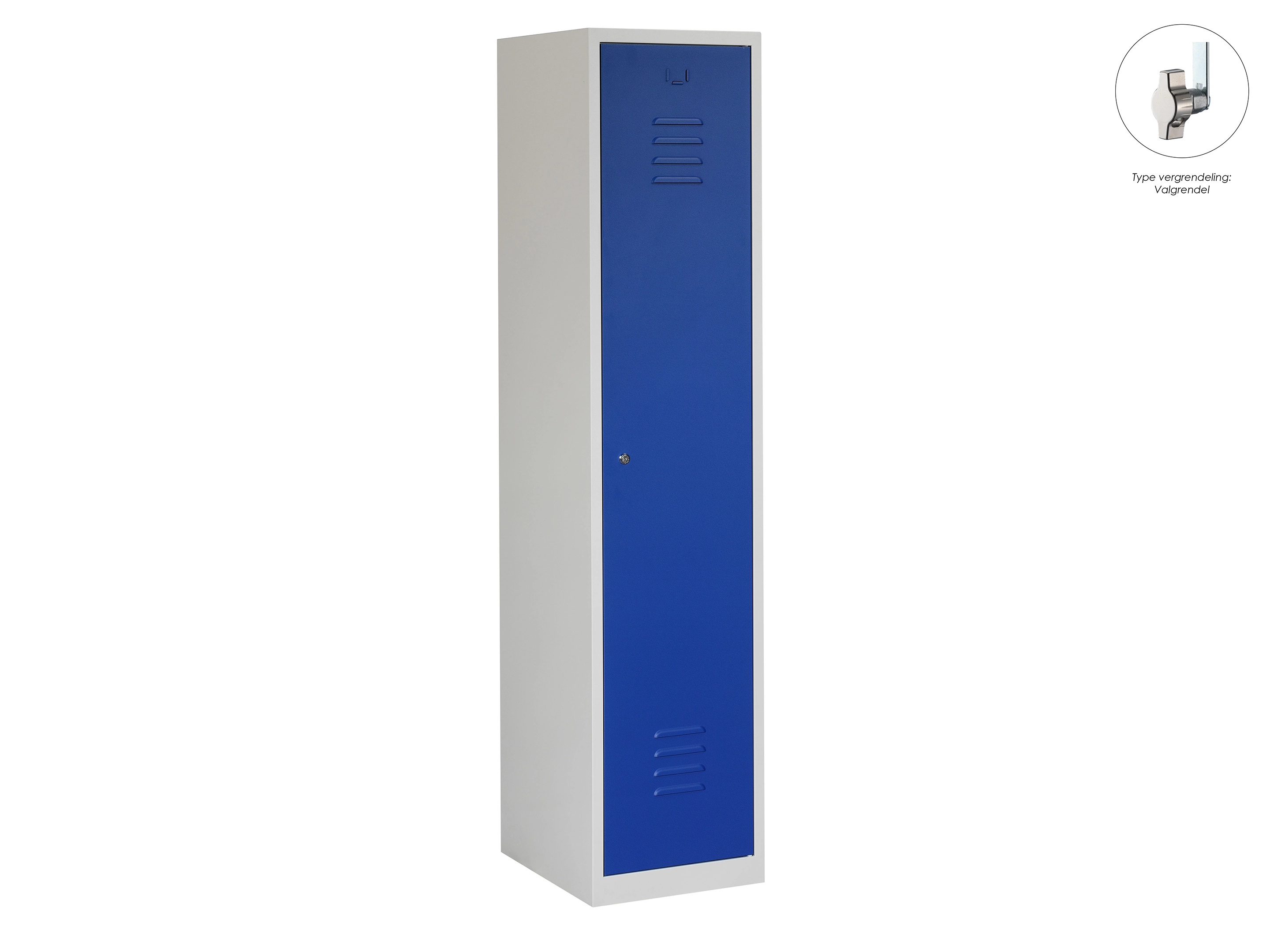 Type deuren: draaideur (ventilatiesleuven), type slot: valgrendelslot. Kleur romp: grijs (RAL7035), kleur deuren: blauw (RAL5010). Afmeting: 180x40x50 cm (HxBxD). Indeling: Legbord & kledingroede Aantal deuren: 1, aantal sleutels: geen.