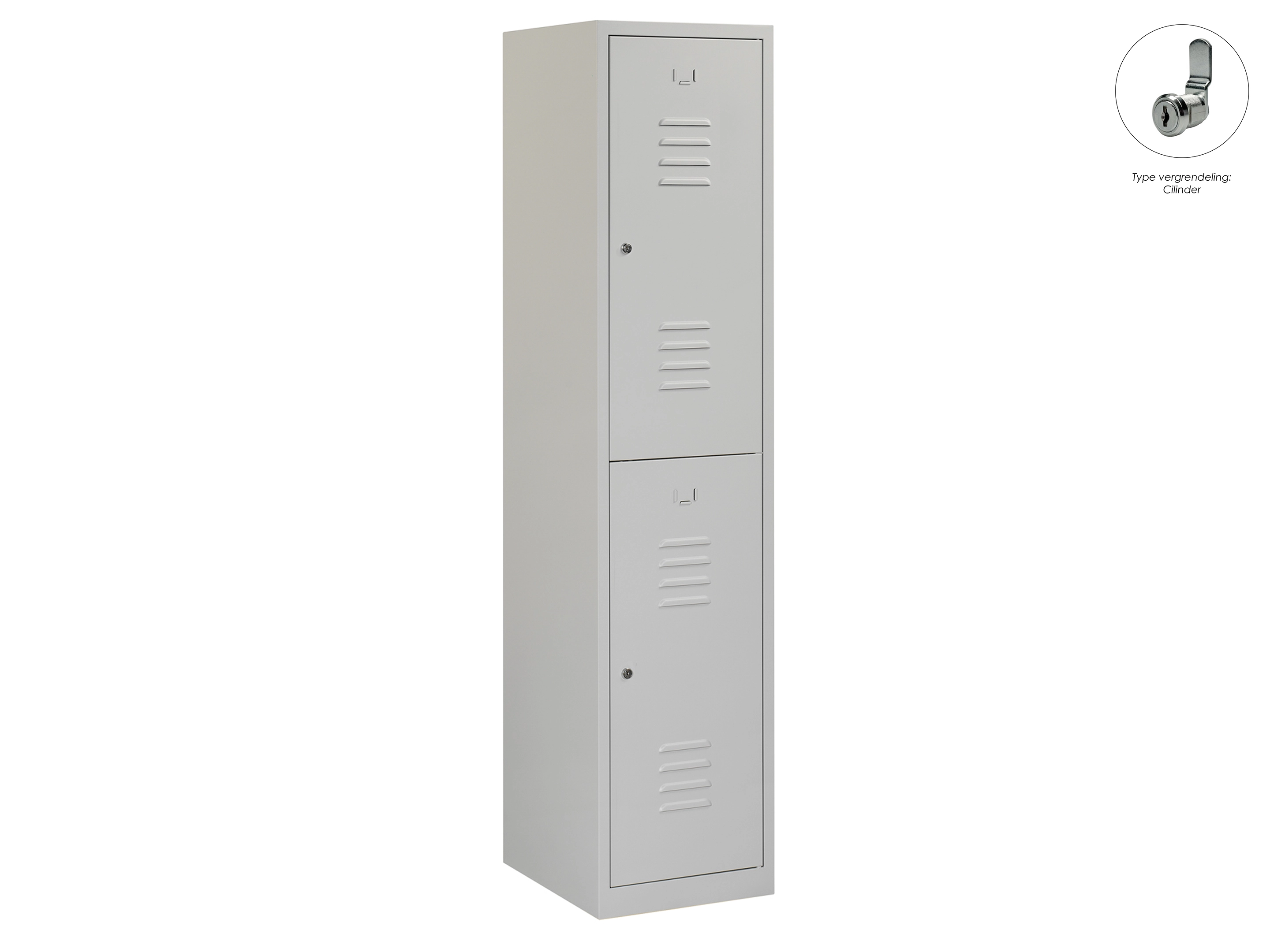 Type deuren: draaideur (ventilatiesleuven), type slot: cilinderslot. Kleur romp: grijs (RAL7035), kleur deuren: grijs (RAL7035). Afmeting: 180x40x50 cm (HxBxD). Indeling: Kledingroede Aantal deuren: 2, aantal sleutels: 2.