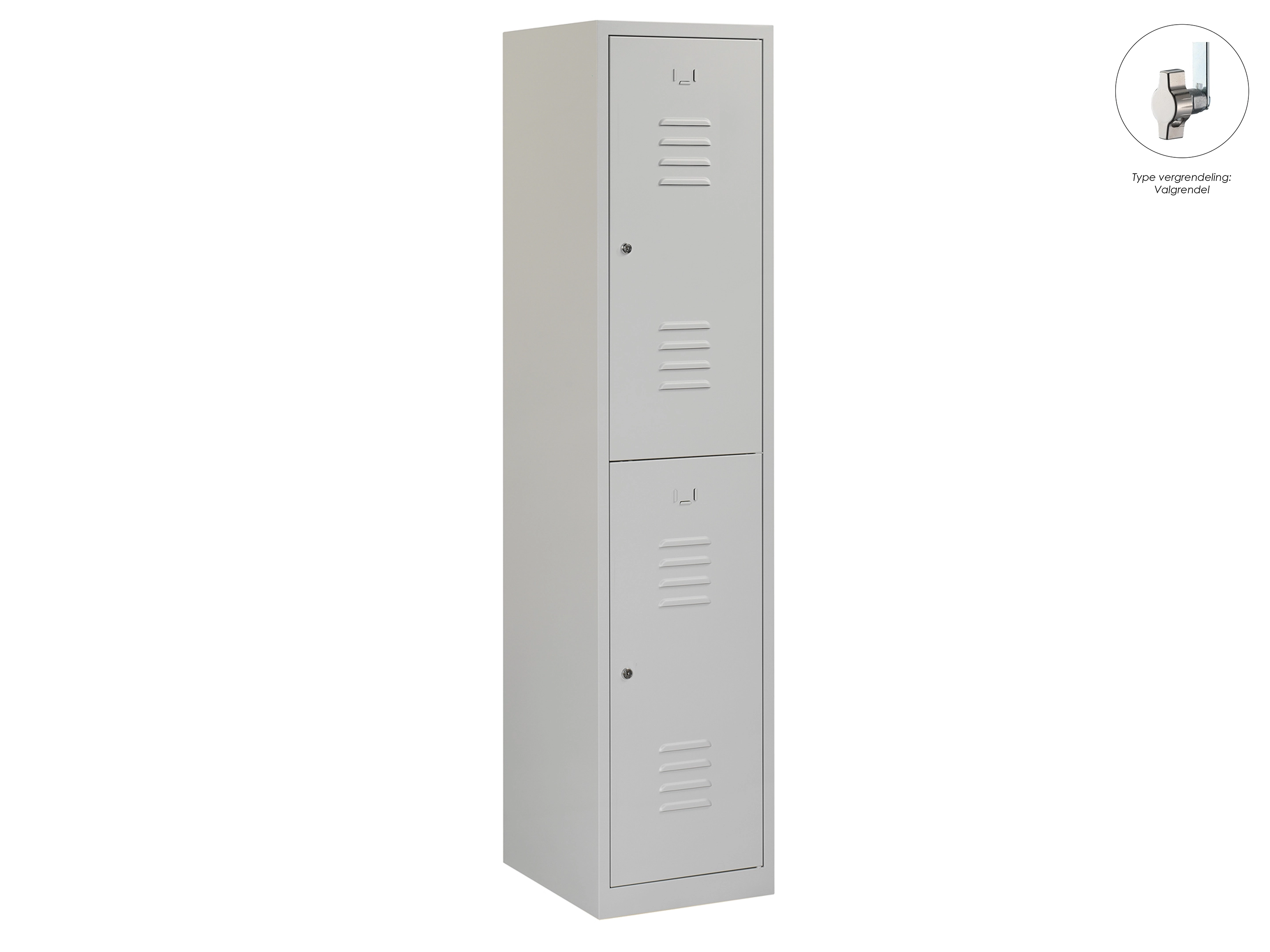 Type deuren: draaideur (ventilatiesleuven), type slot: valgrendelslot. Kleur romp: grijs (RAL7035), kleur deuren: grijs (RAL7035). Afmeting: 180x40x50 cm (HxBxD). Indeling: Kledingroede Aantal deuren: 2, aantal sleutels: geen.