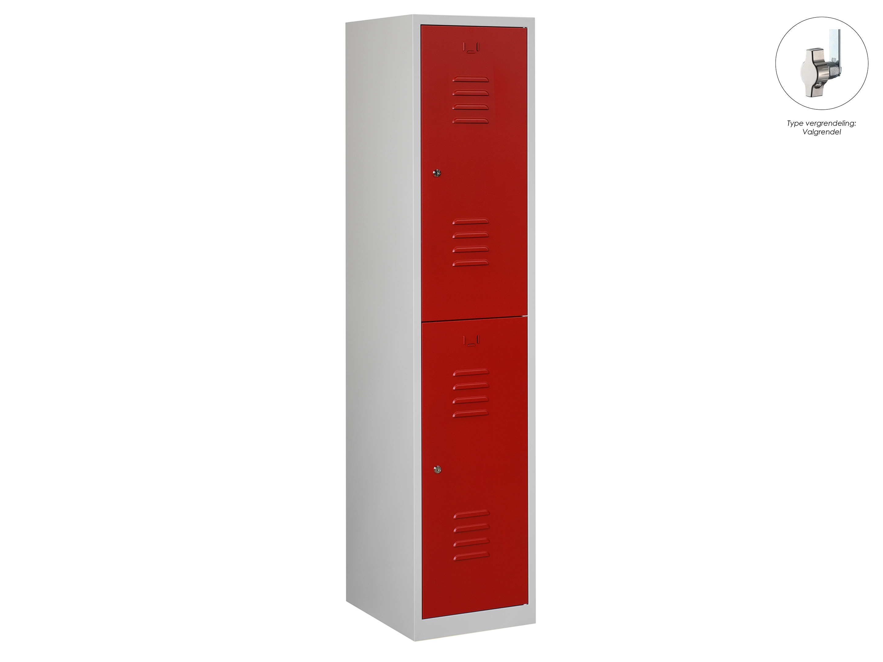 Type deuren: draaideur (ventilatiesleuven), type slot: valgrendelslot. Kleur romp: grijs (RAL7035), kleur deuren: rood (RAL3000). Afmeting: 180x40x50 cm (HxBxD). Indeling: Kledingroede Aantal deuren: 2, aantal sleutels: geen.