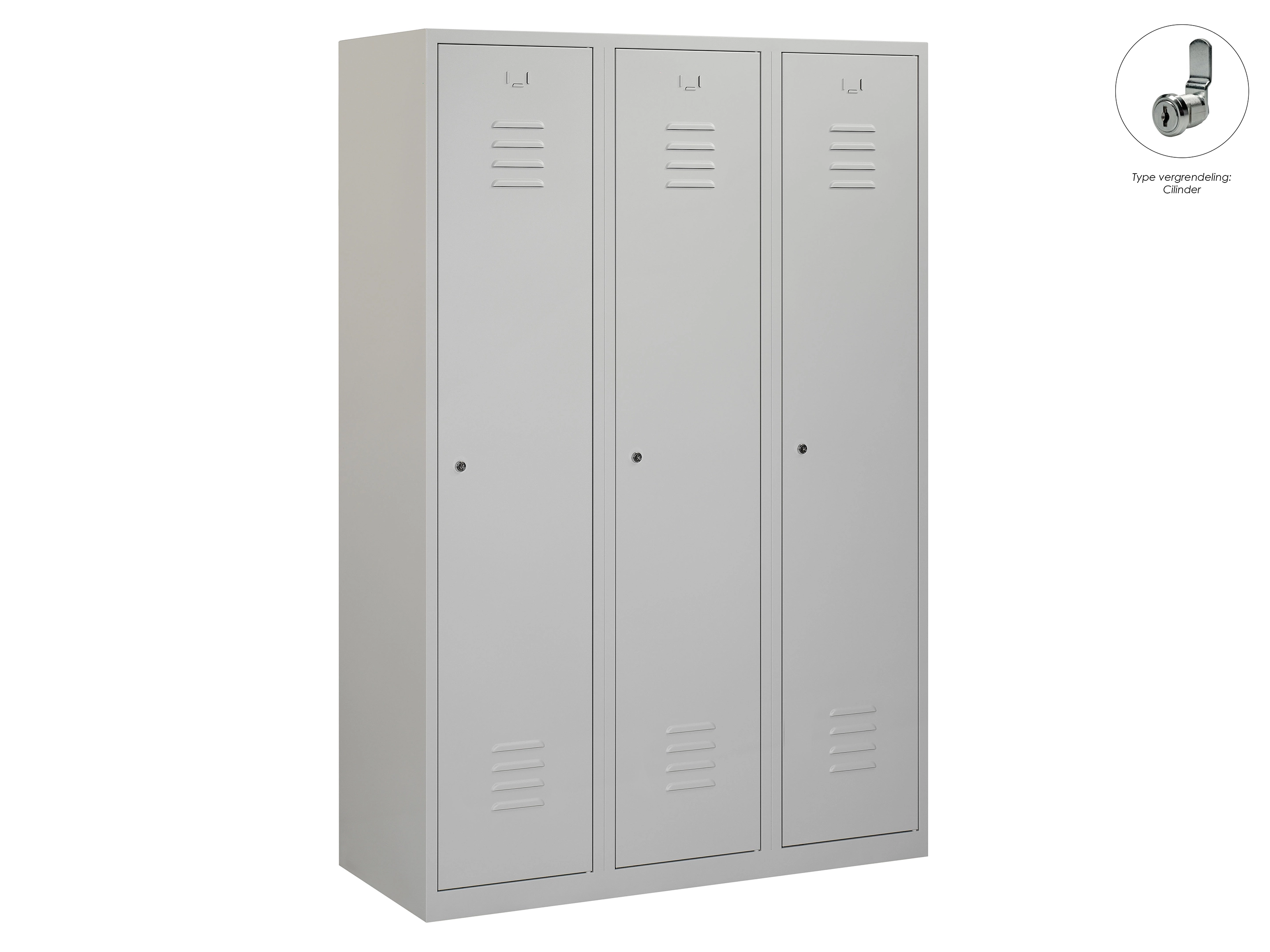 Type deuren: draaideur (ventilatiesleuven), type slot: cilinderslot. Kleur romp: grijs (RAL7035), kleur deuren: grijs (RAL7035). Afmeting: 180x120x50 cm (HxBxD). Indeling: Legbord & kledingroede Aantal deuren: 3, aantal sleutels: 2.