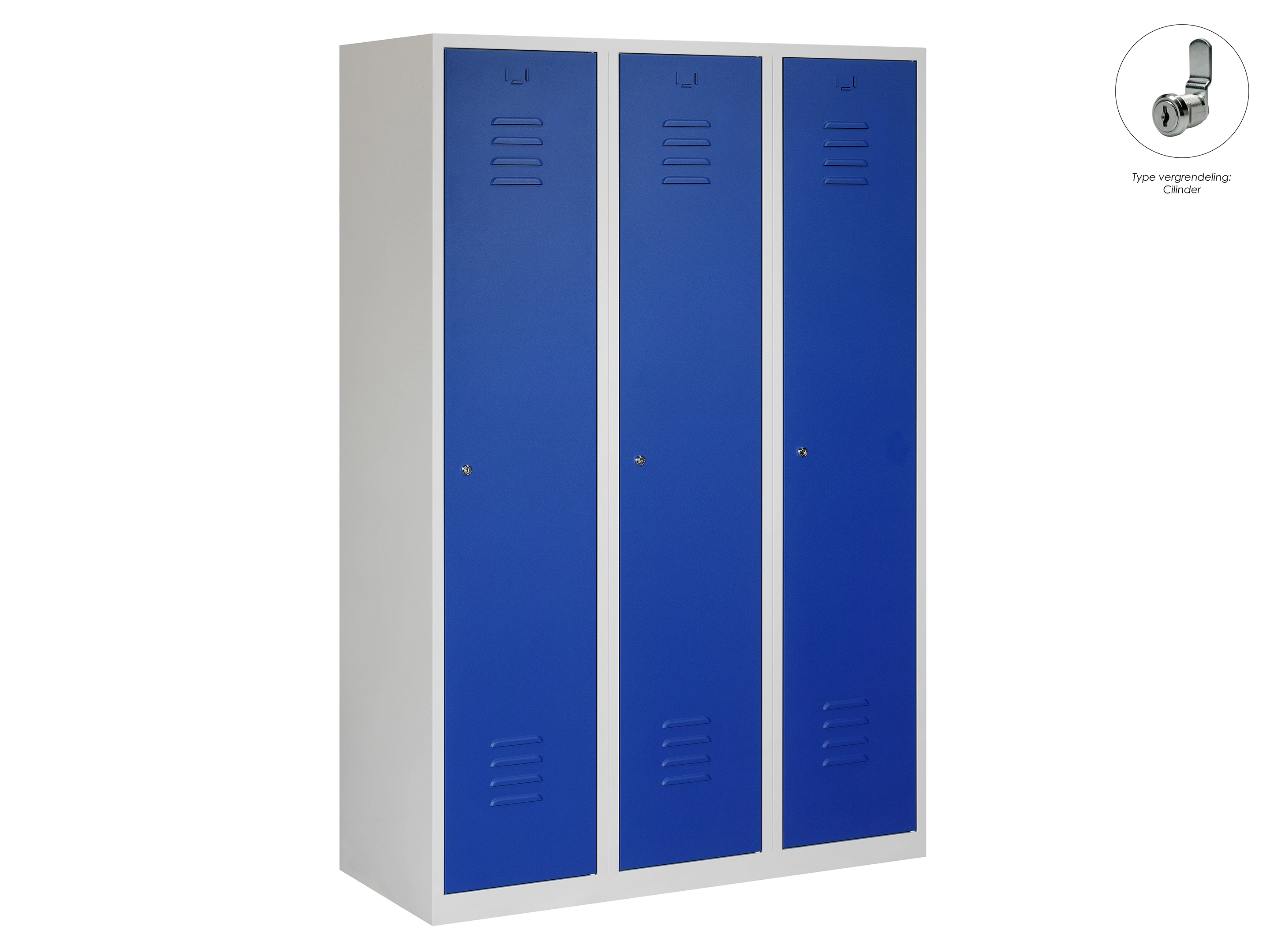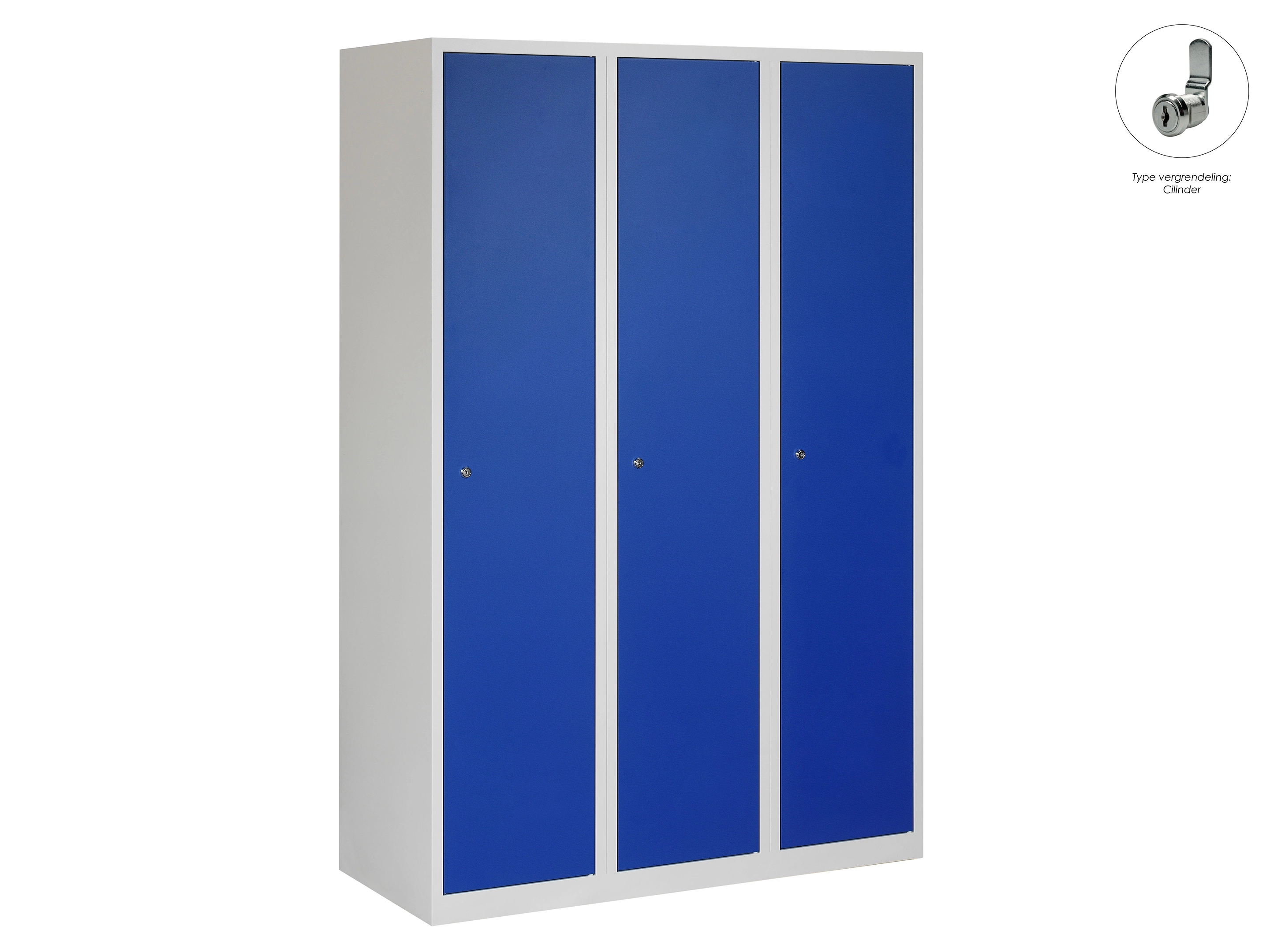 Type deuren: draaideur (ventilatiesleuven), type slot: cilinderslot. Kleur romp: grijs (RAL7035), kleur deuren: blauw (RAL5010). Afmeting: 180x120x50 cm (HxBxD). Indeling: Legbord & kledingroede Aantal deuren: 3, aantal sleutels: 2.