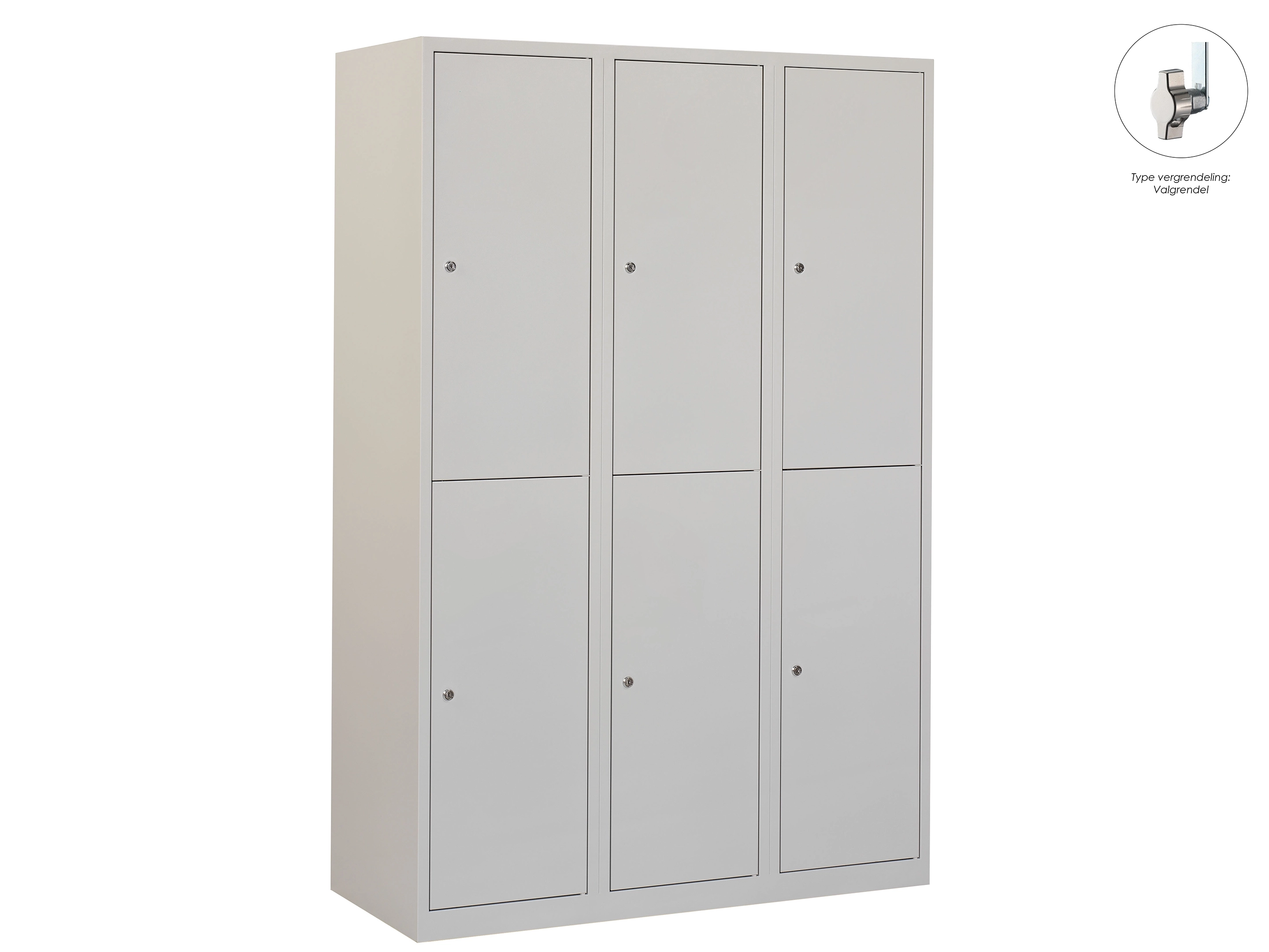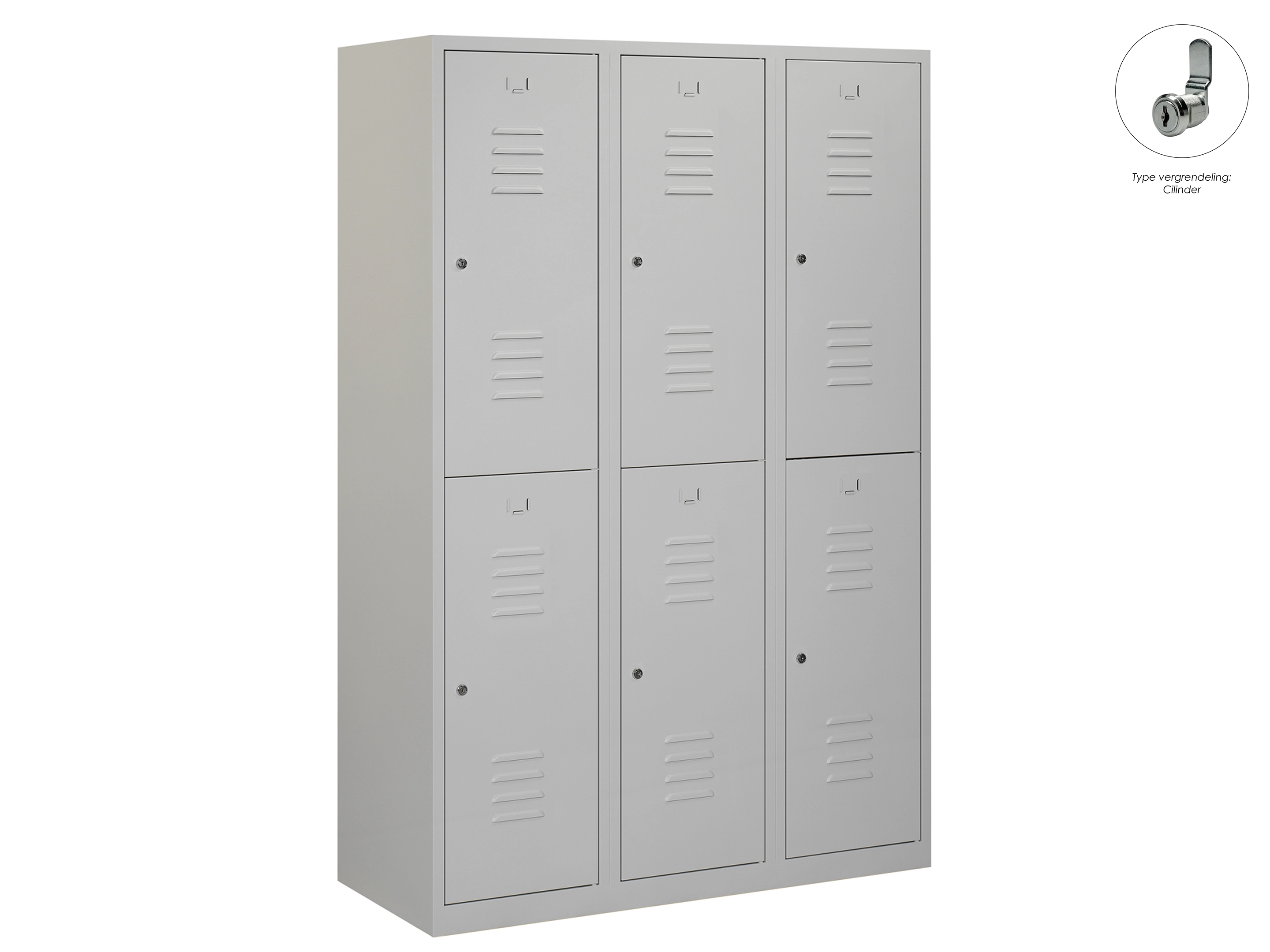 Type deuren: draaideur (ventilatiesleuven), type slot: cilinderslot. Kleur romp: grijs (RAL7035), kleur deuren: grijs (RAL7035). Afmeting: 180x120x50 cm (HxBxD). Indeling: Kledingroede Aantal deuren: 6, aantal sleutels: 2.