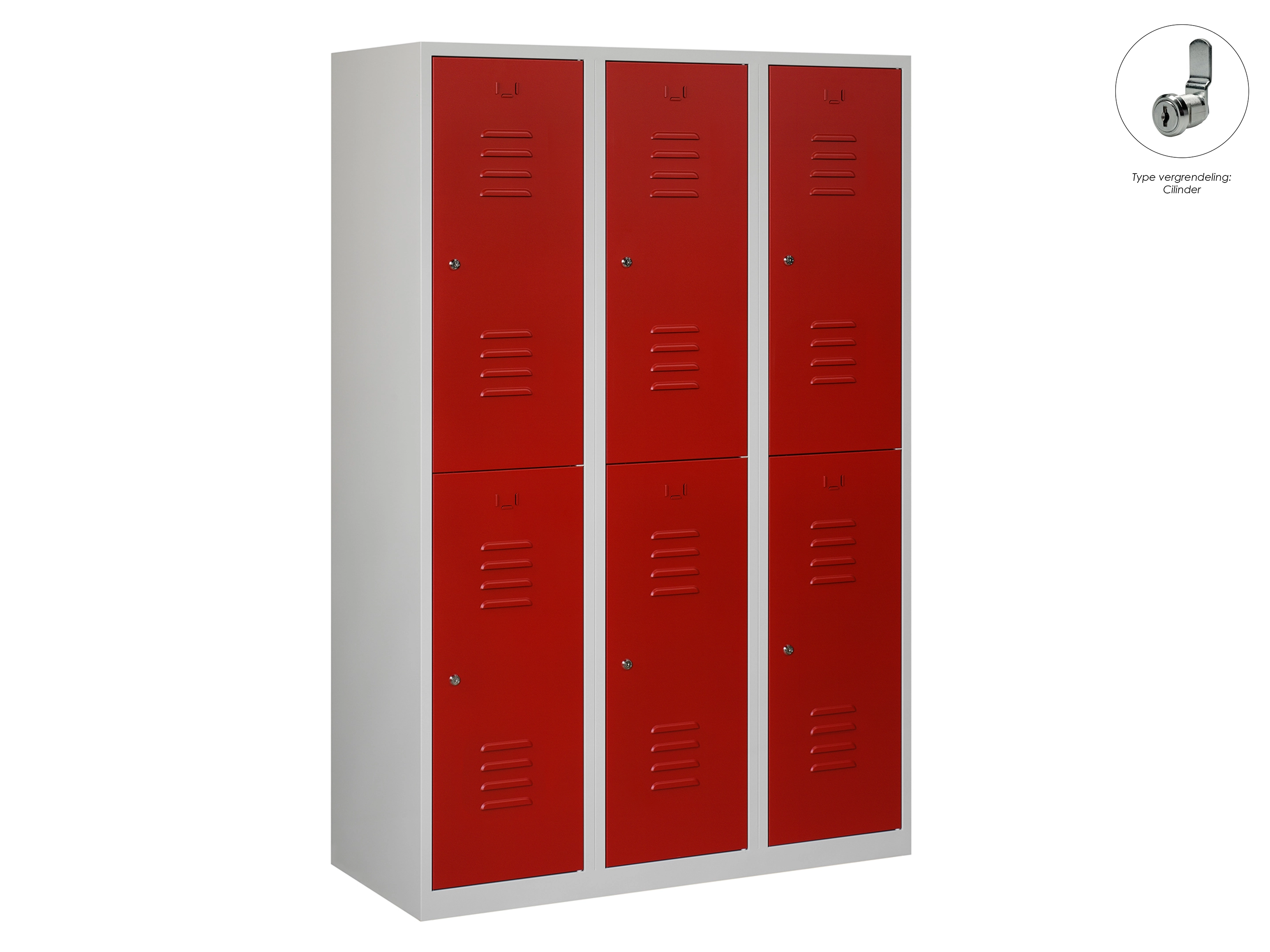 Type deuren: draaideur (glad zonder naamkaarthouder), type slot: cilinderslot. Kleur romp: grijs (RAL7035), kleur deuren: rood (RAL3000). Afmeting: 180x120x50 cm (HxBxD). Indeling: Kledingroede Aantal deuren: 6, aantal sleutels: 2.