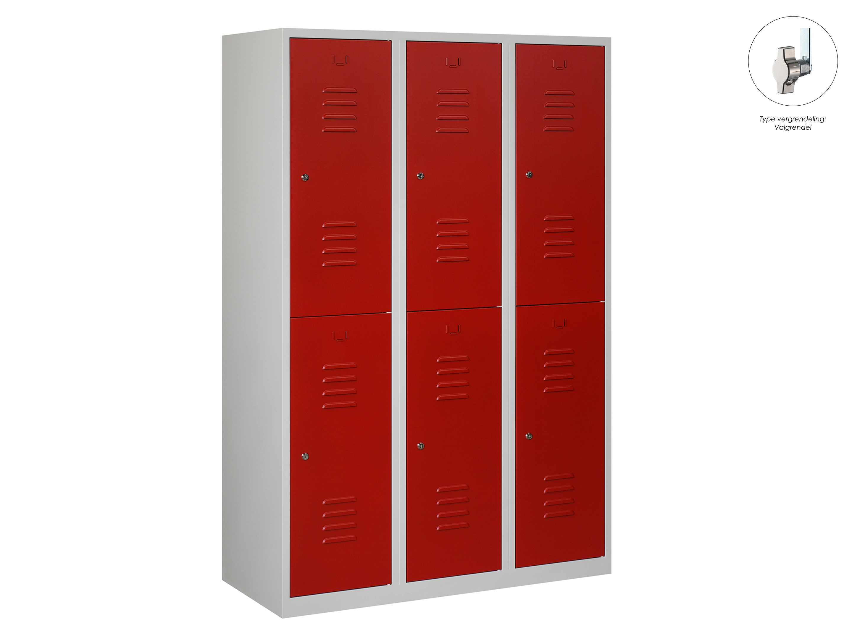 Type deuren: draaideur (ventilatiesleuven), type slot: valgrendelslot. Kleur romp: grijs (RAL7035), kleur deuren: rood (RAL3000). Afmeting: 180x120x50 cm (HxBxD). Indeling: Kledingroede Aantal deuren: 6, aantal sleutels: geen.