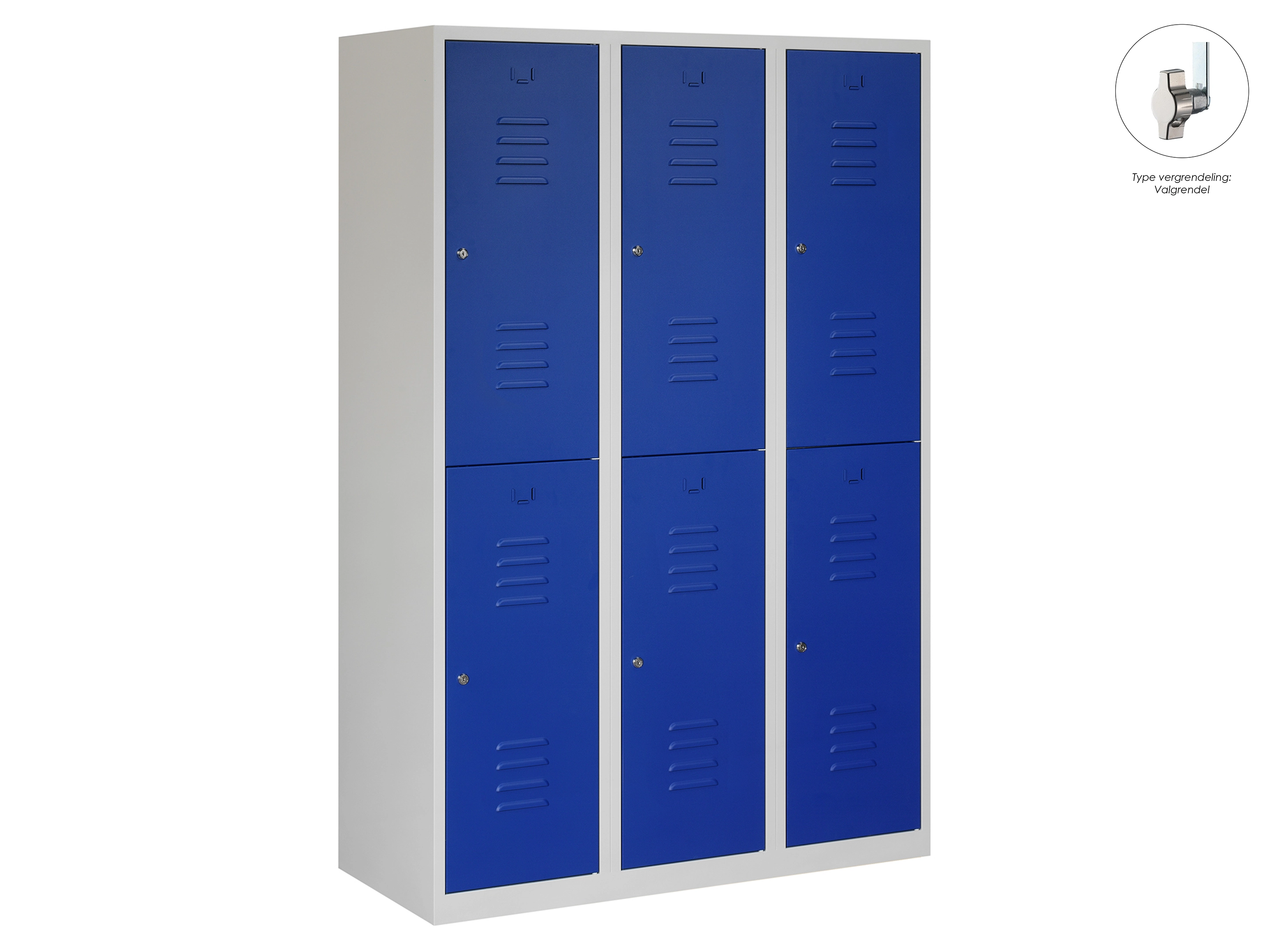 Type deuren: draaideur (glad zonder naamkaarthouder), type slot: cilinderslot. Kleur romp: grijs (RAL7035), kleur deuren: blauw (RAL5010). Afmeting: 180x120x50 cm (HxBxD). Indeling: Kledingroede Aantal deuren: 6, aantal sleutels: 2.