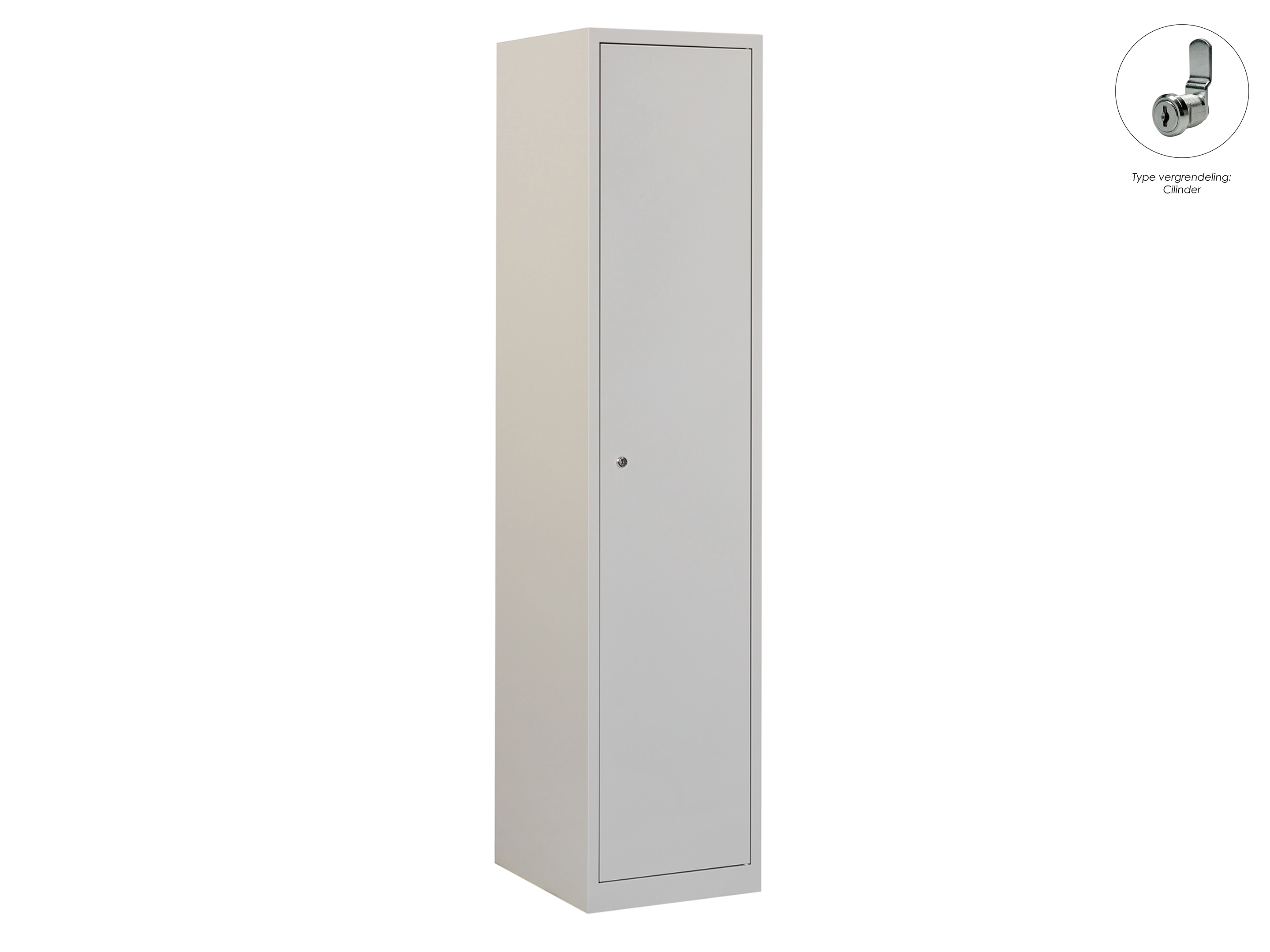 Type deuren: draaideur (glad zonder naamkaarthouder), type slot: cilinderslot. Kleur romp: grijs (RAL7035), kleur deuren: grijs (RAL7035). Afmeting: 180x40x50 cm (HxBxD). Indeling: Legbord & kledingroede Aantal deuren: 1, aantal sleutels: 2.