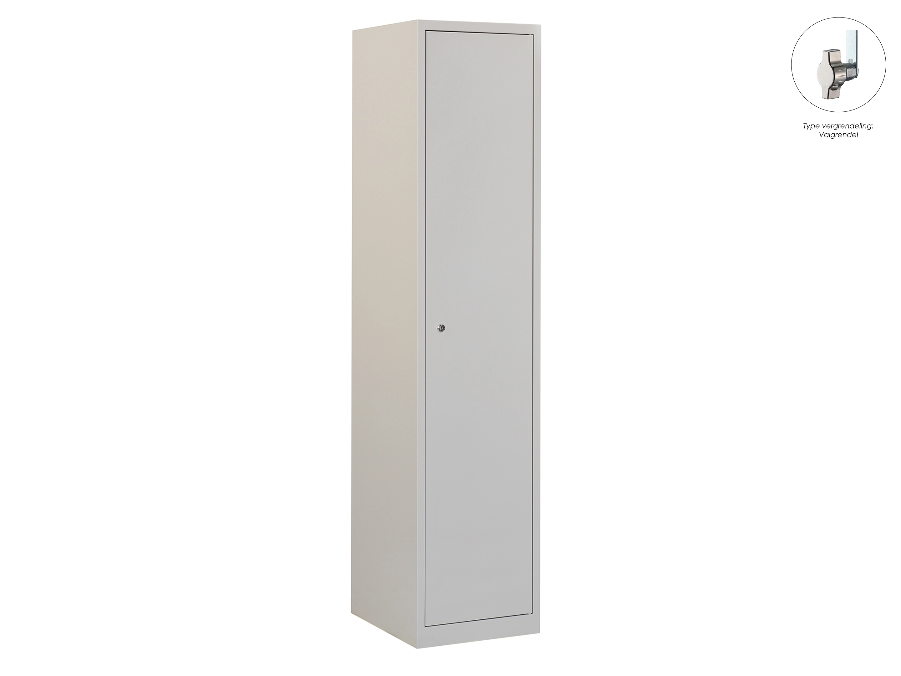 Type deuren: draaideur (glad zonder naamkaarthouder), type slot: valgrendelslot. Kleur romp: grijs (RAL7035), kleur deuren: grijs (RAL7035). Afmeting: 180x40x50 cm (HxBxD). Indeling: Legbord & kledingroede Aantal deuren: 1, aantal sleutels: geen.