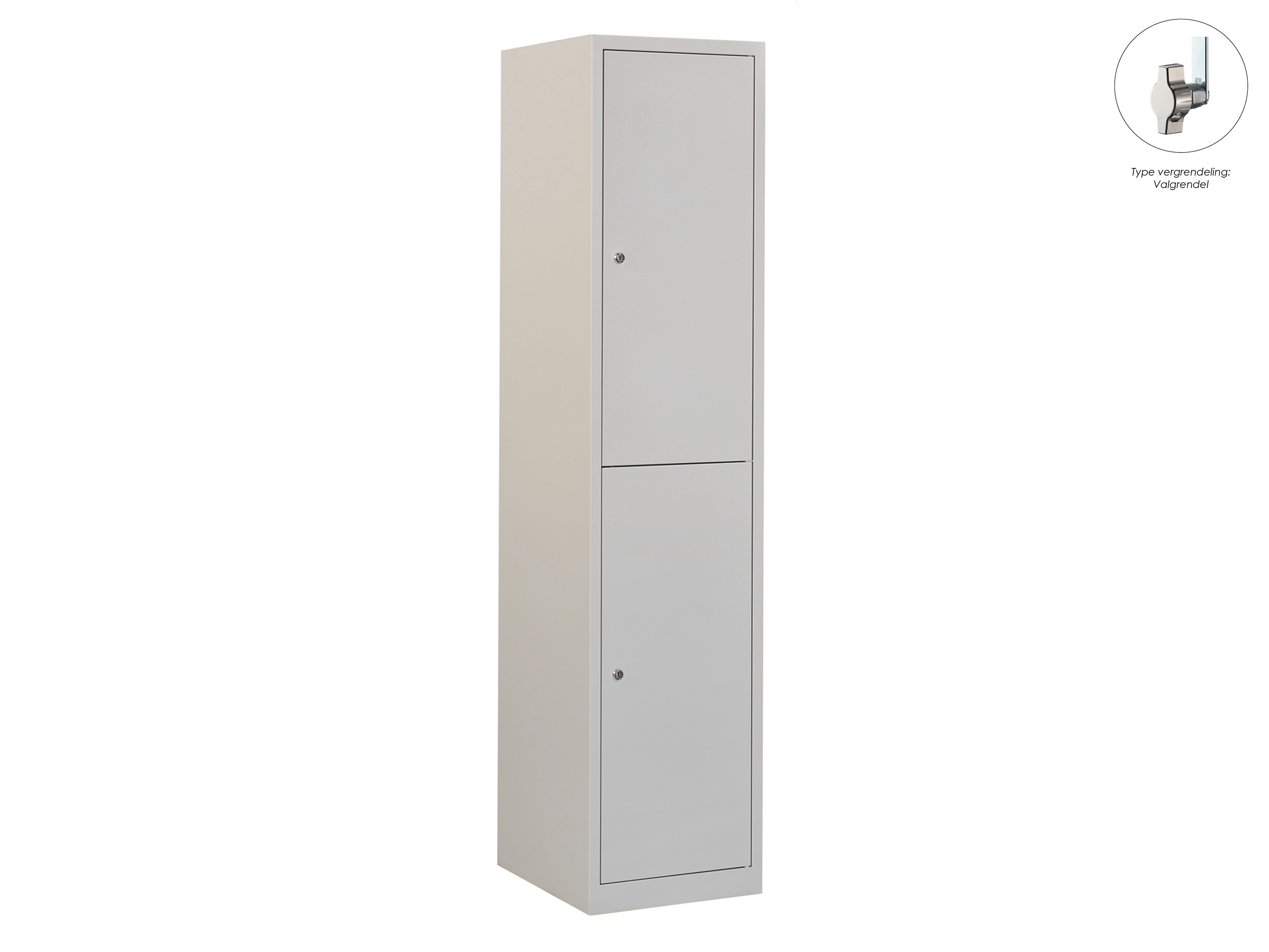 Type deuren: draaideur (glad zonder naamkaarthouder), type slot: valgrendelslot. Kleur romp: grijs (RAL7035), kleur deuren: grijs (RAL7035). Afmeting: 180x40x50 cm (HxBxD). Indeling: Kledingroede Aantal deuren: 2, aantal sleutels: geen.