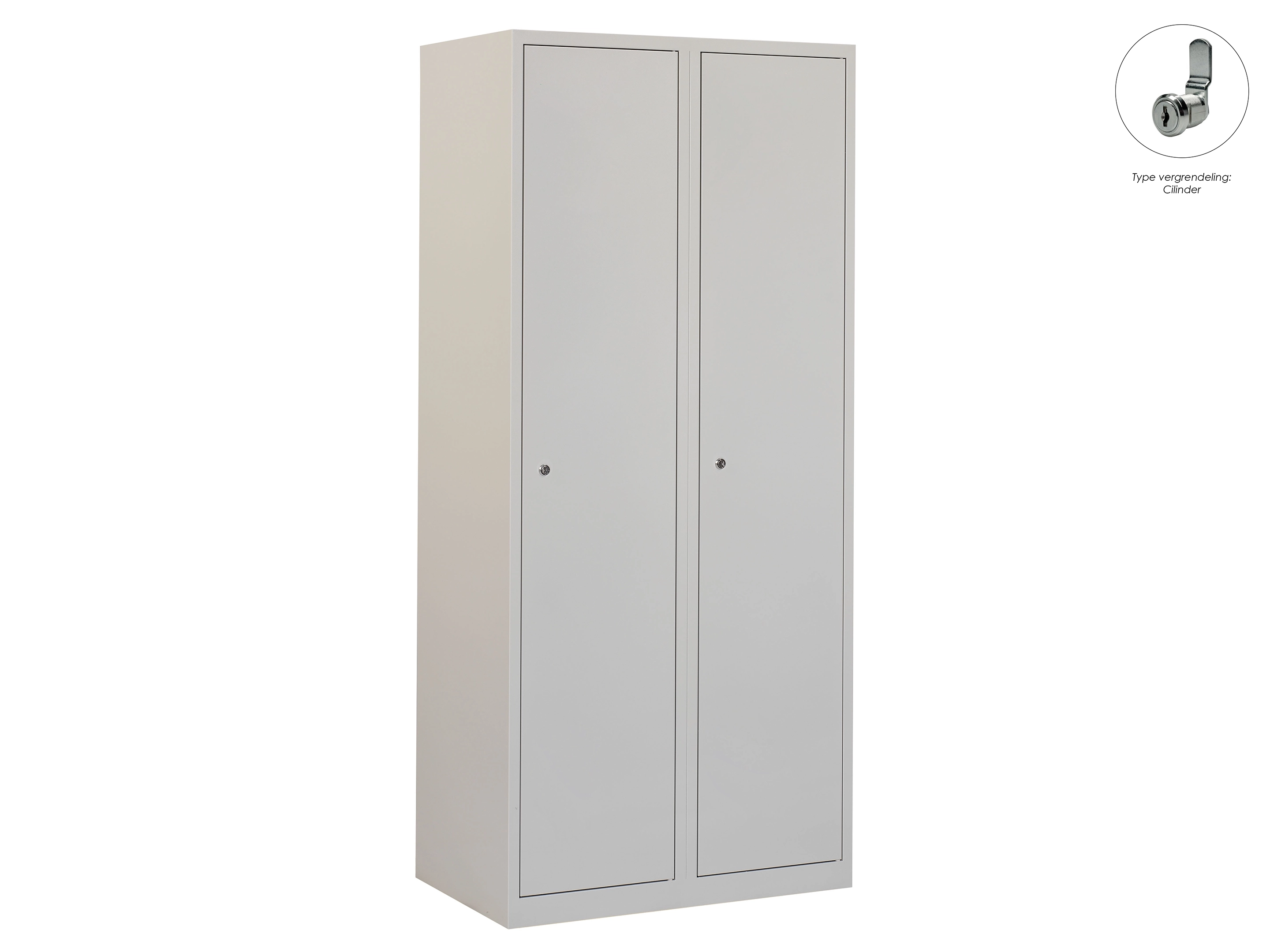 Type deuren: draaideur (glad zonder naamkaarthouder), type slot: cilinderslot. Kleur romp: grijs (RAL7035), kleur deuren: grijs (RAL7035). Afmeting: 180x80x50 cm (HxBxD). Indeling: Legbord & kledingroede Aantal deuren: 2, aantal sleutels: 2.