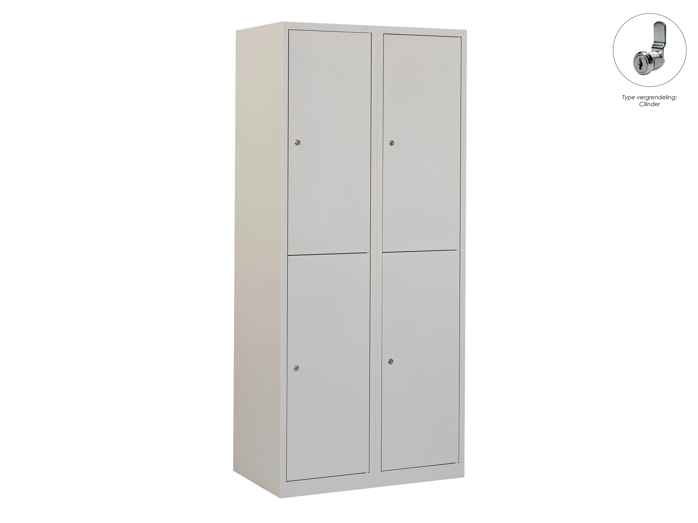 Type deuren: draaideur (ventilatiesleuven), type slot: cilinderslot. Kleur romp: grijs (RAL7035), kleur deuren: grijs (RAL7035). Afmeting: 180x80x50 cm (HxBxD). Indeling: Kledingroede Aantal deuren: 4, aantal sleutels: 2.
