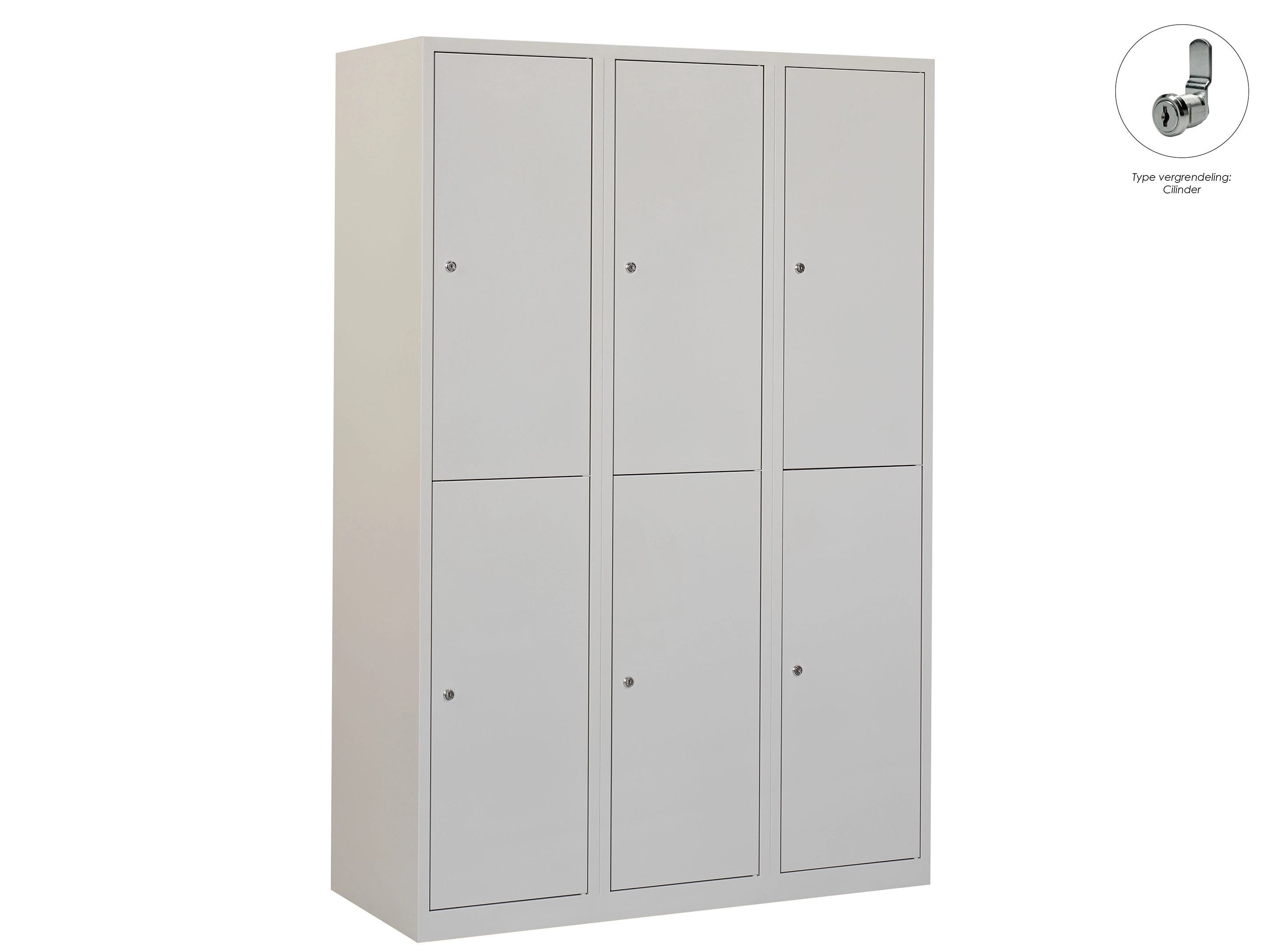 Type deuren: draaideur (glad zonder naamkaarthouder), type slot: cilinderslot. Kleur romp: grijs (RAL7035), kleur deuren: grijs (RAL7035). Afmeting: 180x120x50 cm (HxBxD). Indeling: Kledingroede Aantal deuren: 6, aantal sleutels: 2.