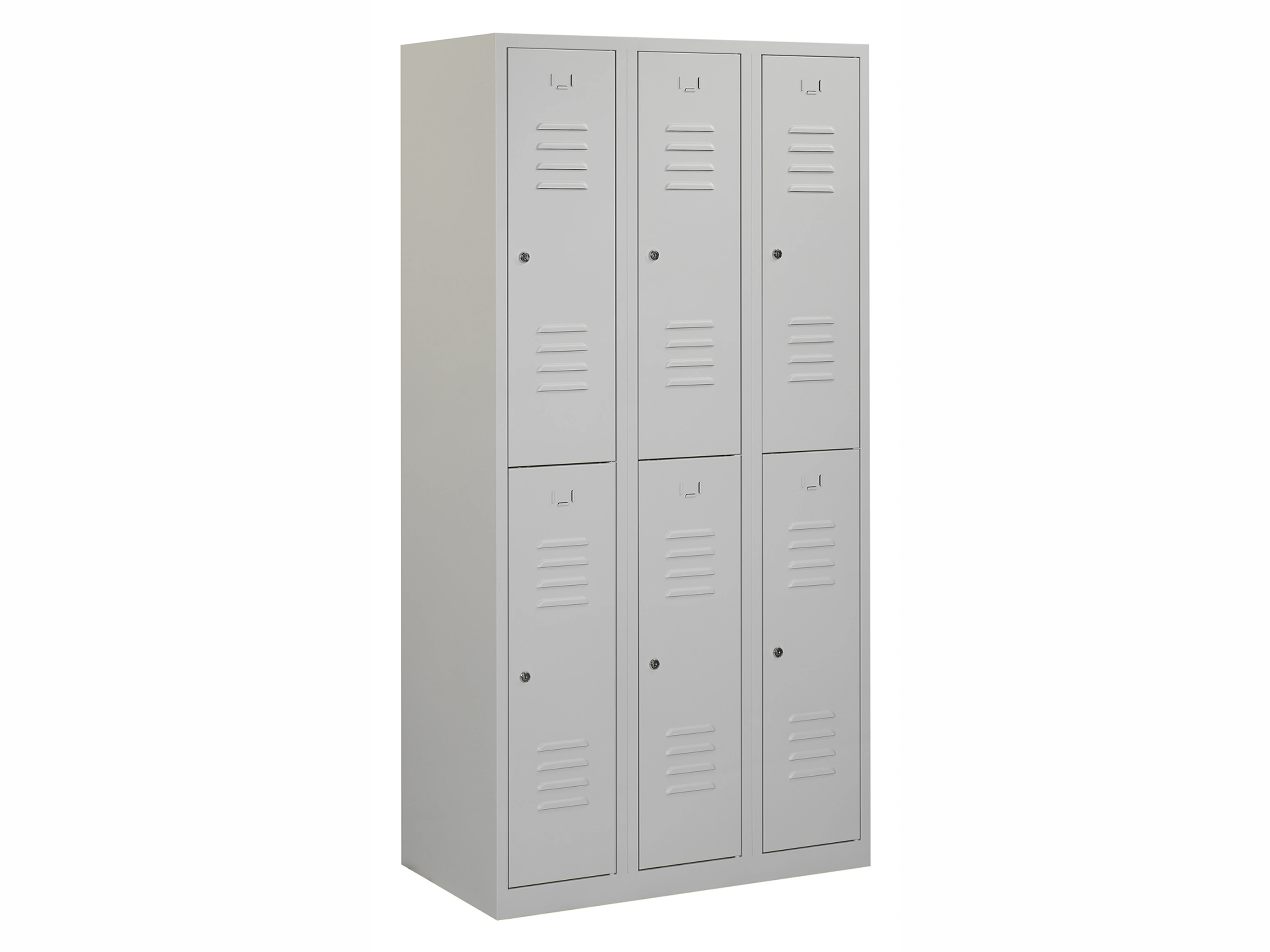 Type deuren: draaideur (ventilatiesleuven), type slot: valgrendelslot. Kleur romp: grijs (RAL7035), kleur deuren: grijs (RAL7035). Afmeting: 180x90x50 cm (HxBxD). Indeling: Kledingroede Aantal deuren: 6, aantal sleutels: geen.