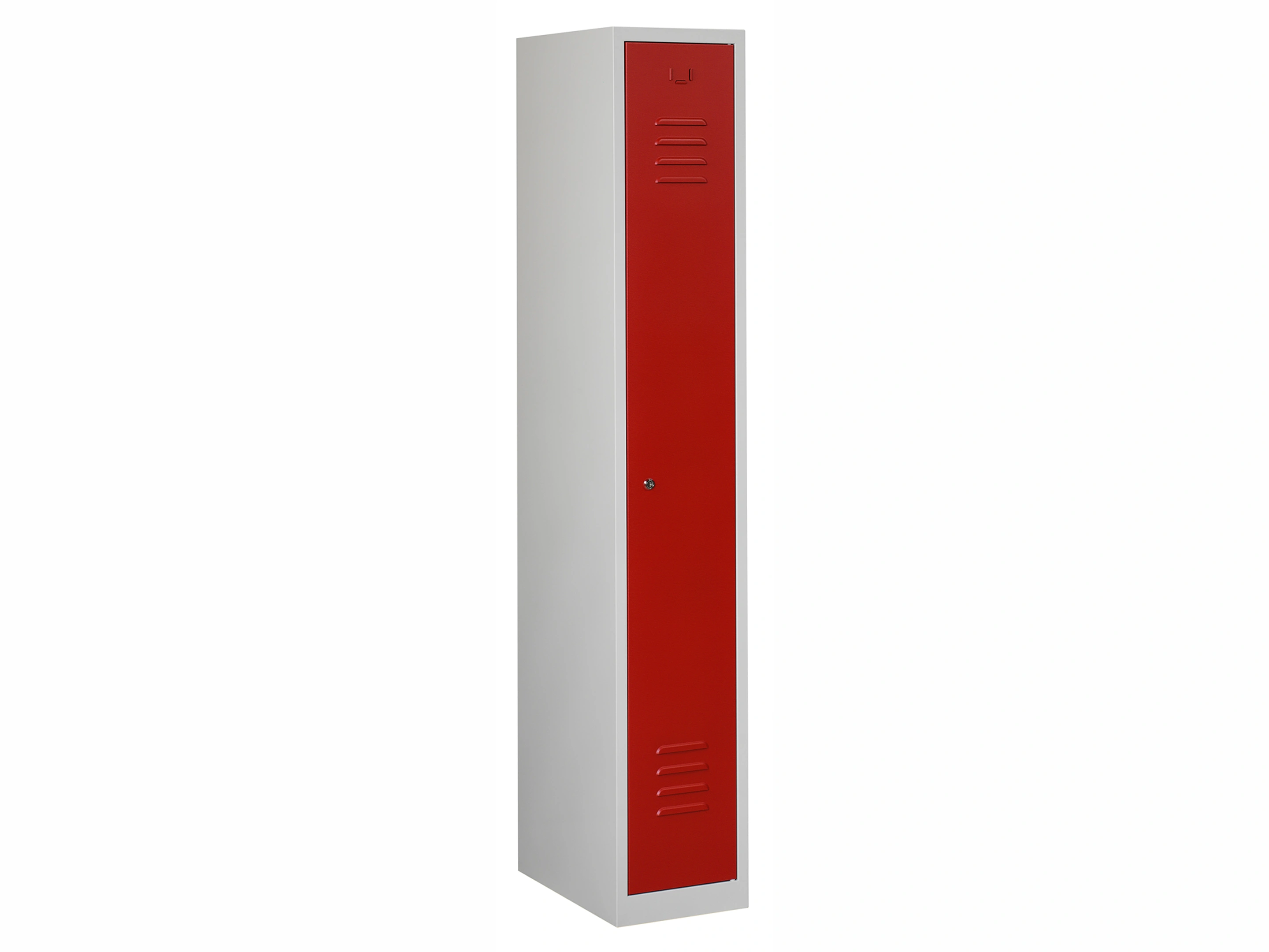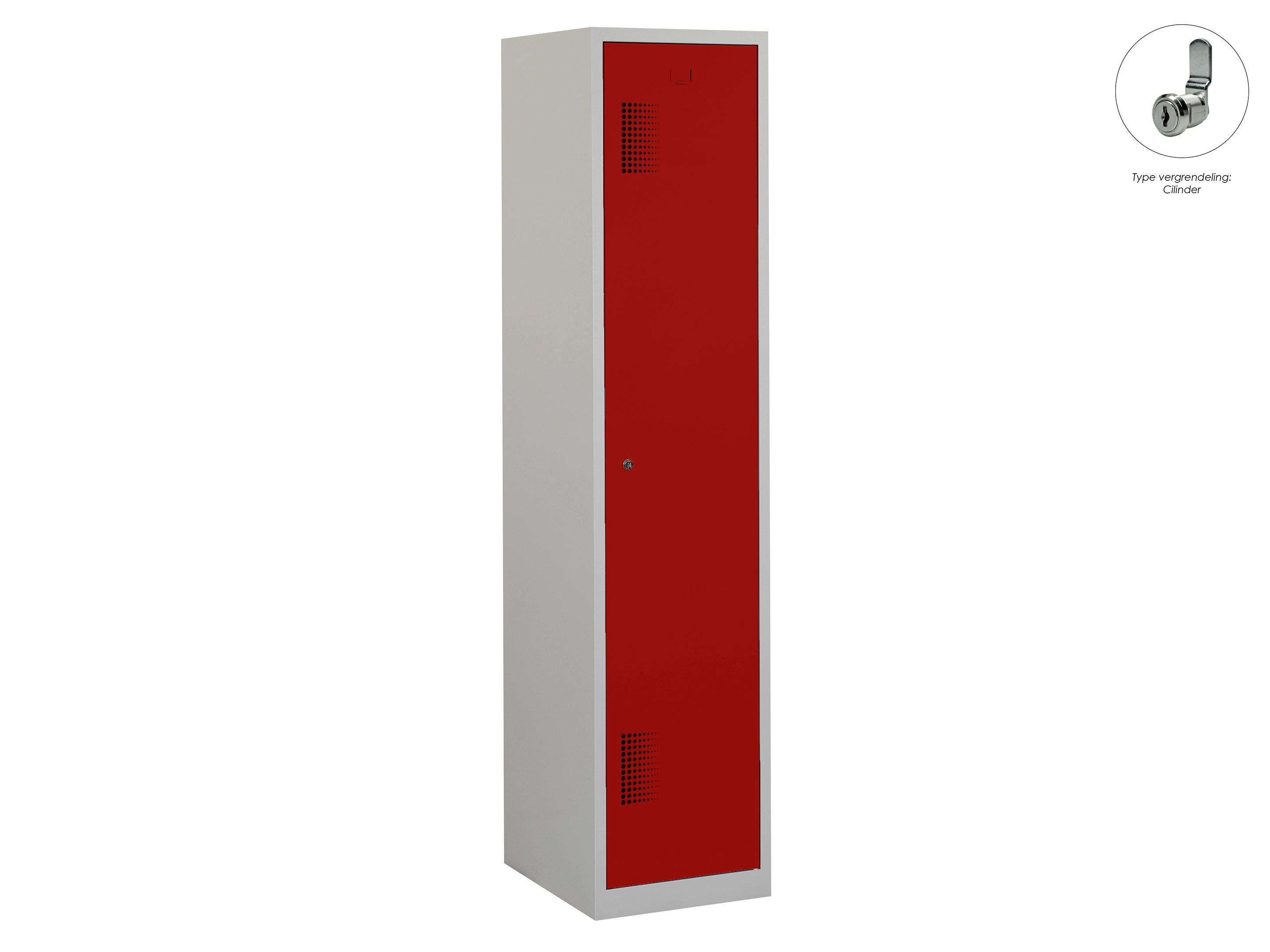 Type deuren: draaideur (ventilatiesleuven), type slot: cilinderslot. Kleur romp: grijs (RAL7035), kleur deuren: rood (RAL3000). Afmeting: 180x30x50 cm (HxBxD). Indeling: Legbord & kledingroede Aantal deuren: 1, aantal sleutels: 2.