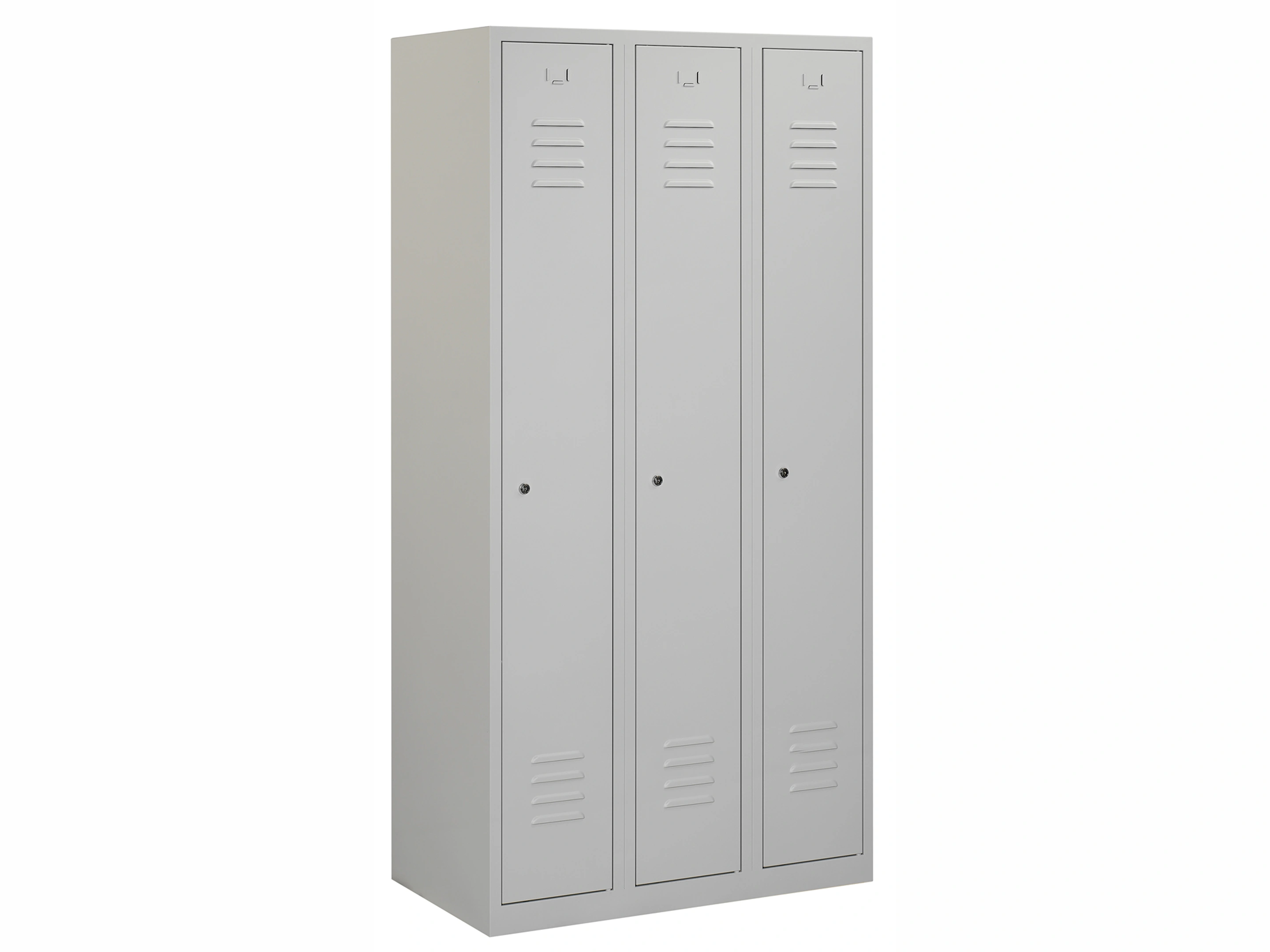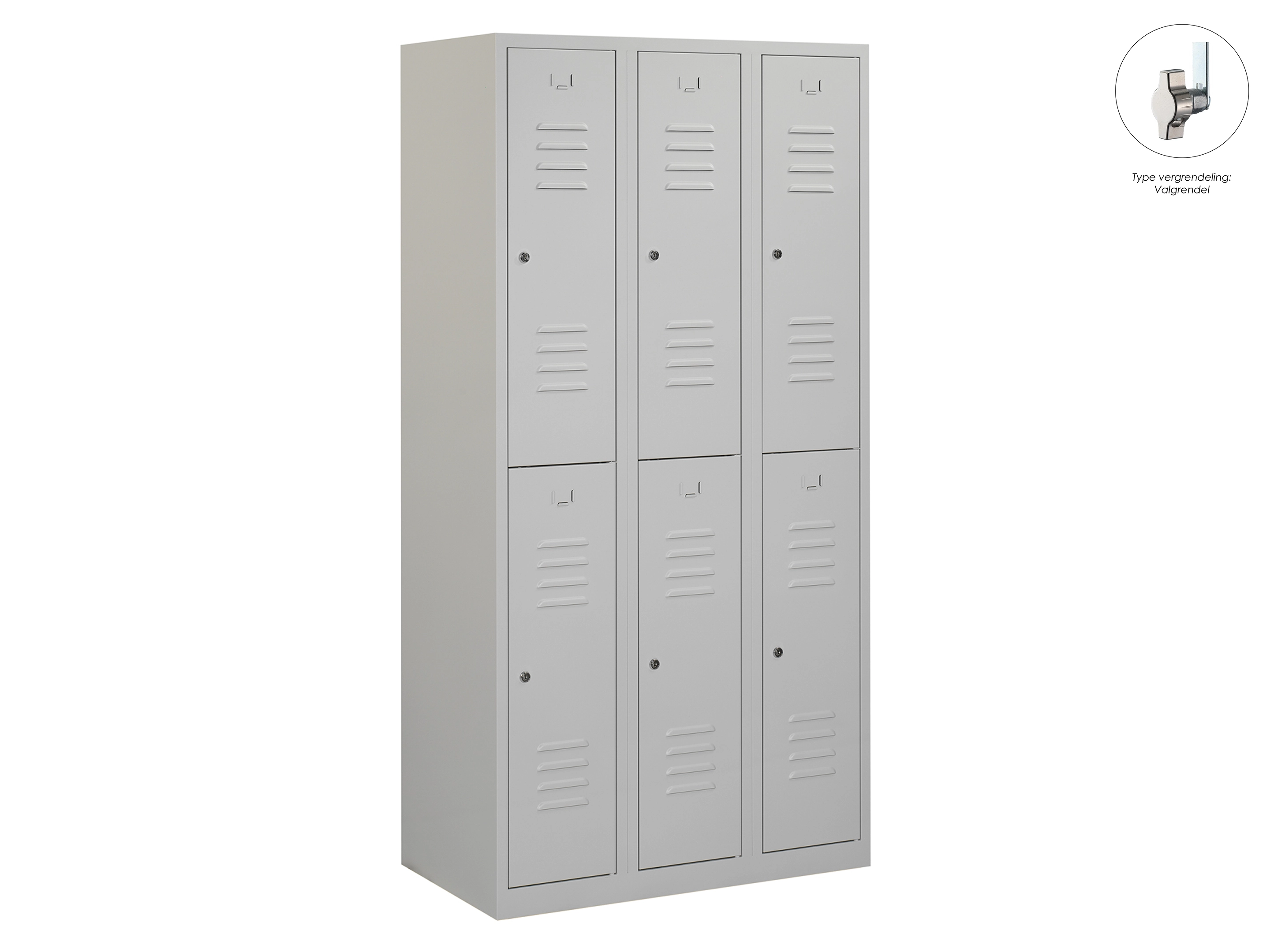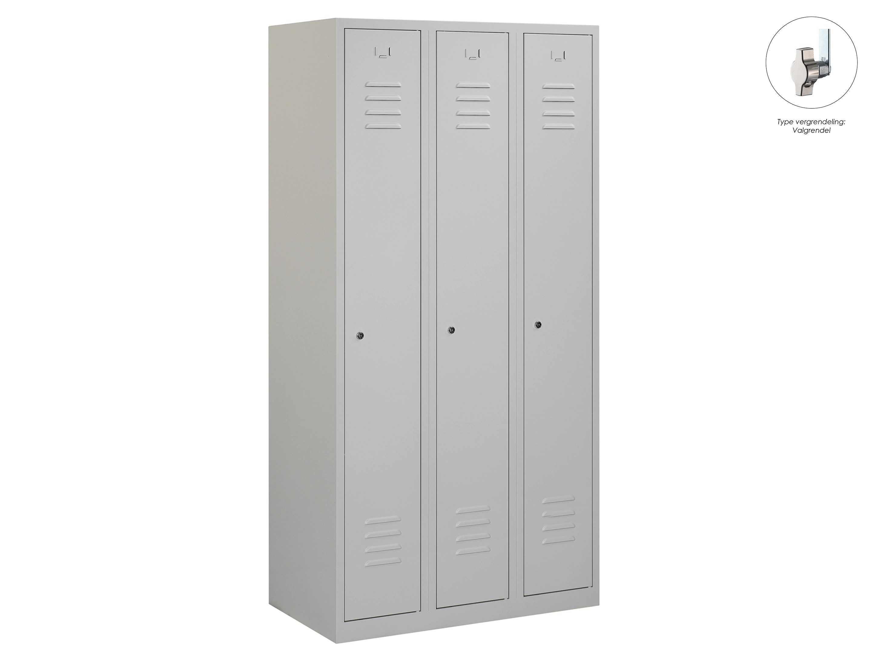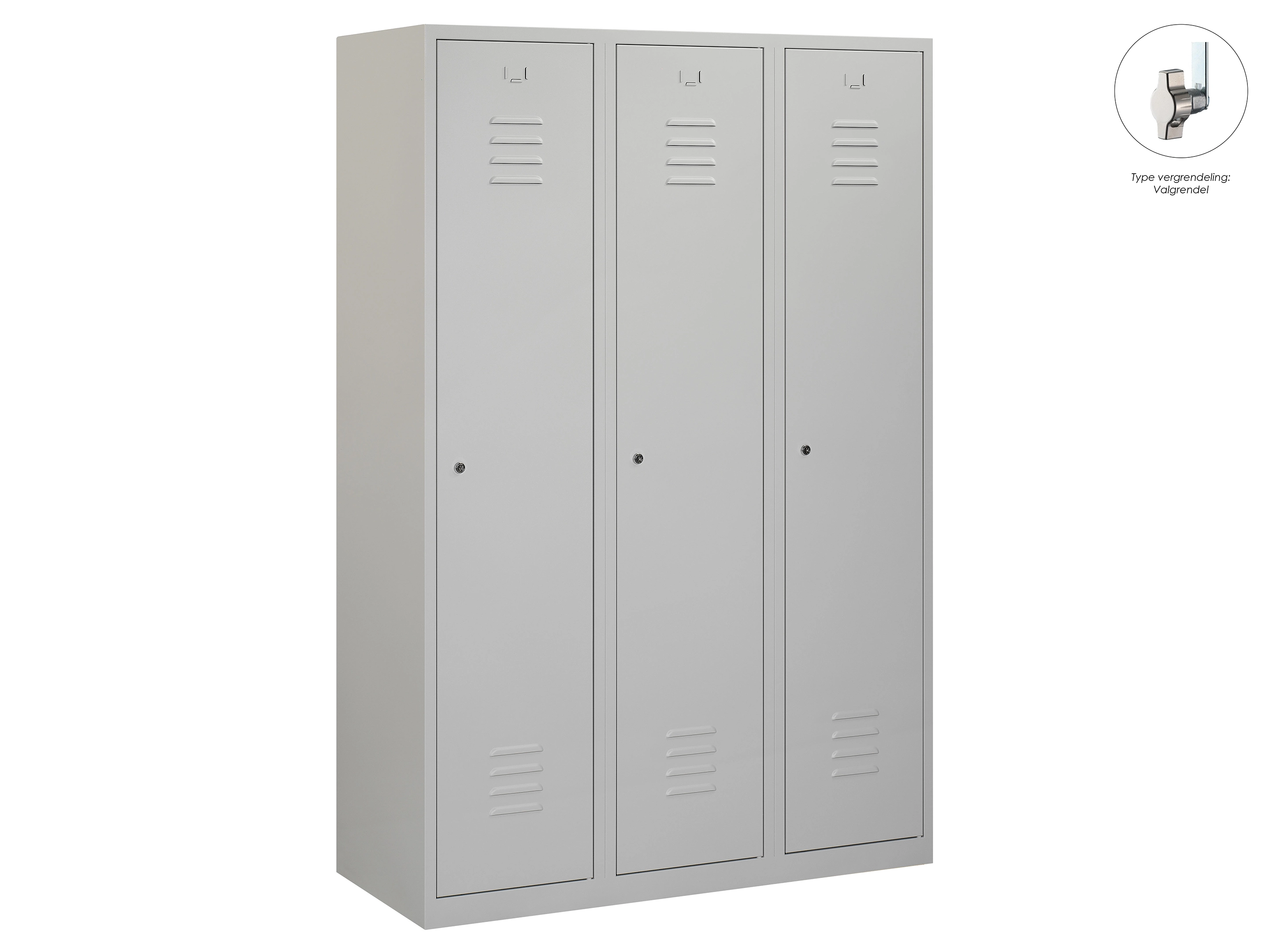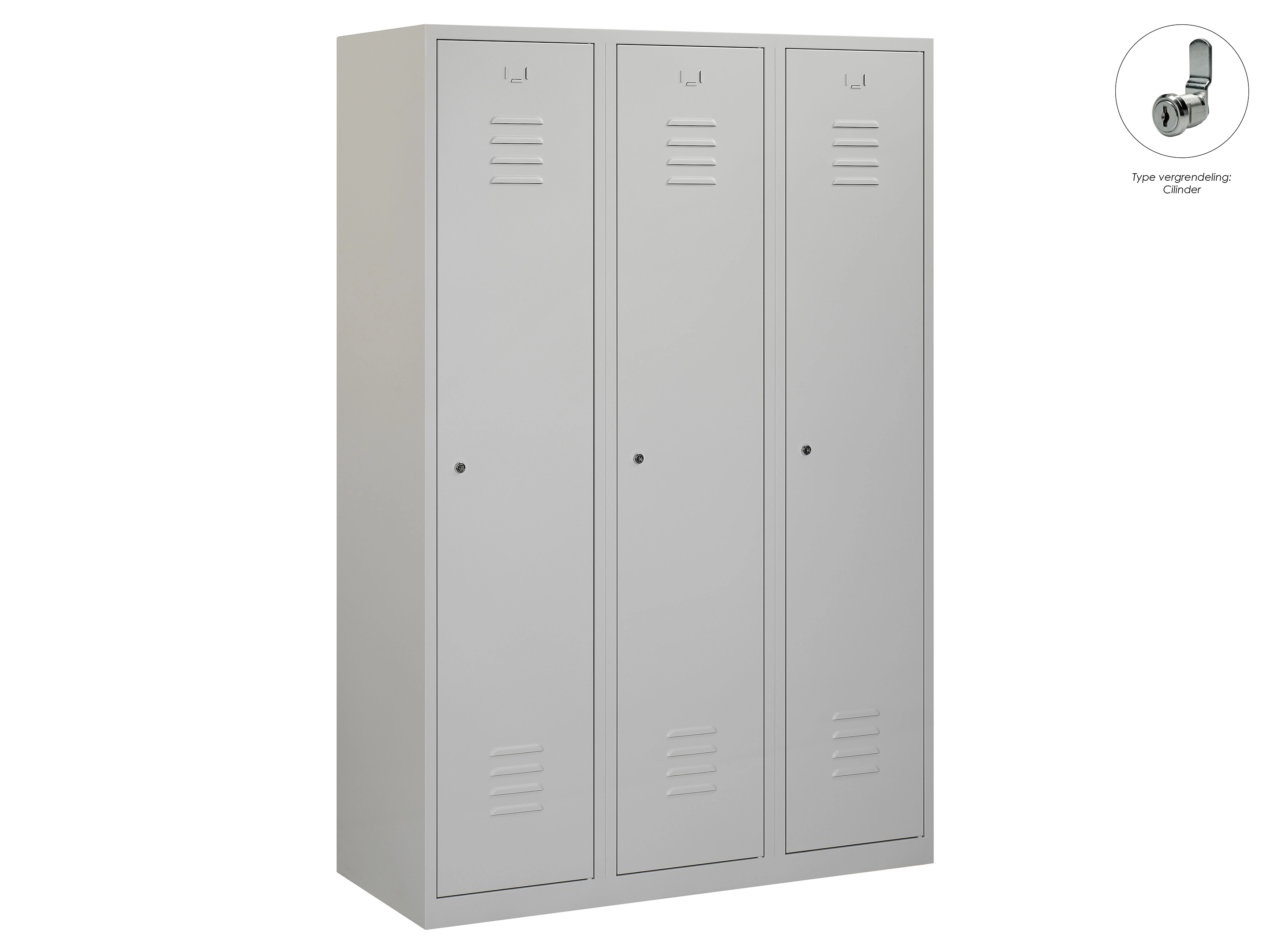 Type deuren: draaideur (ventilatiesleuven), type slot: cilinderslot. Kleur romp: grijs (RAL7035), kleur deuren: grijs (RAL7035). Afmeting: 180x90x50 cm (HxBxD). Indeling: Legbord & kledingroede Aantal deuren: 3, aantal sleutels: 2.