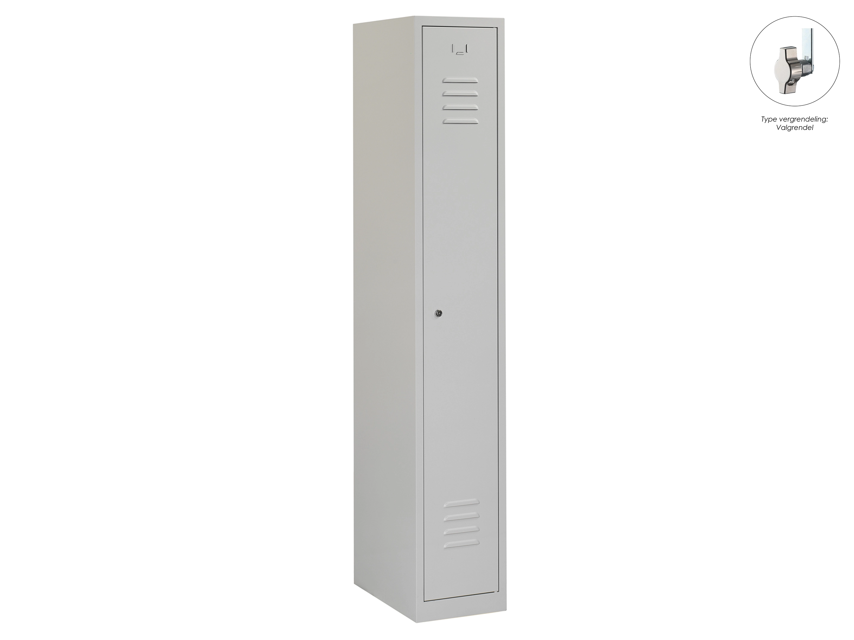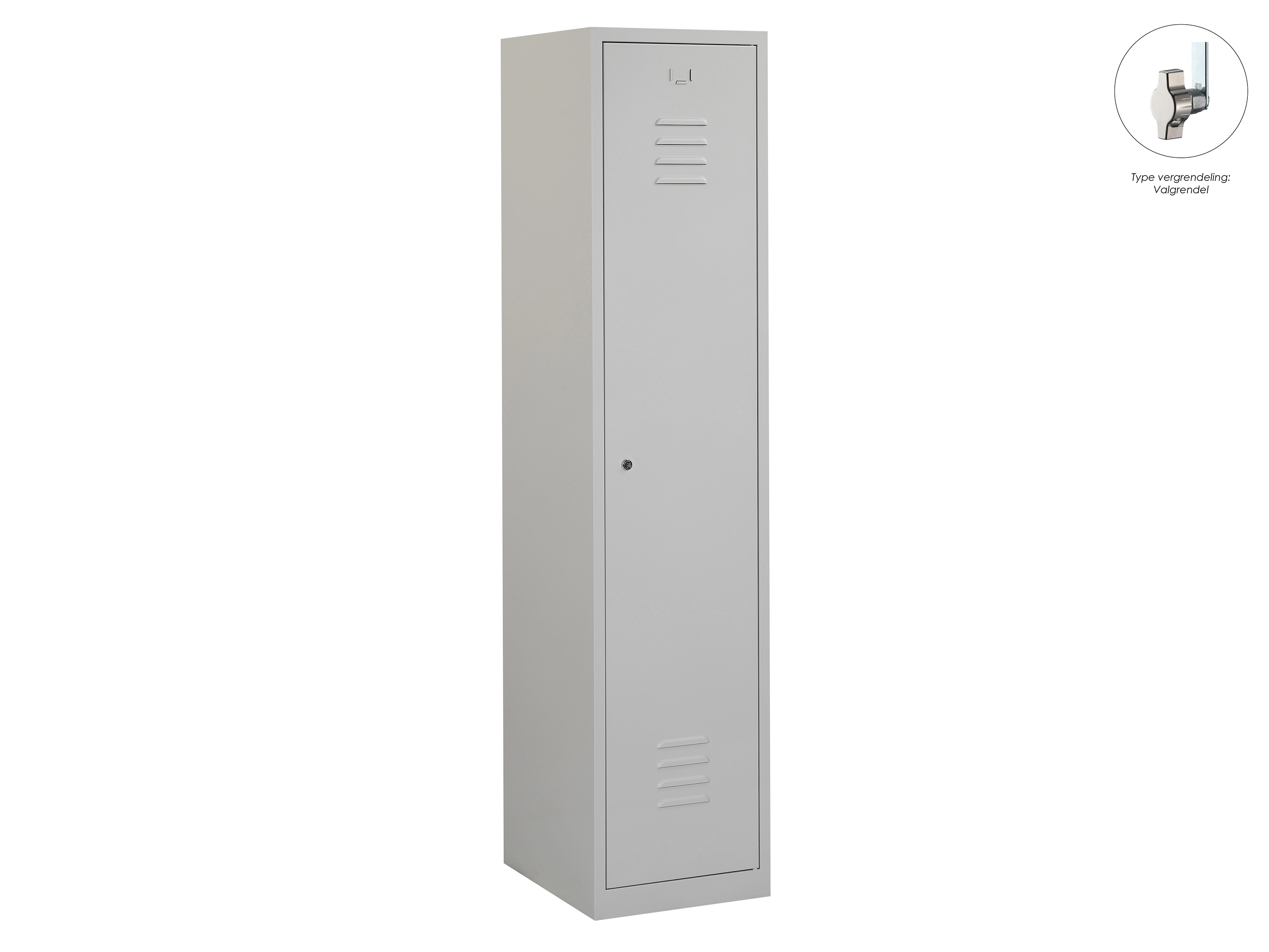 Type deuren: draaideur (ventilatiesleuven), type slot: cilinderslot. Kleur romp: grijs (RAL7035), kleur deuren: grijs (RAL7035). Afmeting: 180x30x50 cm (HxBxD). Indeling: Legbord & kledingroede Aantal deuren: 1, aantal sleutels: 2.