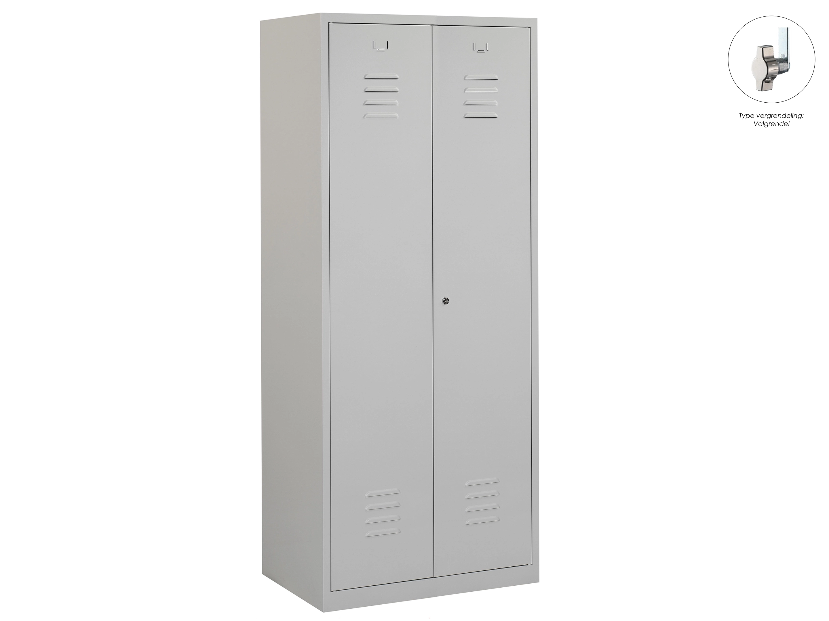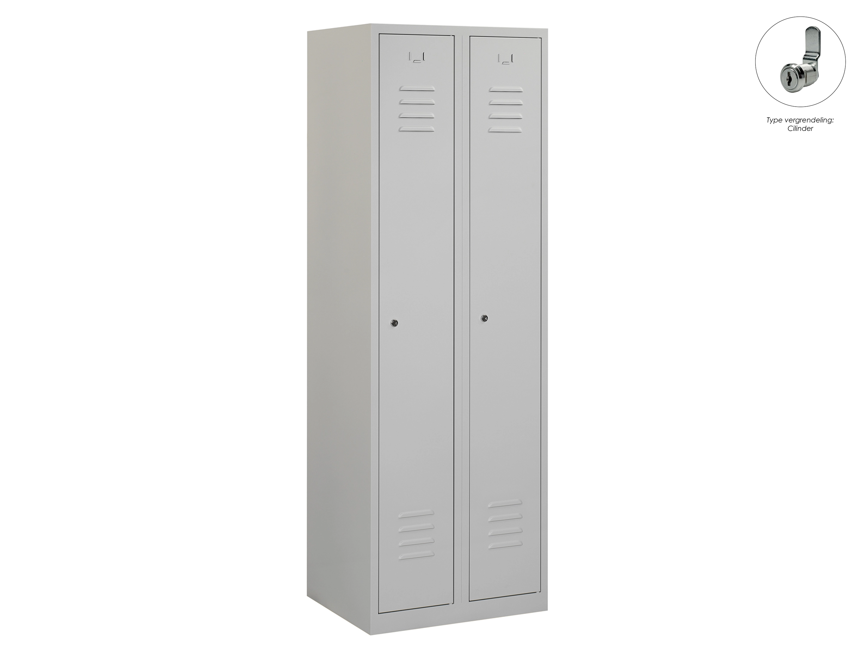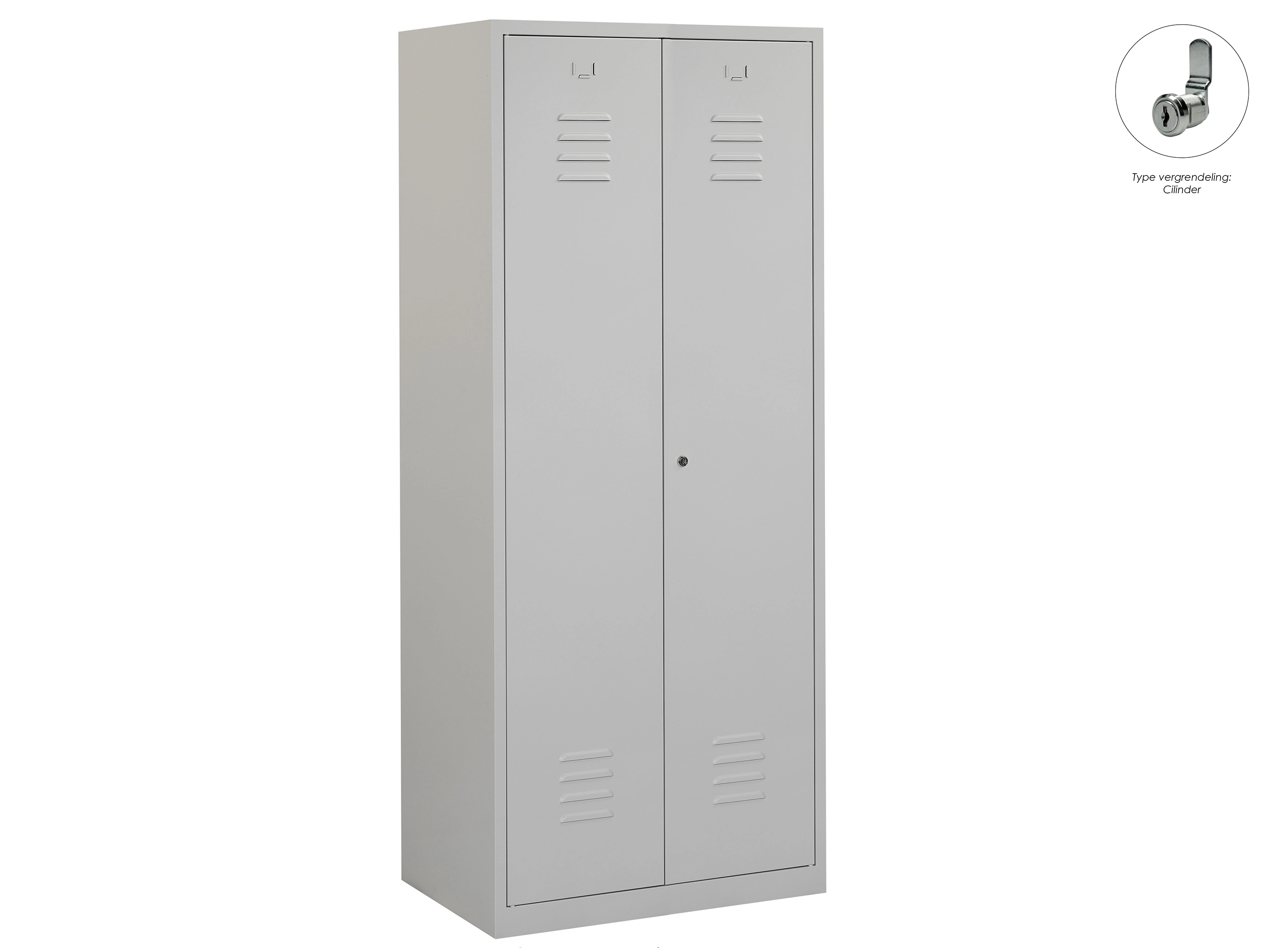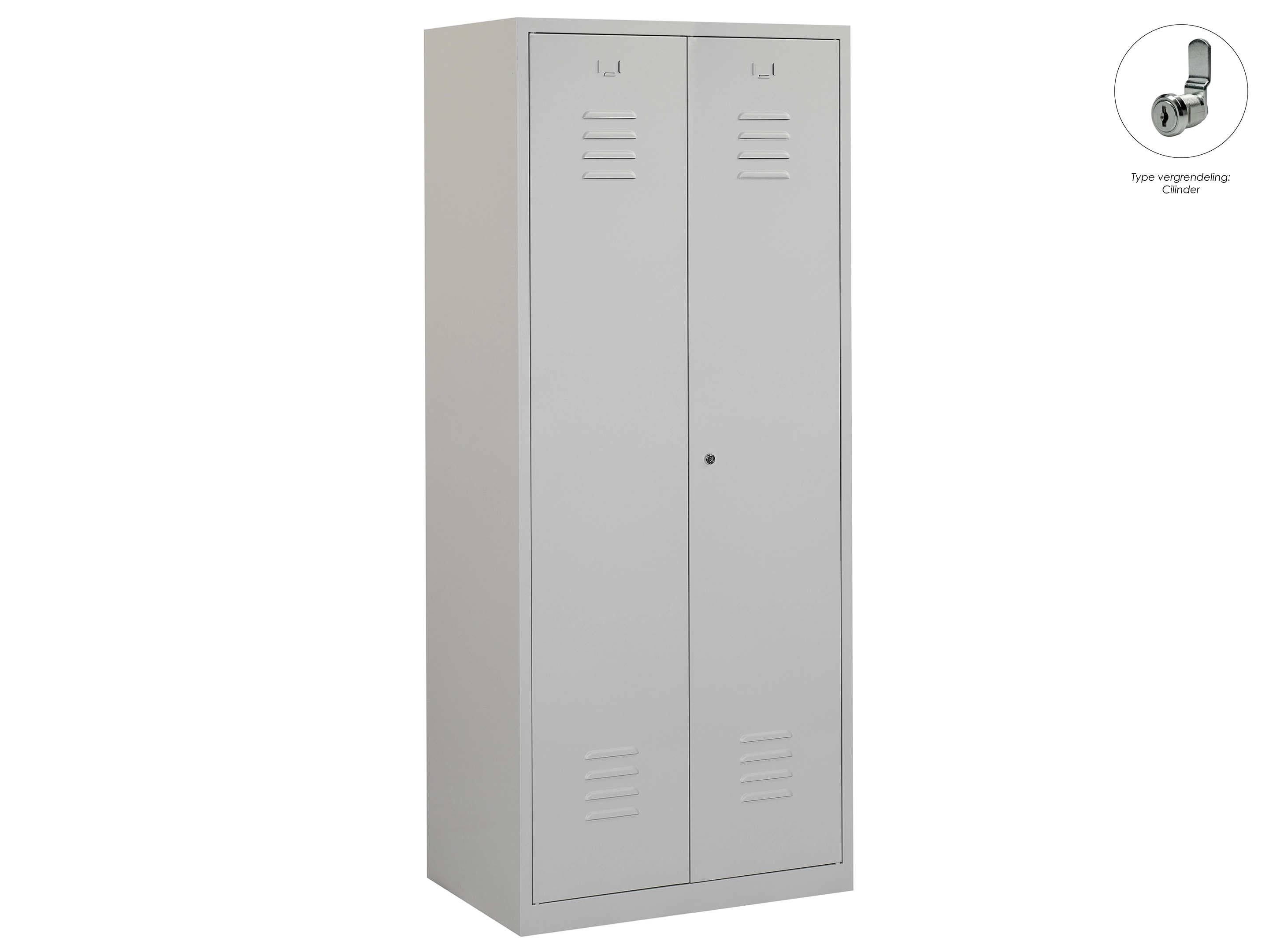 Type deuren: draaideur (ventilatiesleuven), type slot: cilinderslot. Kleur romp: grijs (RAL7035), kleur deuren: grijs (RAL7035). Afmeting: 180x60x50 cm (HxBxD). Indeling: Legbord & kledingroede Aantal deuren: 2, aantal sleutels: 2.