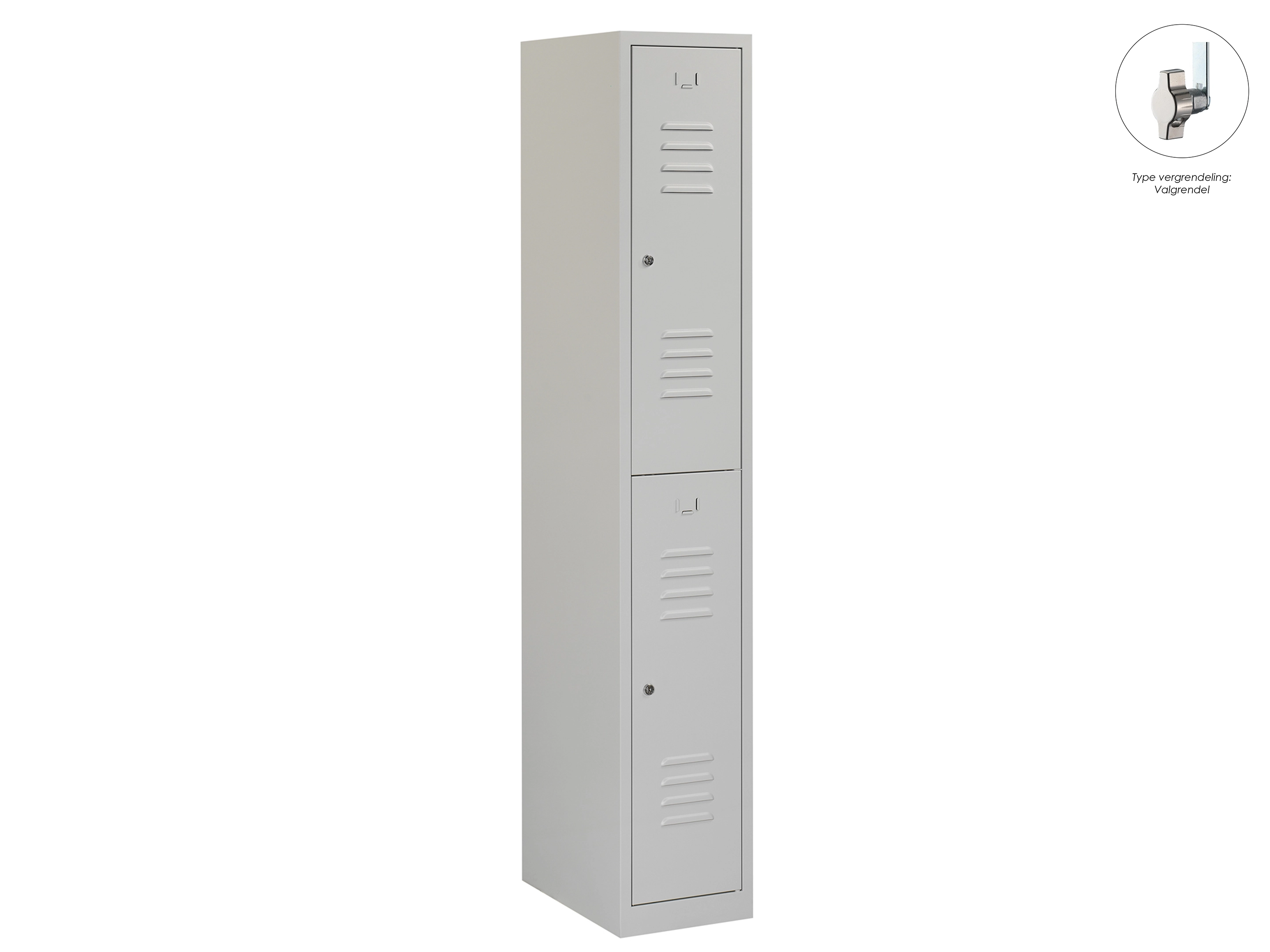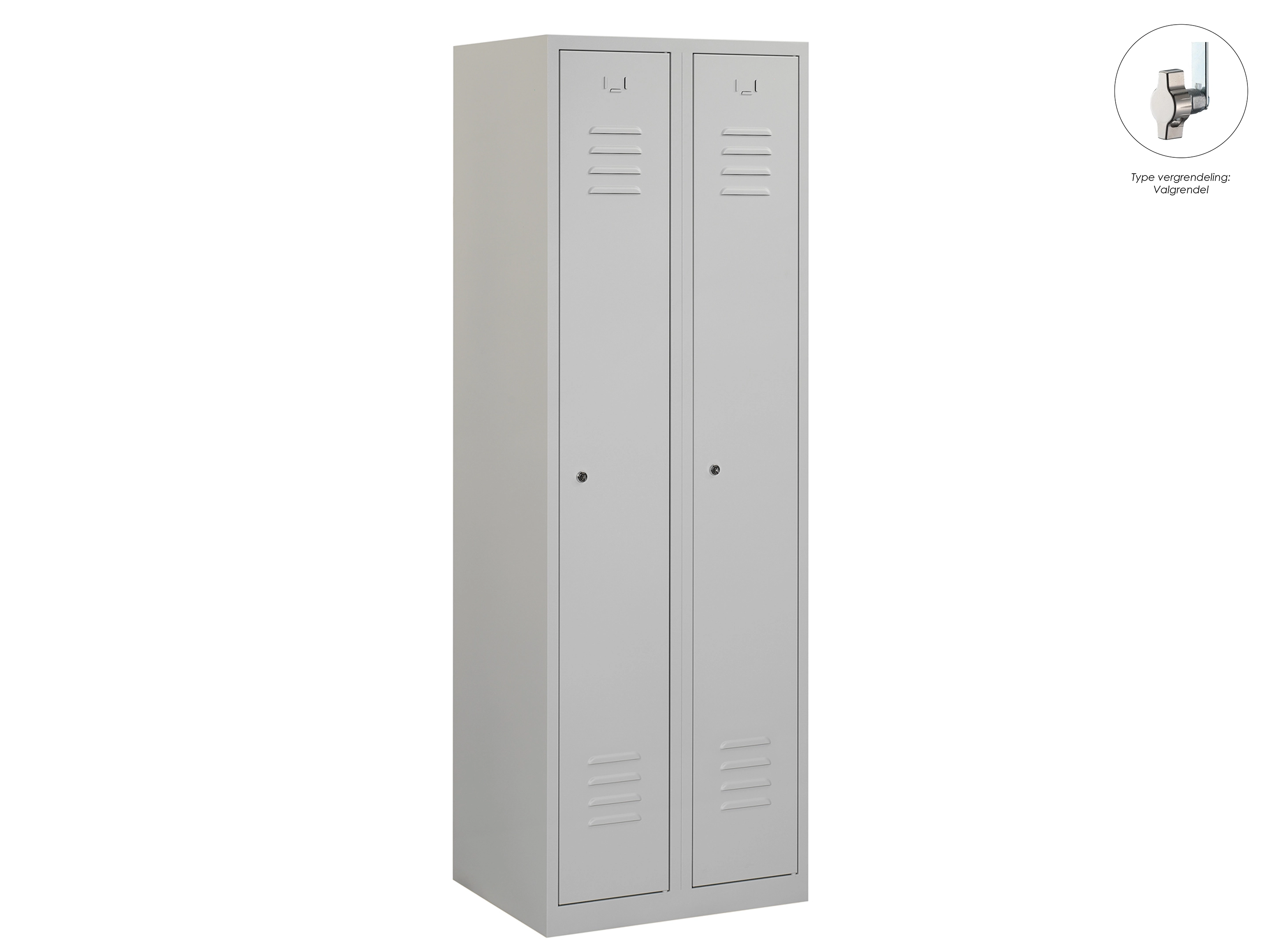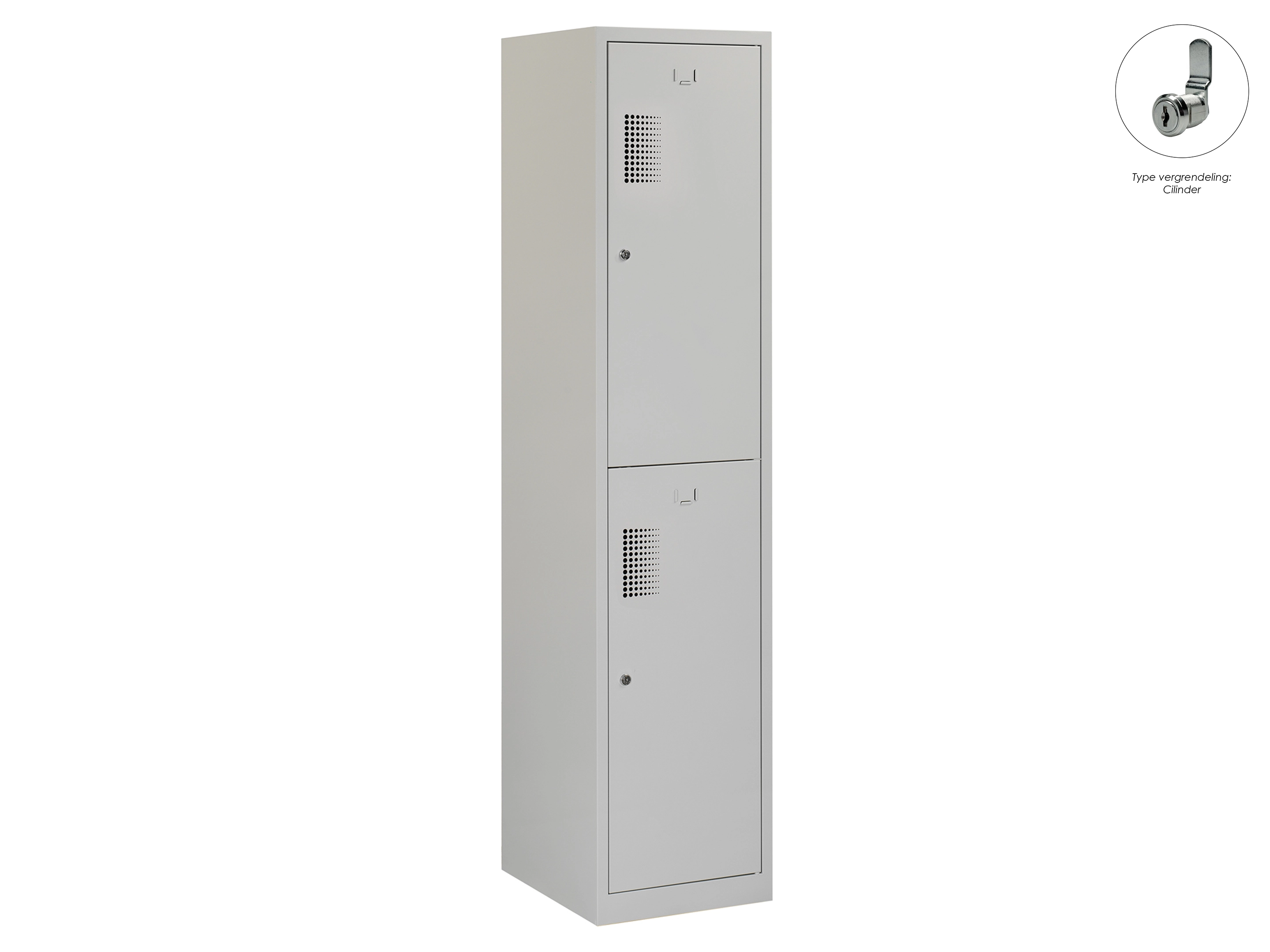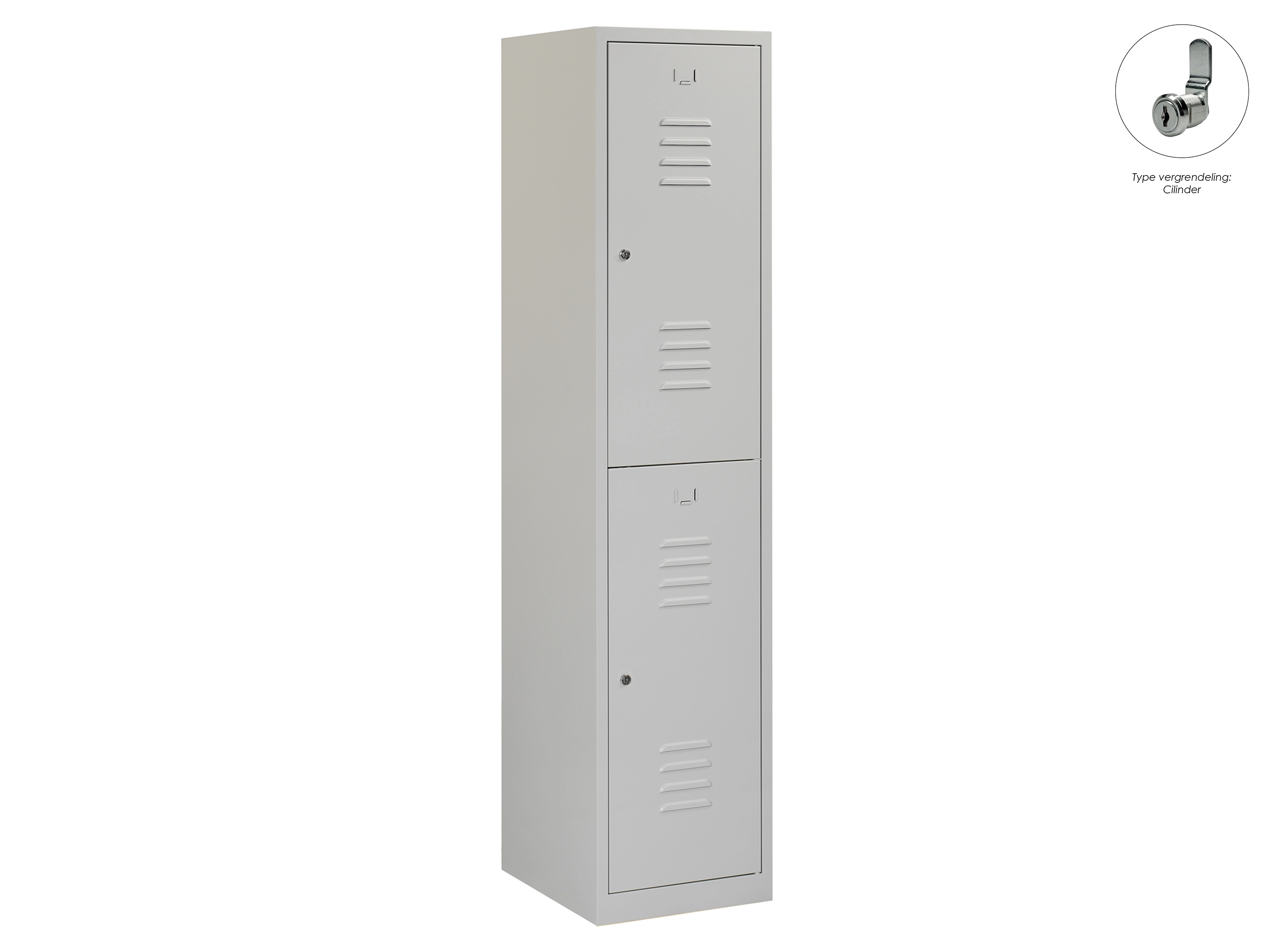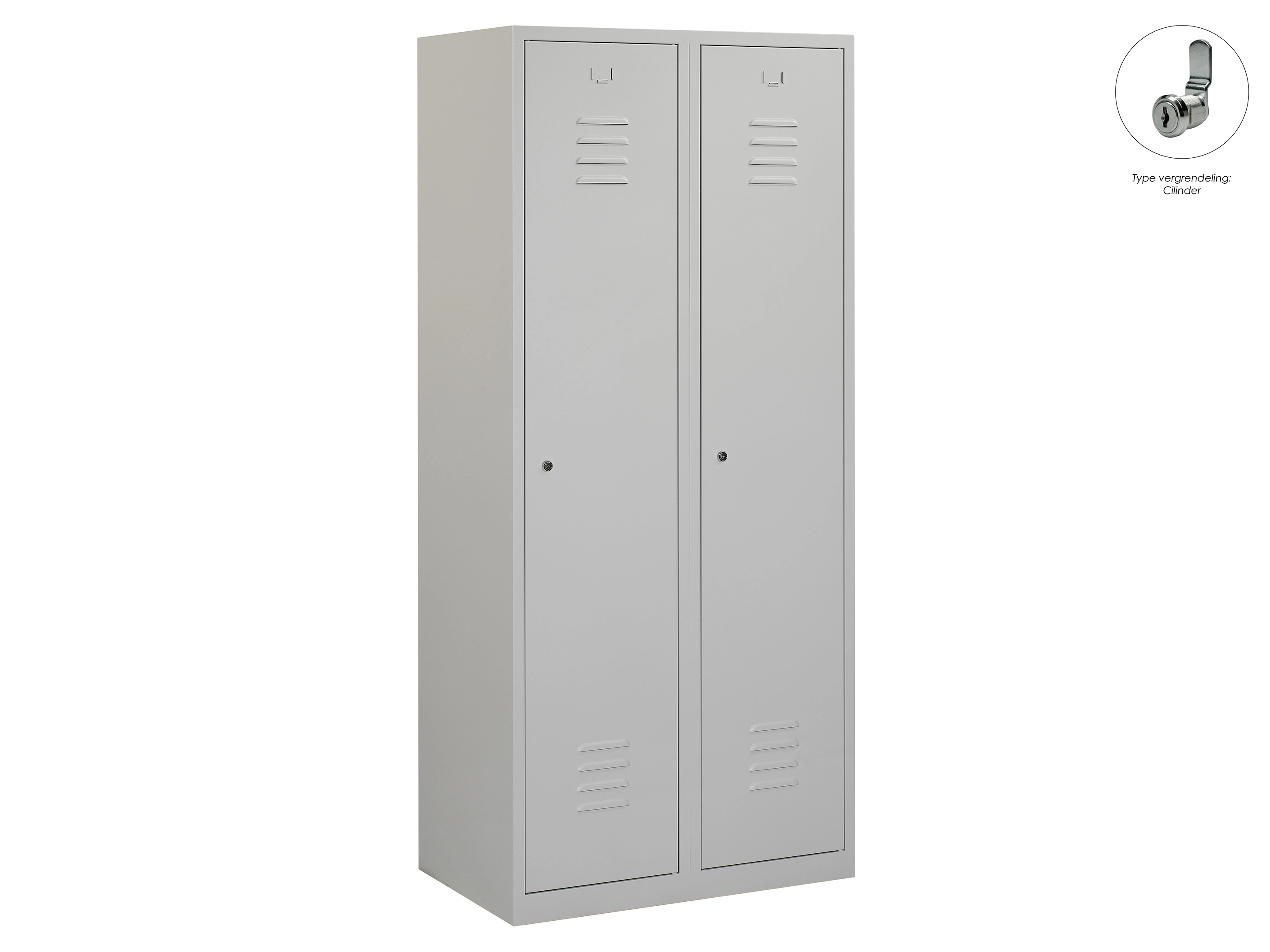 Type deuren: draaideur (ventilatiesleuven), type slot: cilinderslot. Kleur romp: grijs (RAL7035), kleur deuren: grijs (RAL7035). Afmeting: 180x60x50 cm (HxBxD). Indeling: Legbord & kledingroede Aantal deuren: 2, aantal sleutels: 2.