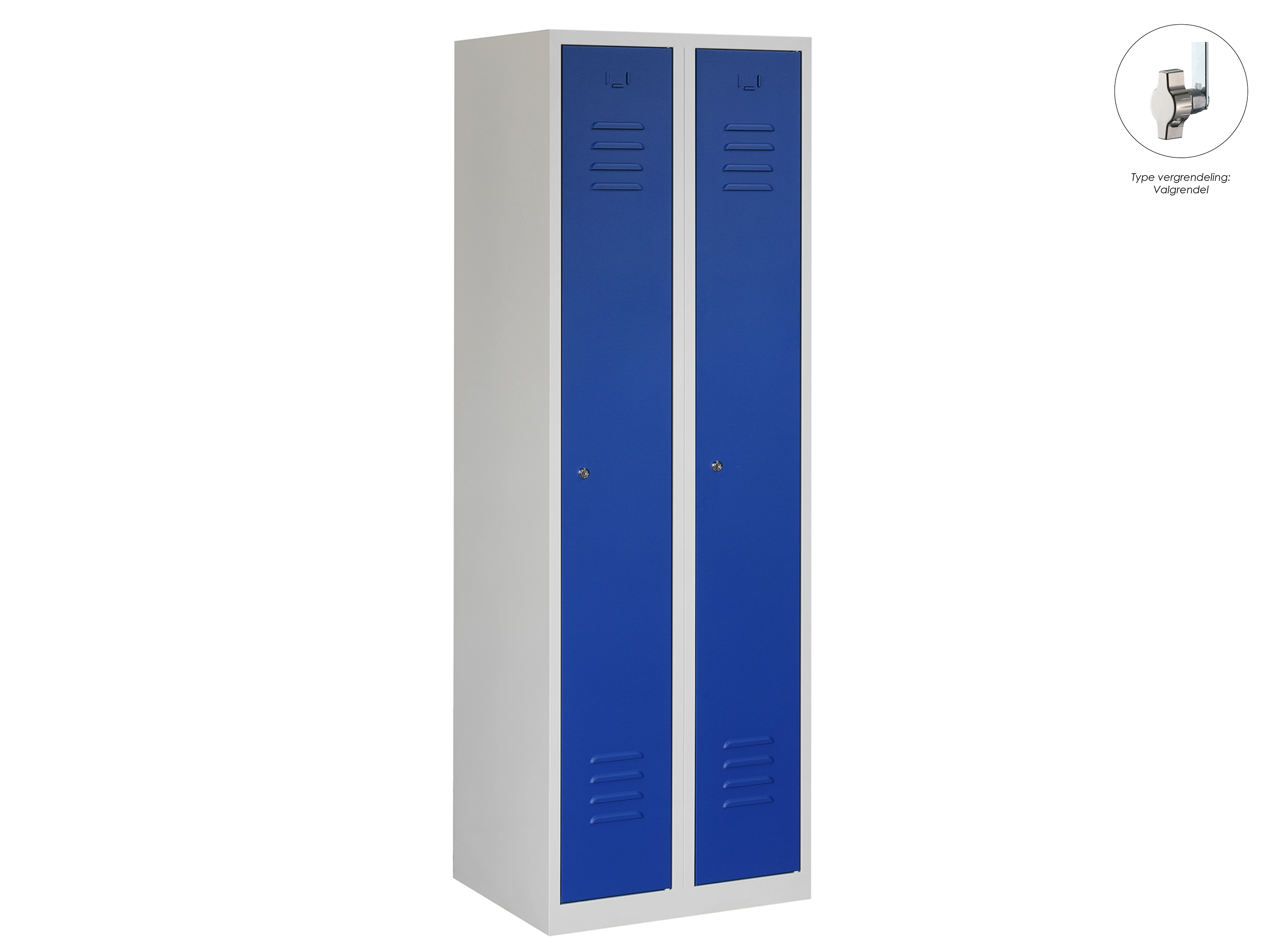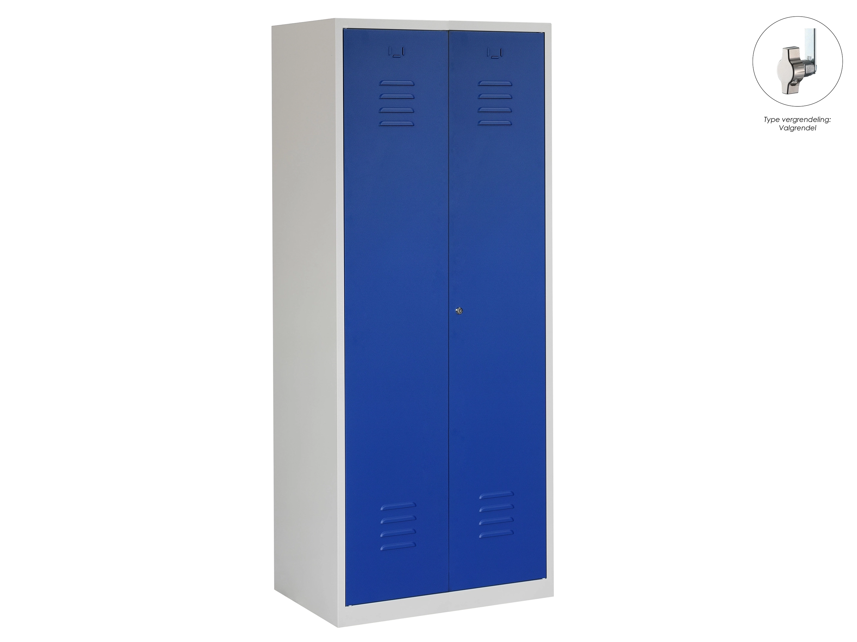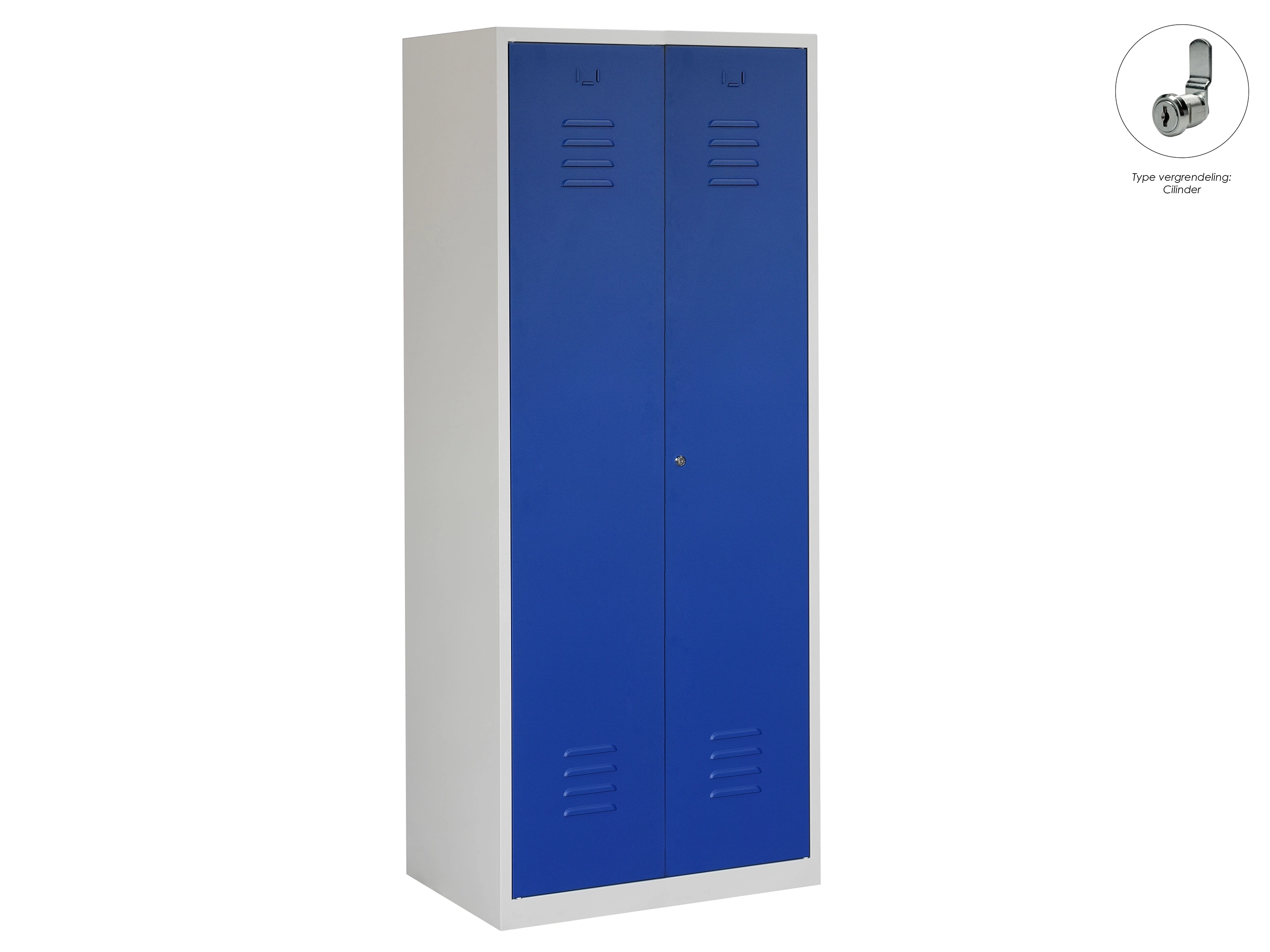 Type deuren: draaideur (ventilatiesleuven), type slot: cilinderslot. Kleur romp: grijs (RAL7035), kleur deuren: blauw (RAL5010). Afmeting: 180x80x50 cm (HxBxD). Indeling: Legbord & kledingroede Aantal deuren: 2, aantal sleutels: 2.