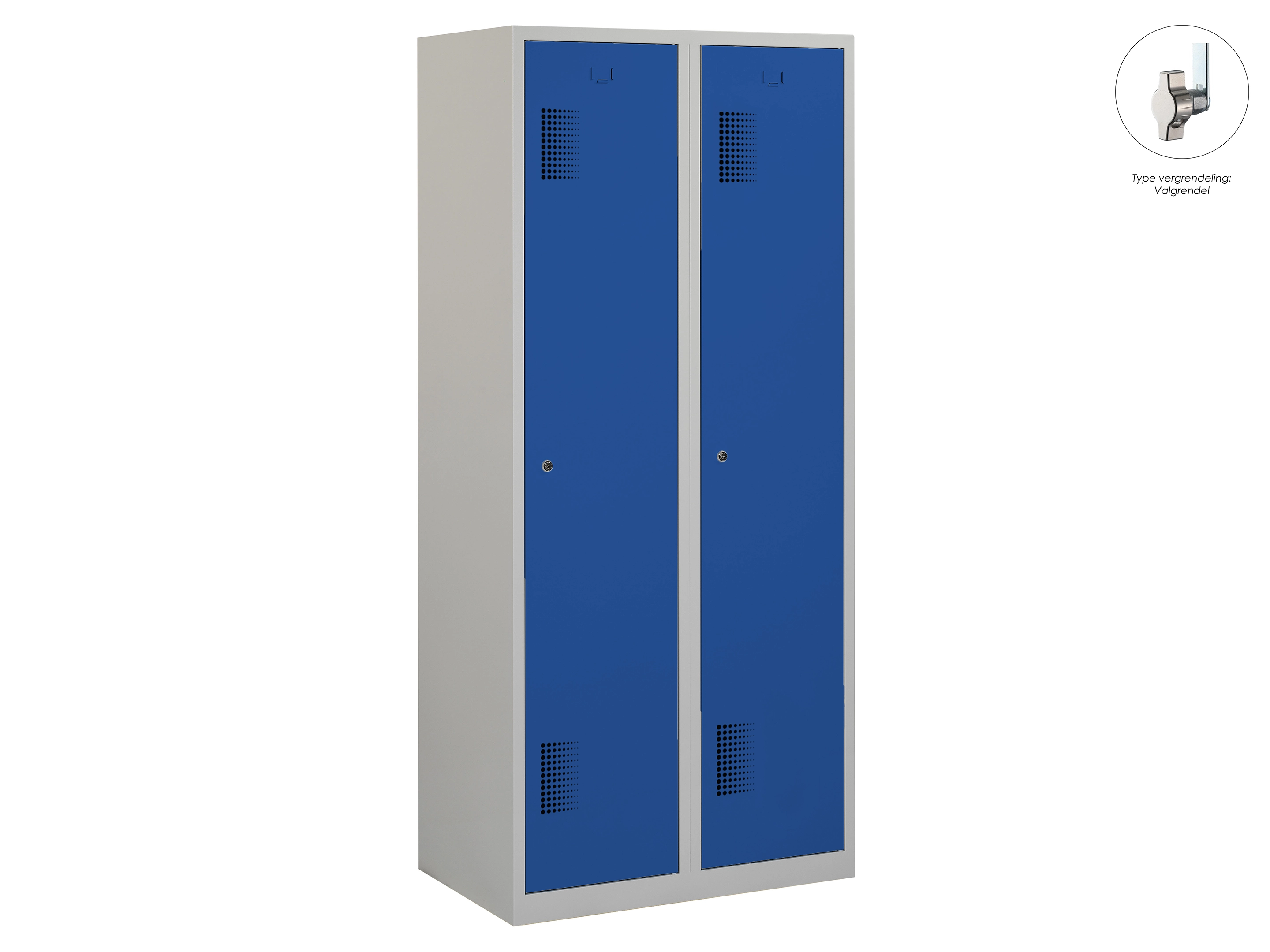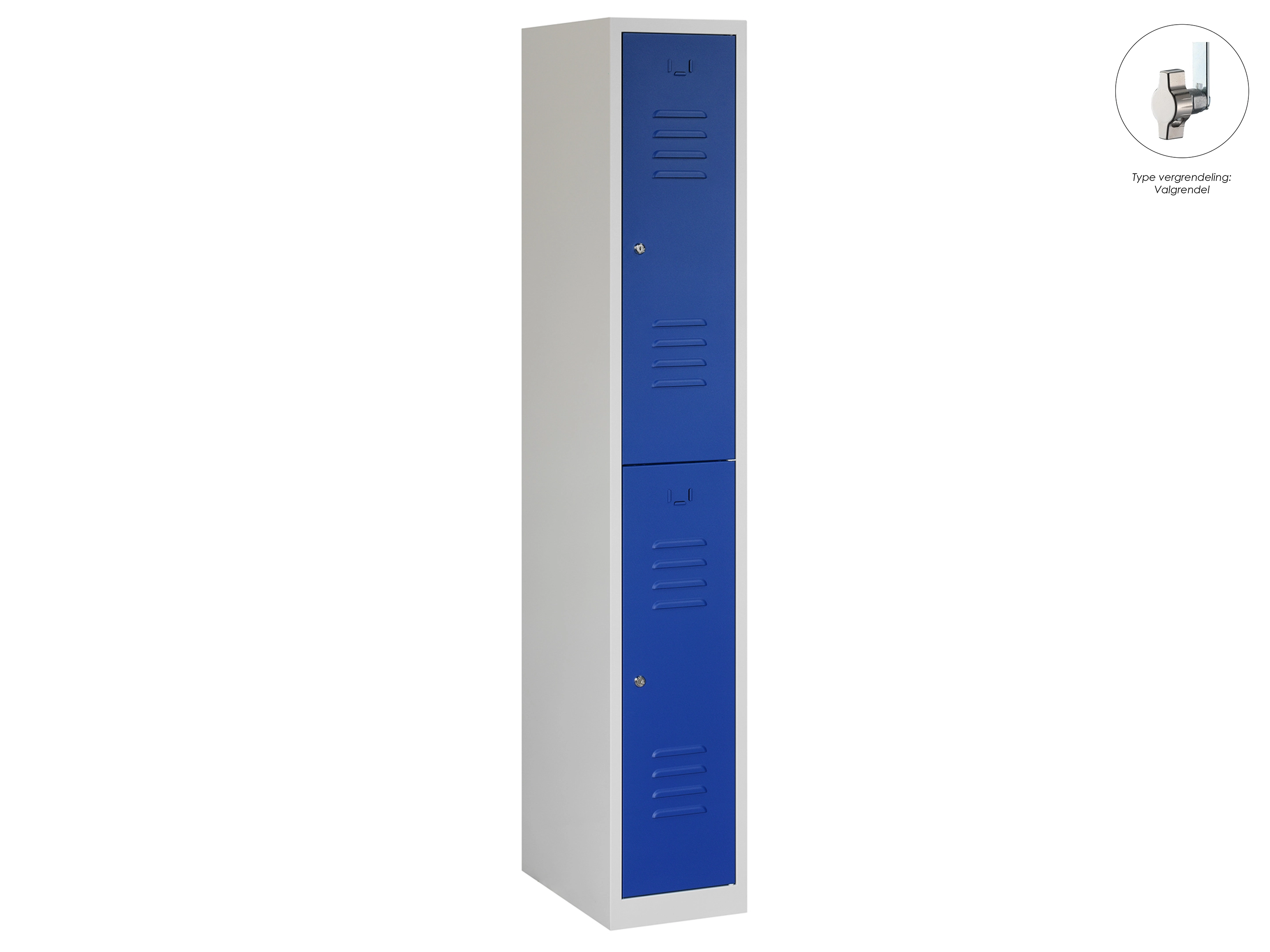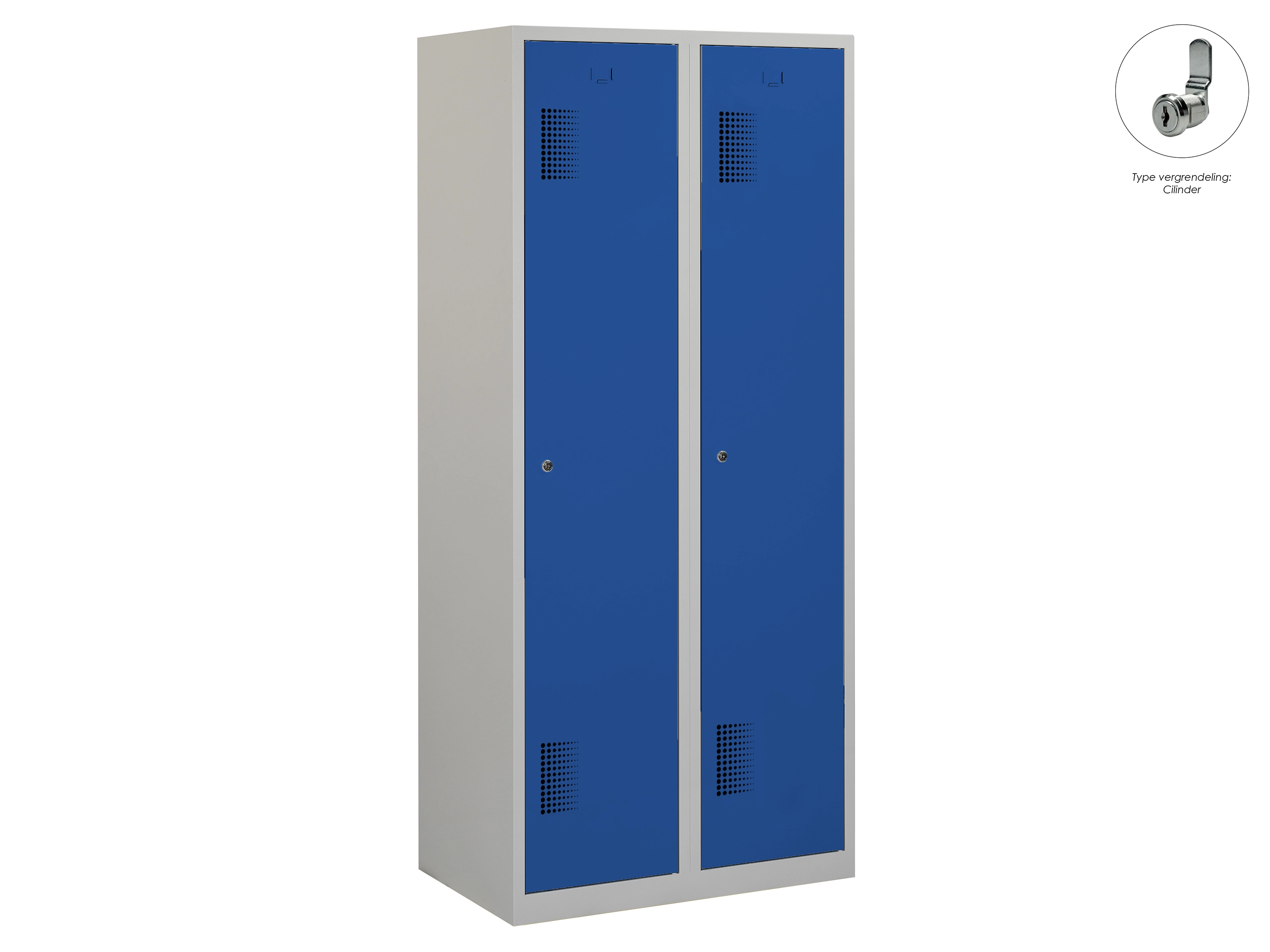 Type deuren: draaideur (ventilatiesleuven), type slot: cilinderslot. Kleur romp: grijs (RAL7035), kleur deuren: blauw (RAL5010). Afmeting: 180x80x50 cm (HxBxD). Indeling: Legbord & kledingroede Aantal deuren: 2, aantal sleutels: 2.