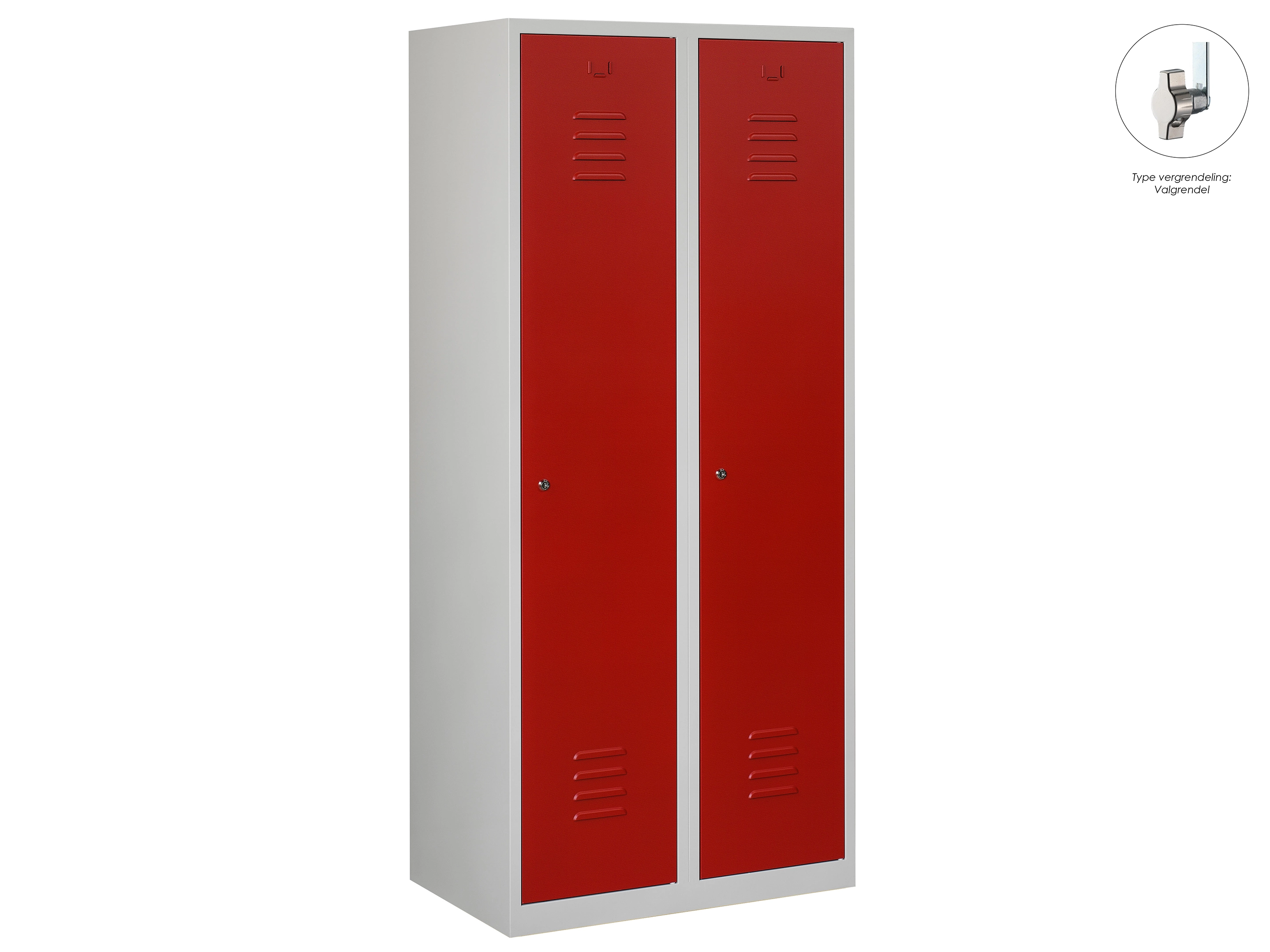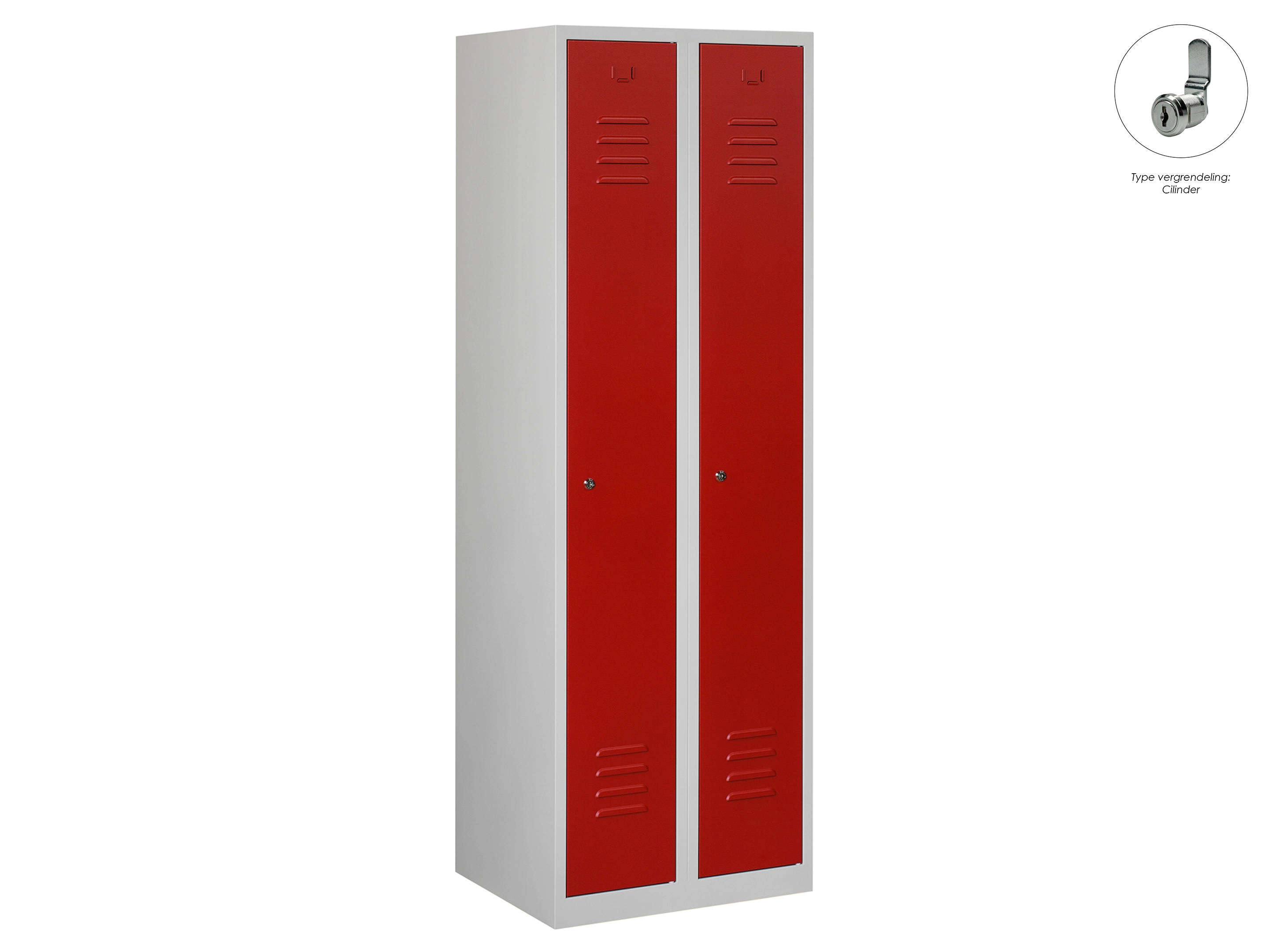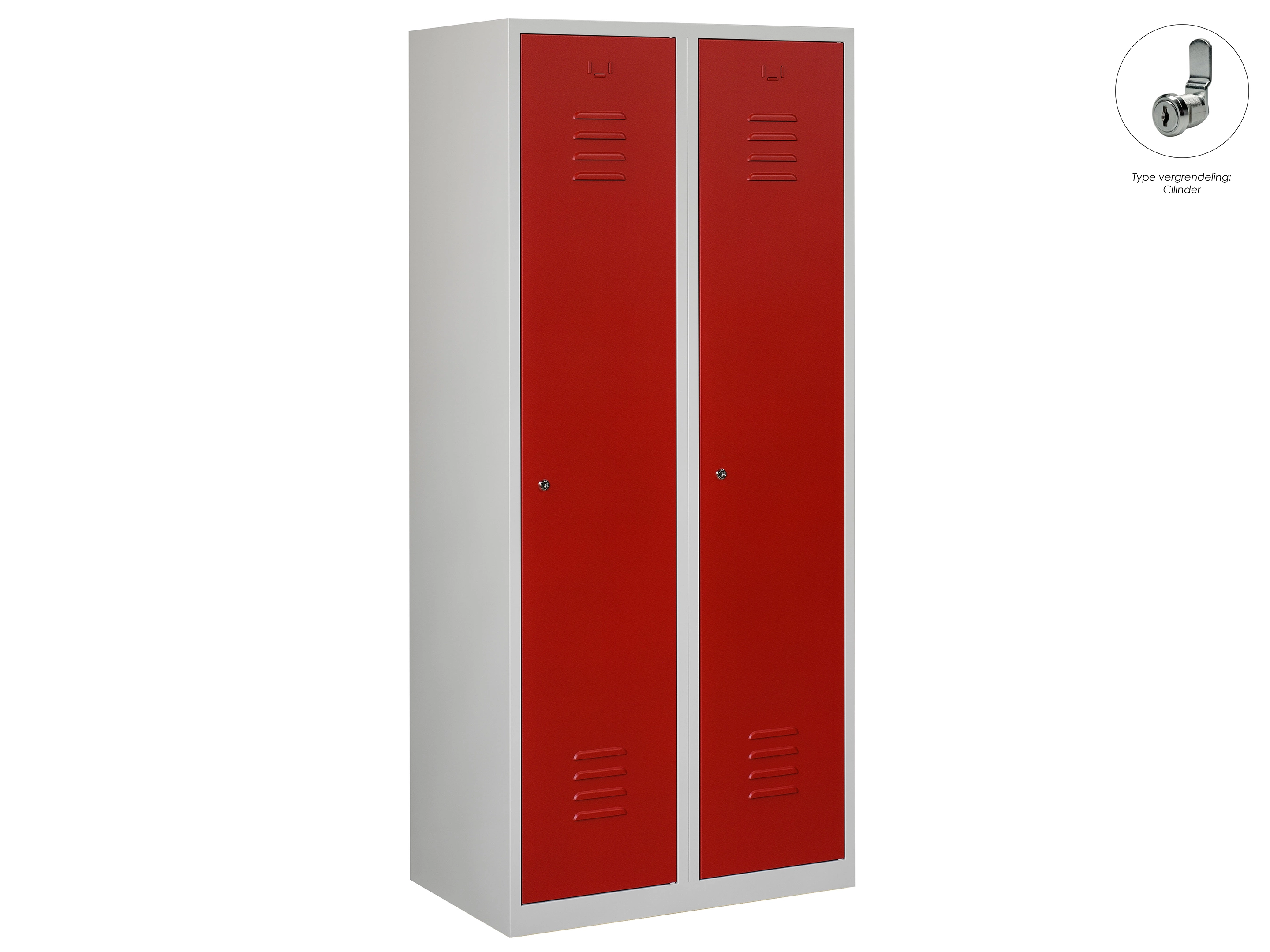 Type deuren: draaideur (ventilatiesleuven), type slot: cilinderslot. Kleur romp: grijs (RAL7035), kleur deuren: rood (RAL3000). Afmeting: 180x60x50 cm (HxBxD). Indeling: Legbord & kledingroede Aantal deuren: 2, aantal sleutels: 2.