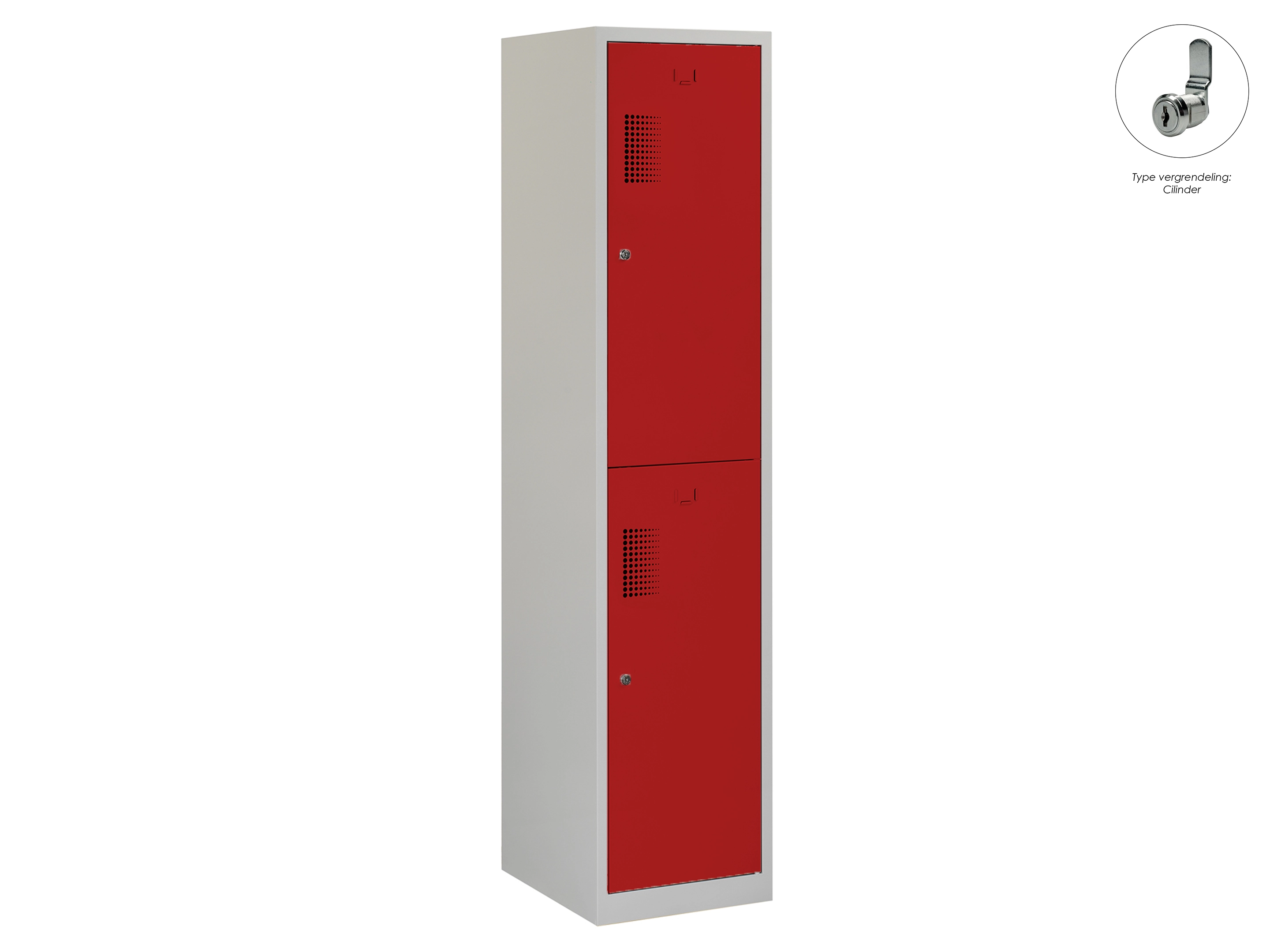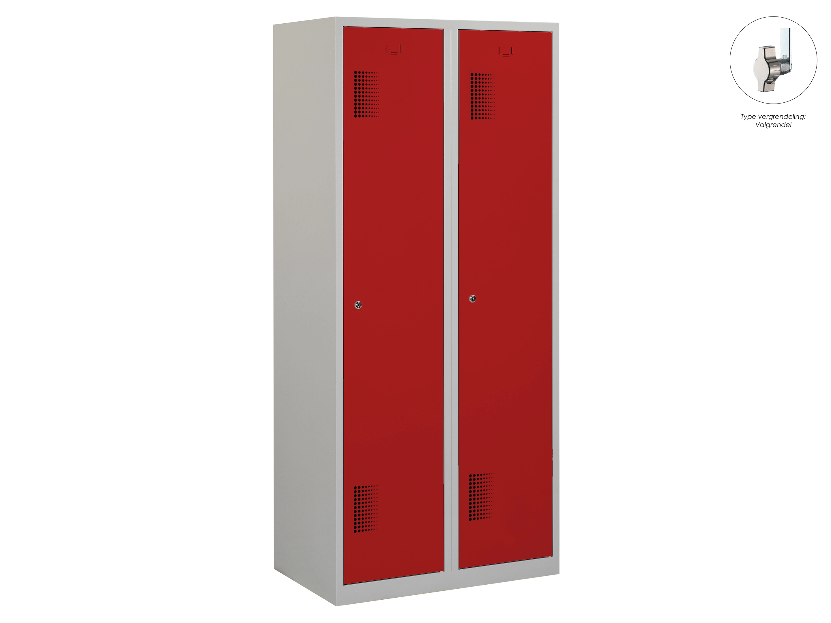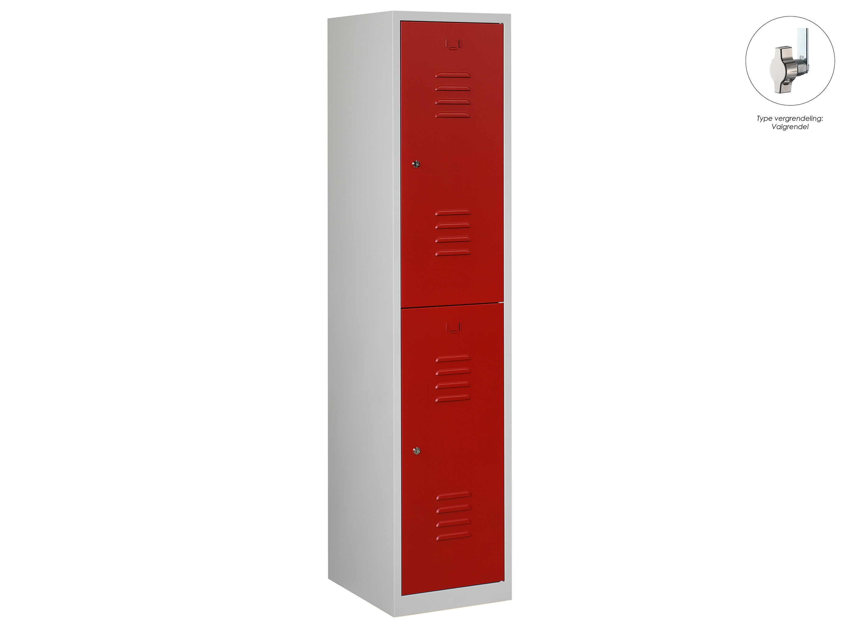 Type deuren: draaideur (ventilatiesleuven), type slot: cilinderslot. Kleur romp: grijs (RAL7035), kleur deuren: rood (RAL3000). Afmeting: 180x60x50 cm (HxBxD). Indeling: Legbord & kledingroede Aantal deuren: 2, aantal sleutels: 2.