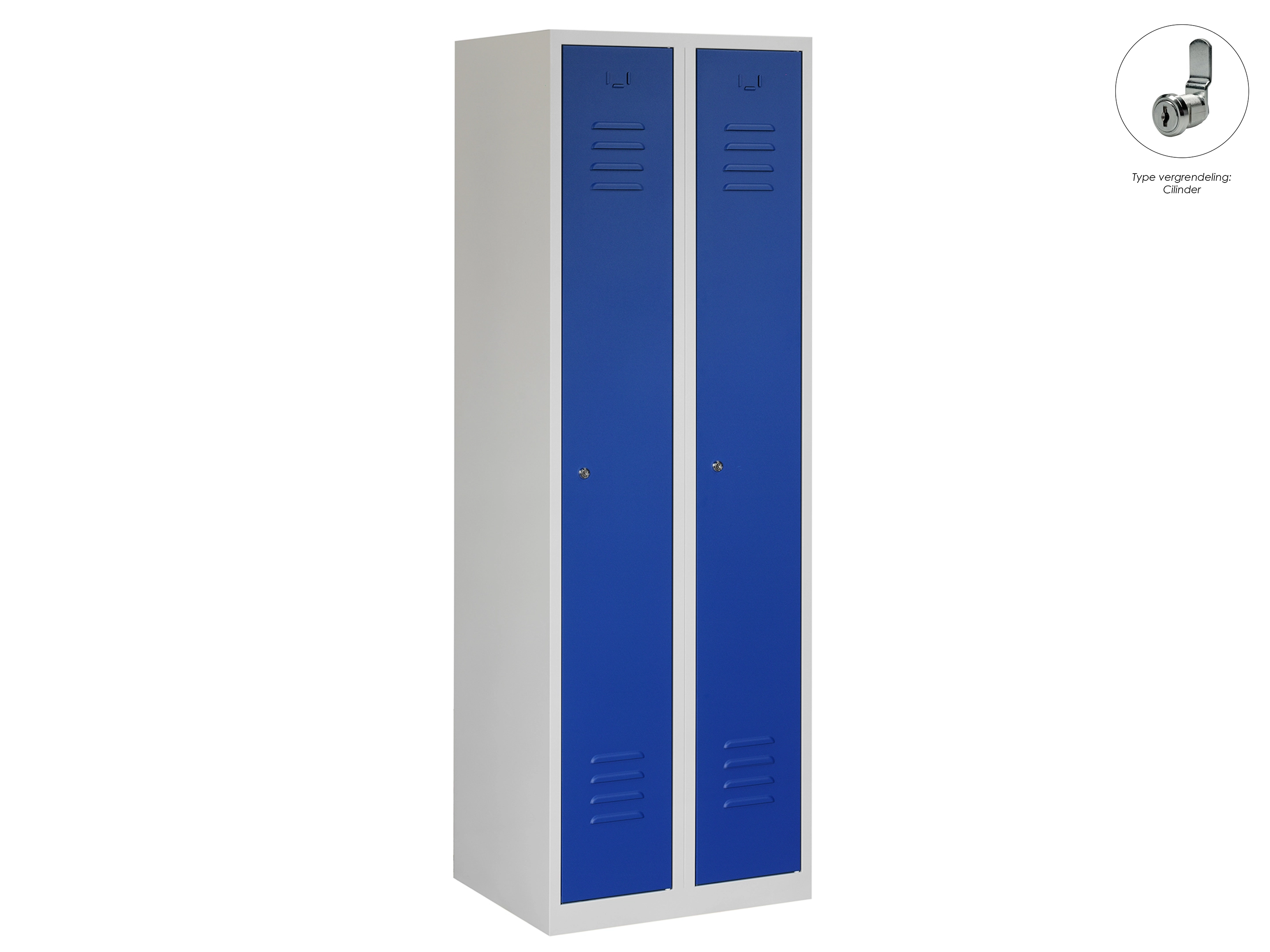 Type deuren: draaideur (ventilatiesleuven), type slot: cilinderslot. Kleur romp: grijs (RAL7035), kleur deuren: blauw (RAL5010). Afmeting: 180x60x50 cm (HxBxD). Indeling: Legbord & kledingroede Aantal deuren: 2, aantal sleutels: 2.
