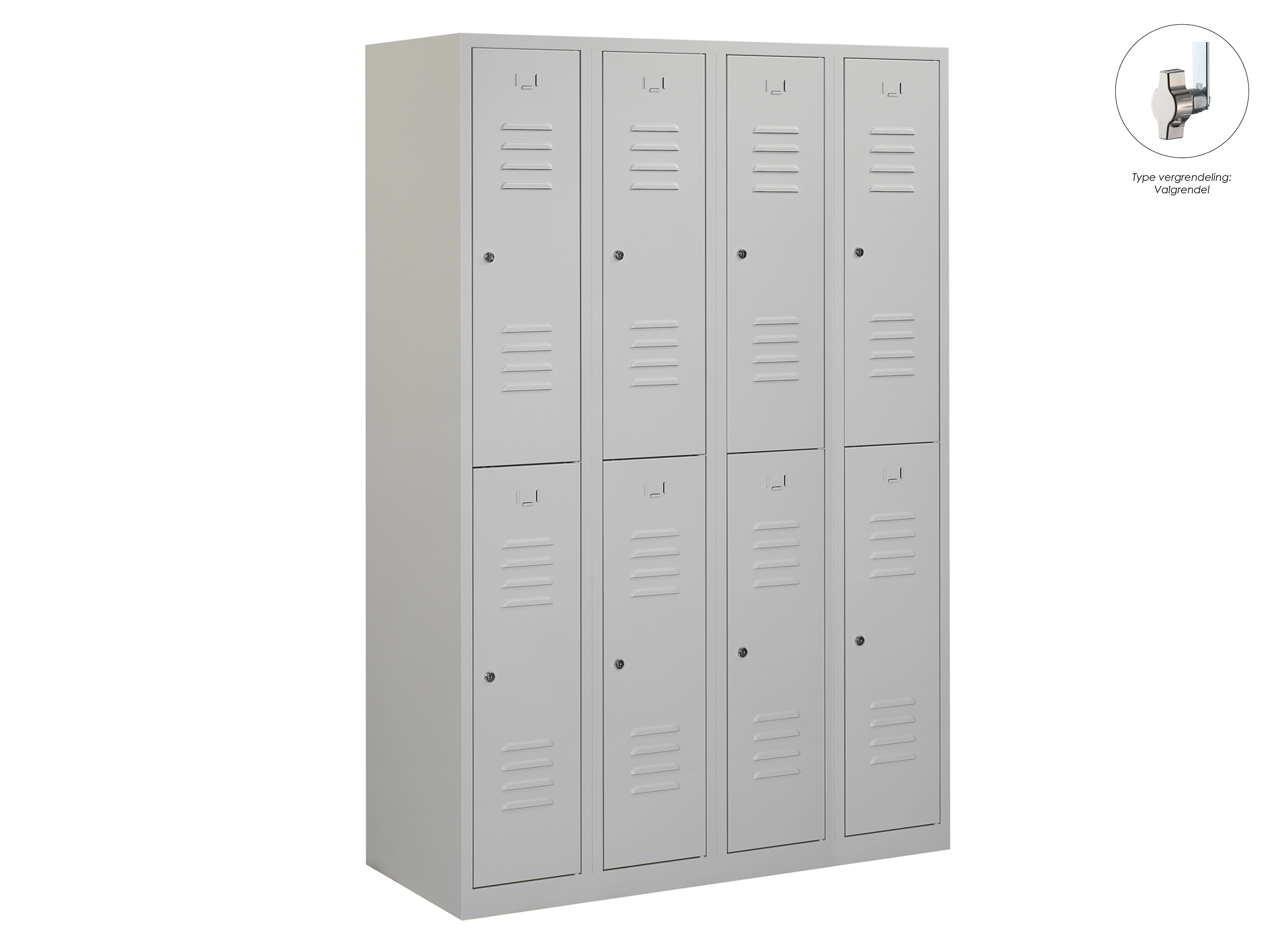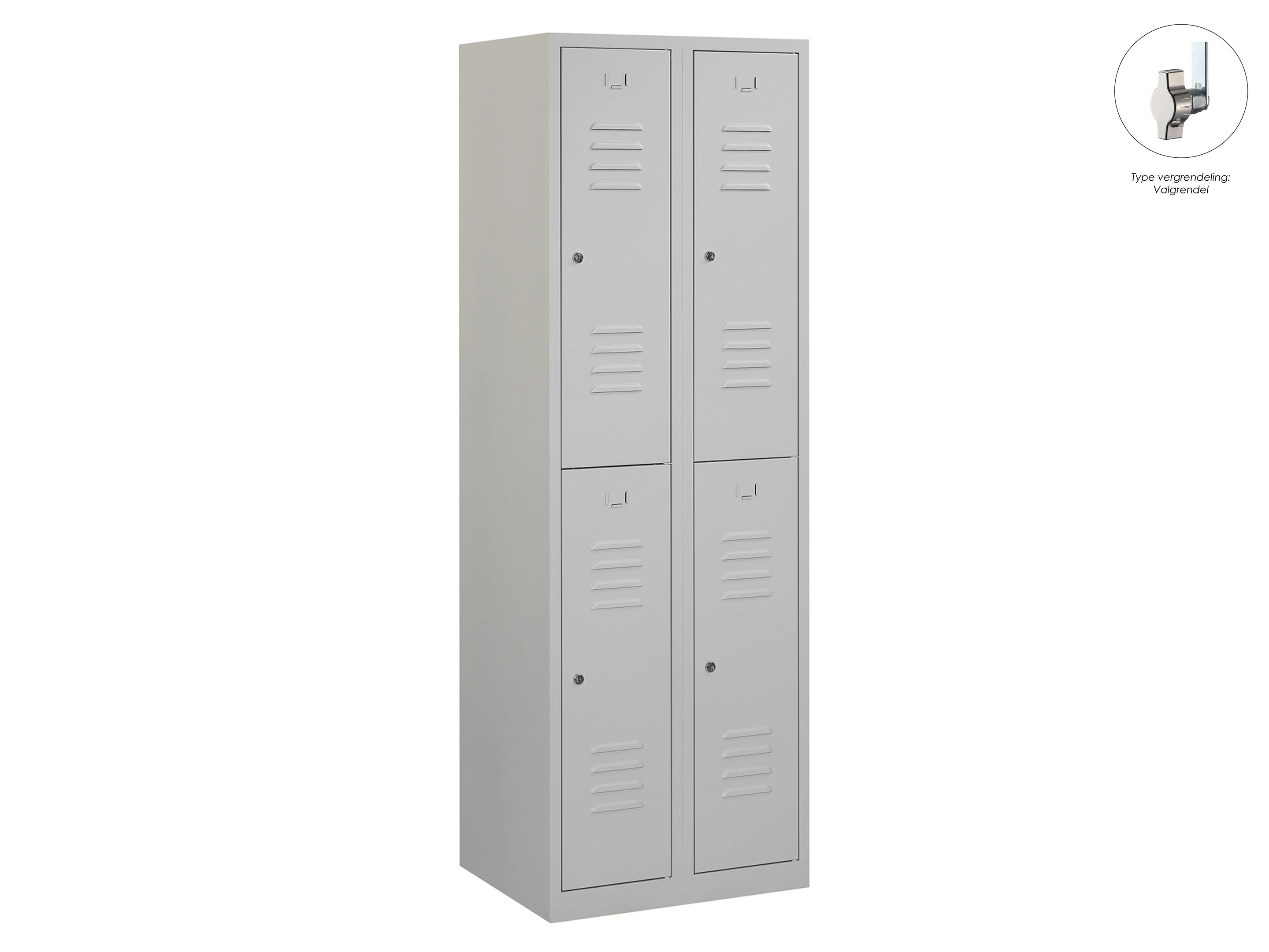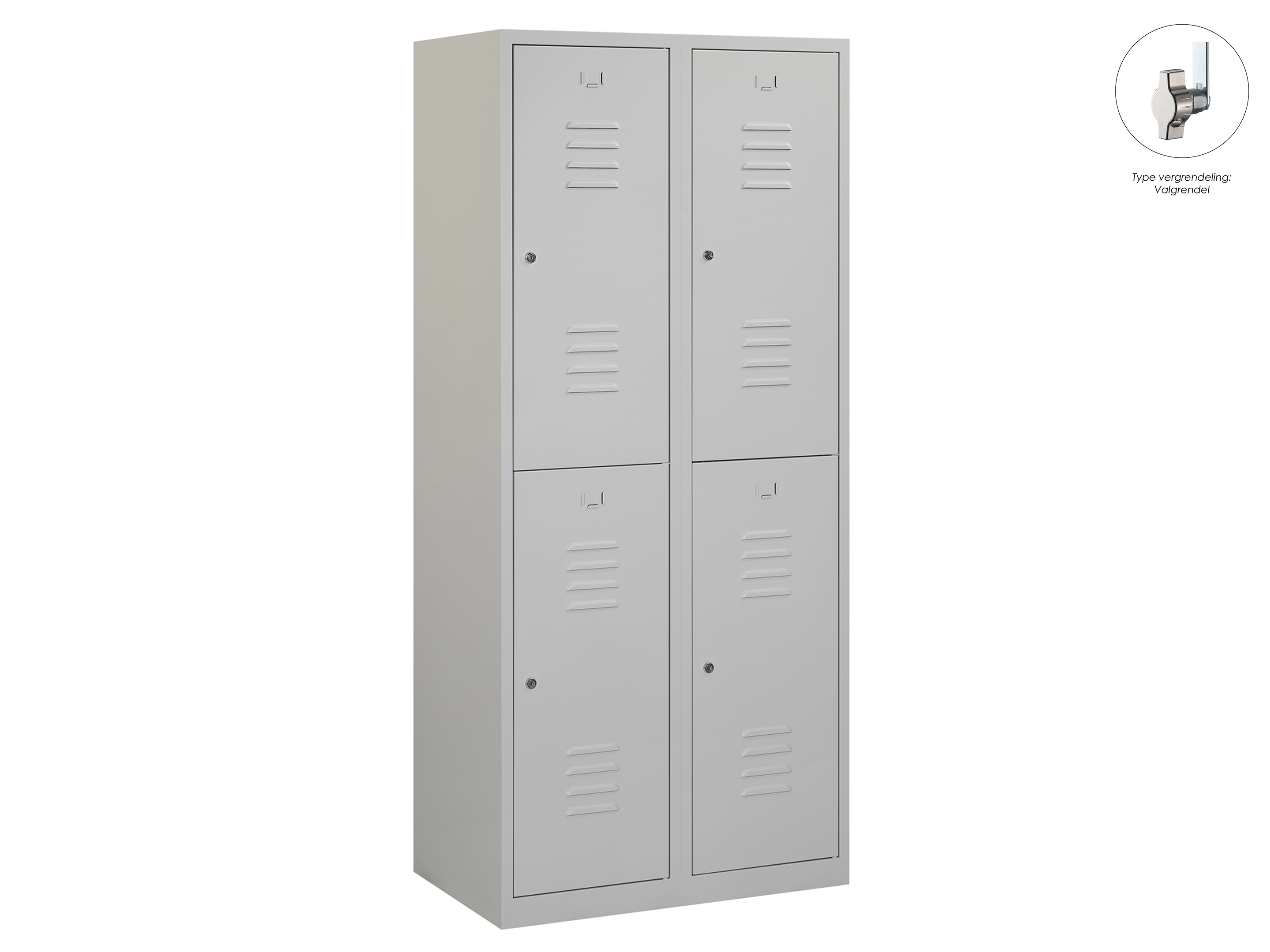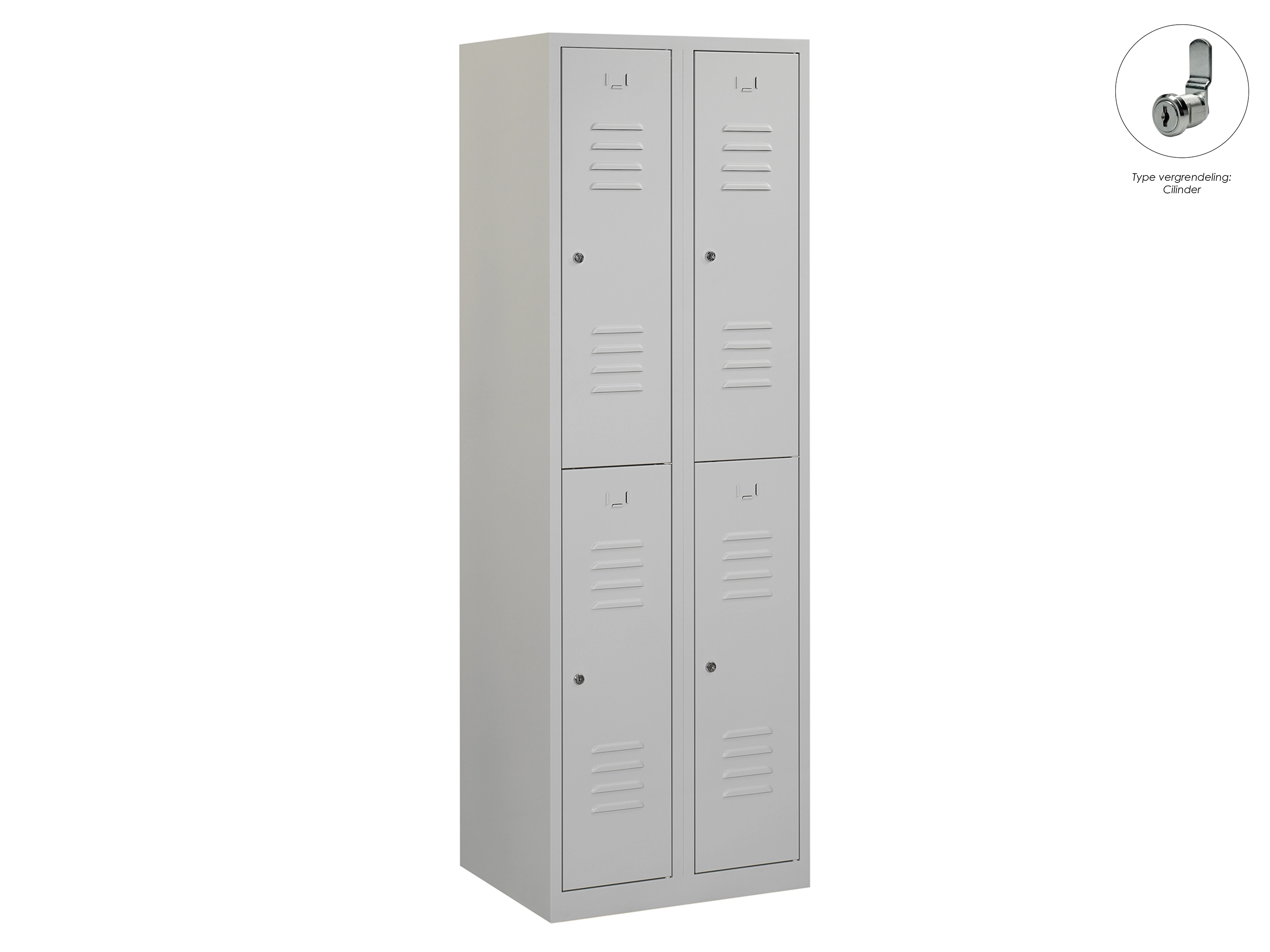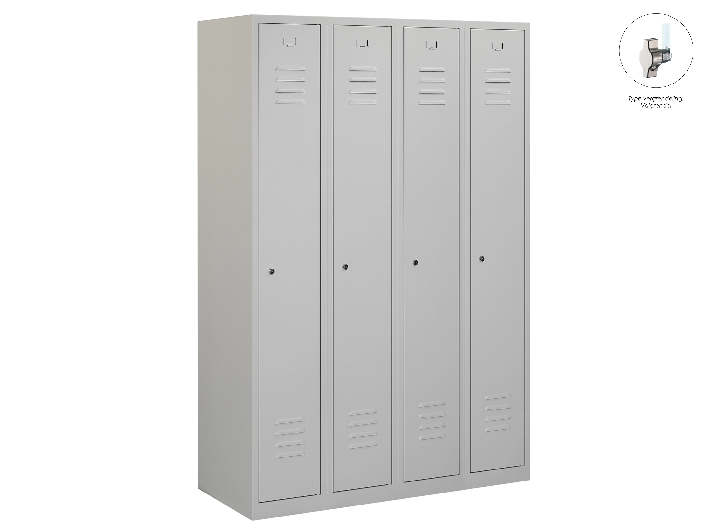 Type deuren: draaideur (ventilatiesleuven), type slot: valgrendelslot. Kleur romp: grijs (RAL7035), kleur deuren: grijs (RAL7035). Afmeting: 180x60x50 cm (HxBxD). Indeling: Kledingroede Aantal deuren: 4, aantal sleutels: geen.