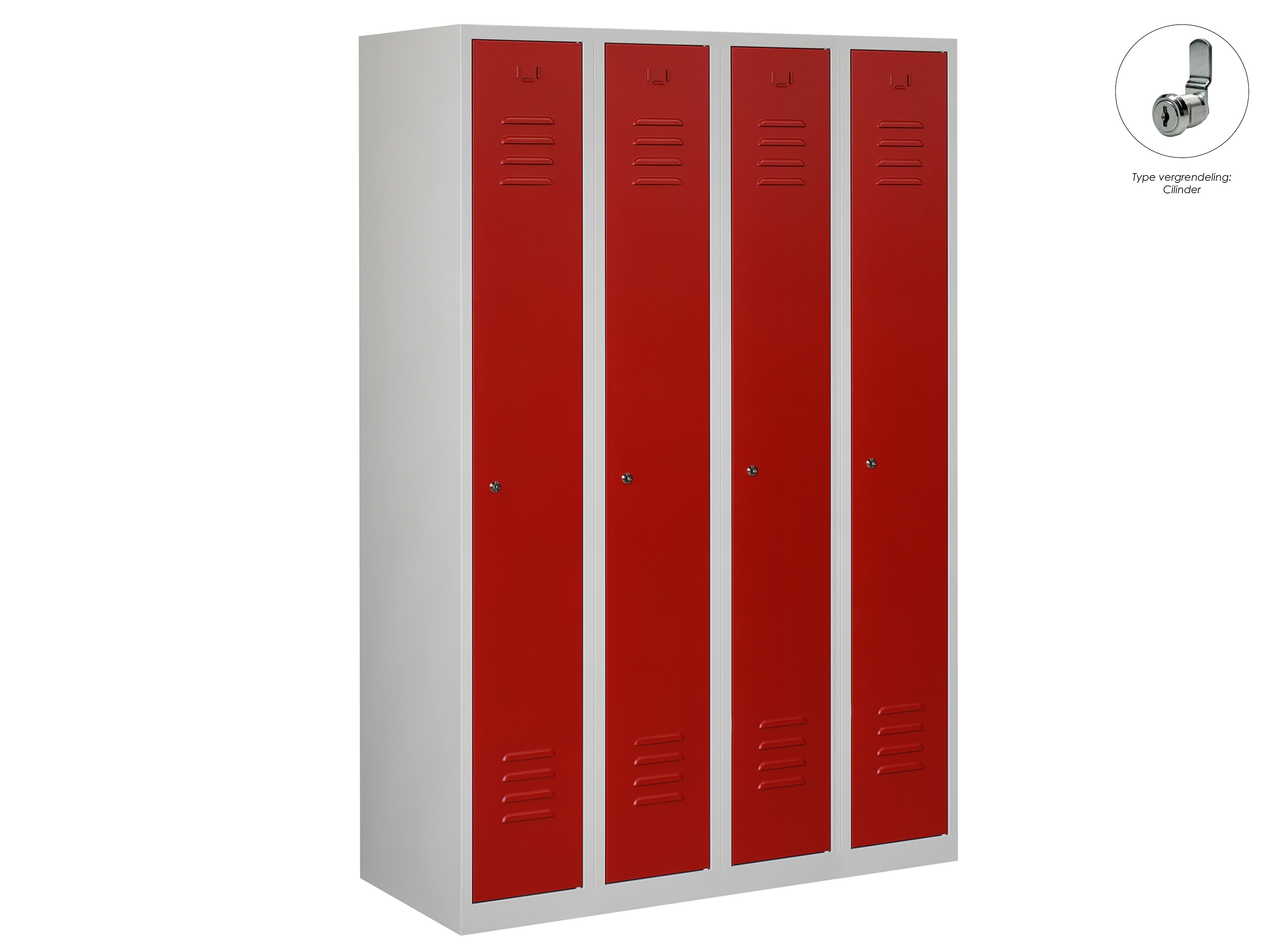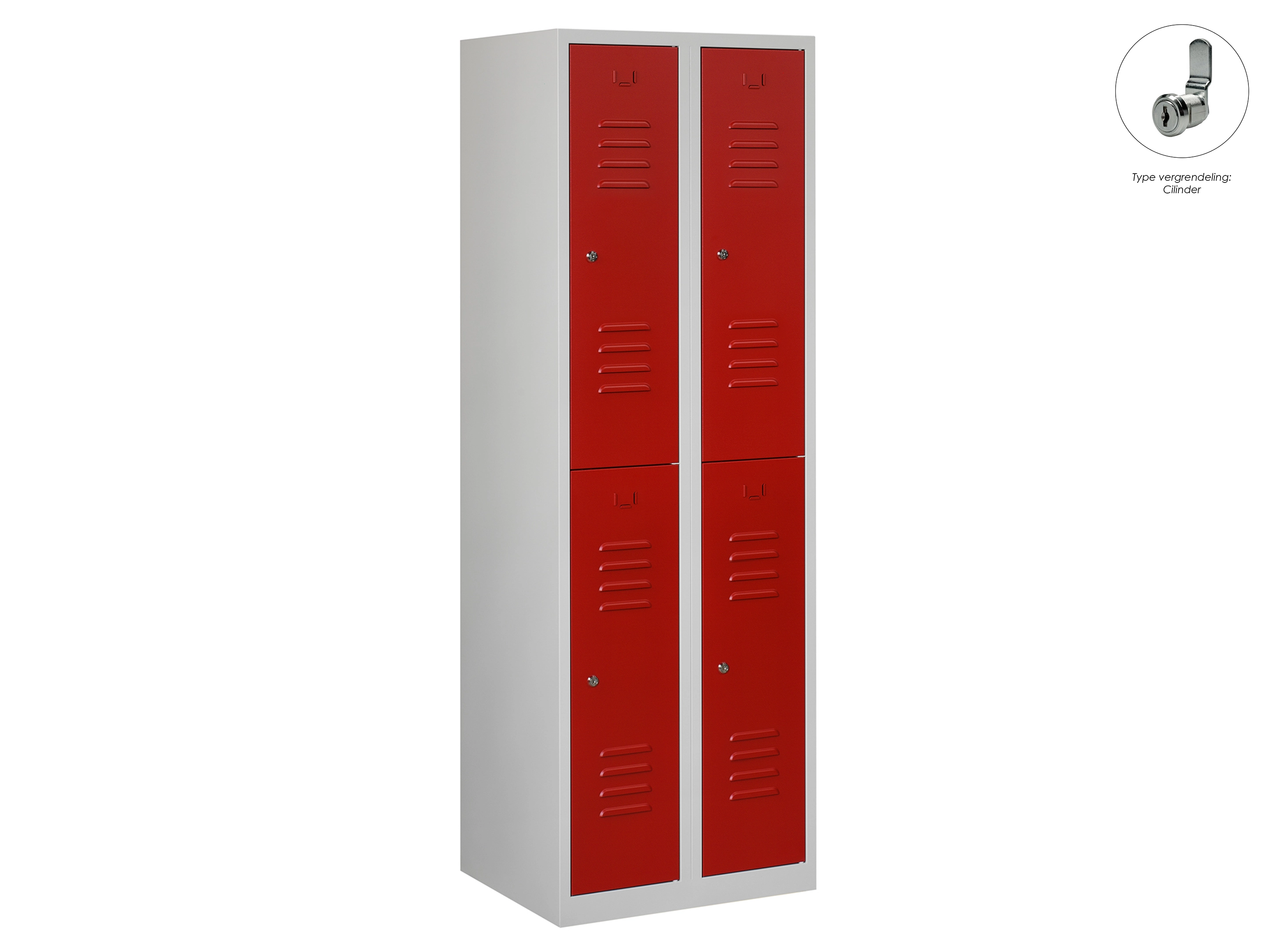 Type deuren: draaideur (ventilatiesleuven), type slot: cilinderslot. Kleur romp: grijs (RAL7035), kleur deuren: rood (RAL3000). Afmeting: 180x60x50 cm (HxBxD). Indeling: Kledingroede Aantal deuren: 4, aantal sleutels: 2.