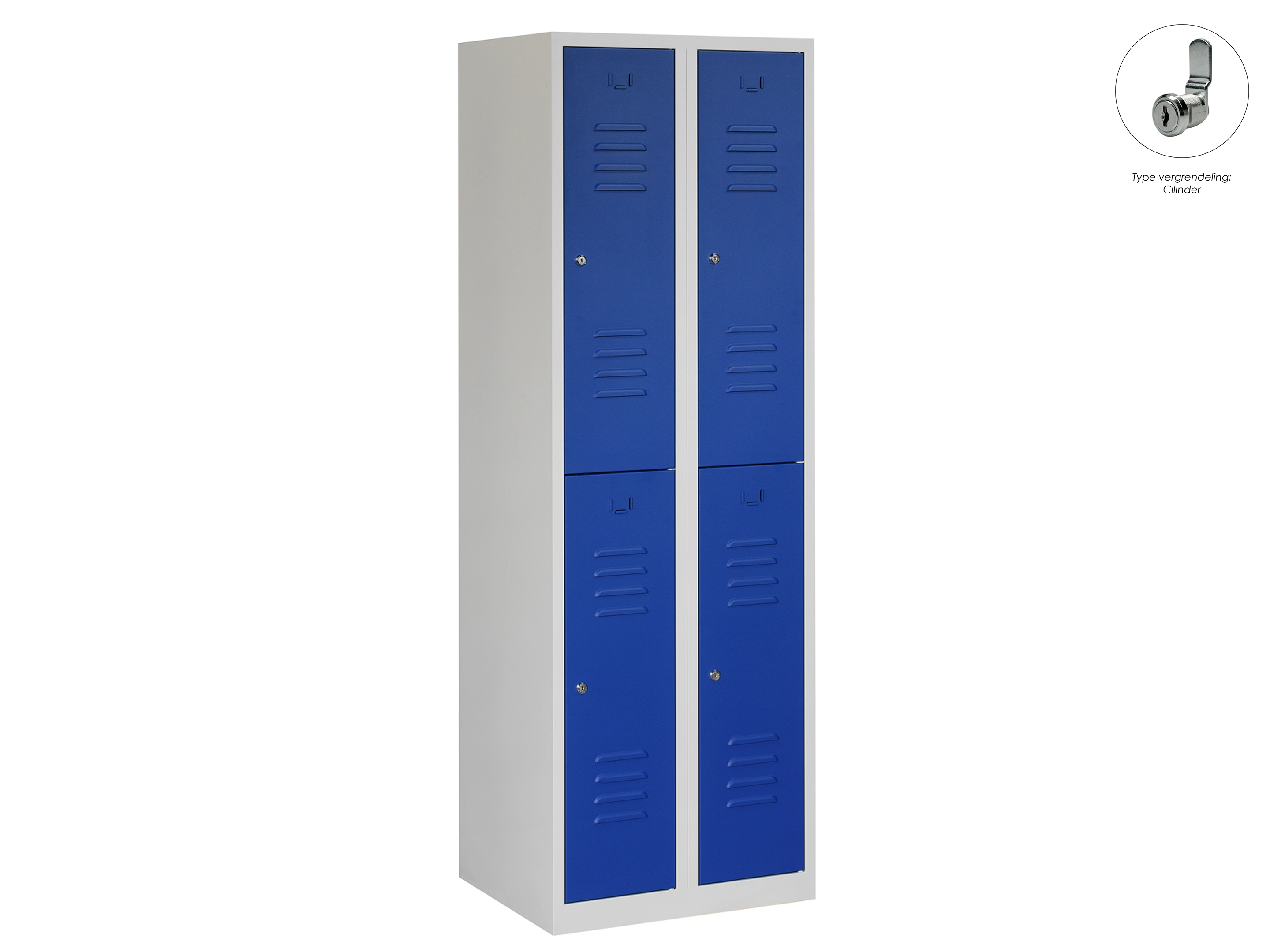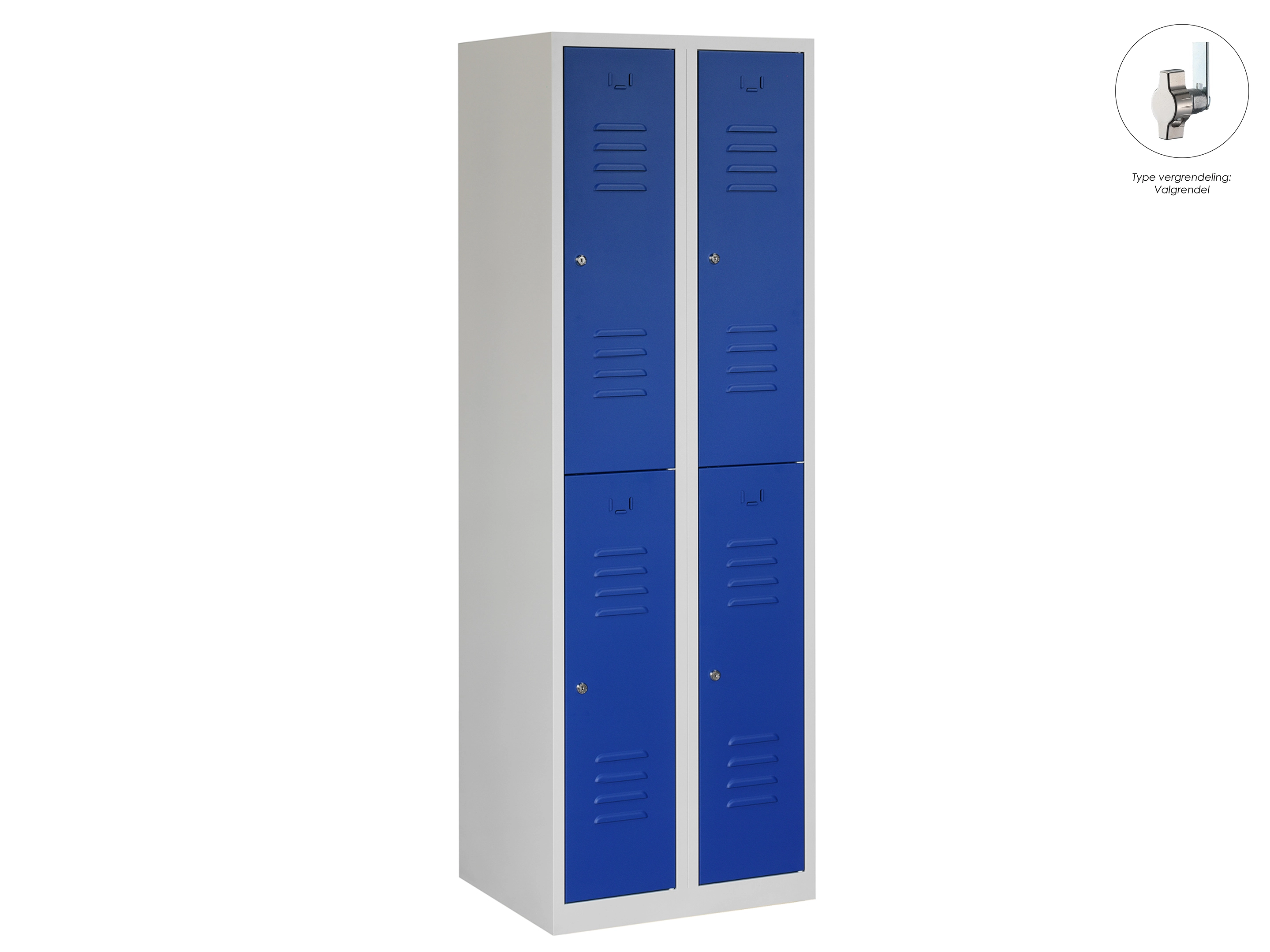 Type deuren: draaideur (ventilatiesleuven), type slot: valgrendelslot. Kleur romp: grijs (RAL7035), kleur deuren: blauw (RAL5010). Afmeting: 180x60x50 cm (HxBxD). Indeling: Kledingroede Aantal deuren: 4, aantal sleutels: geen.