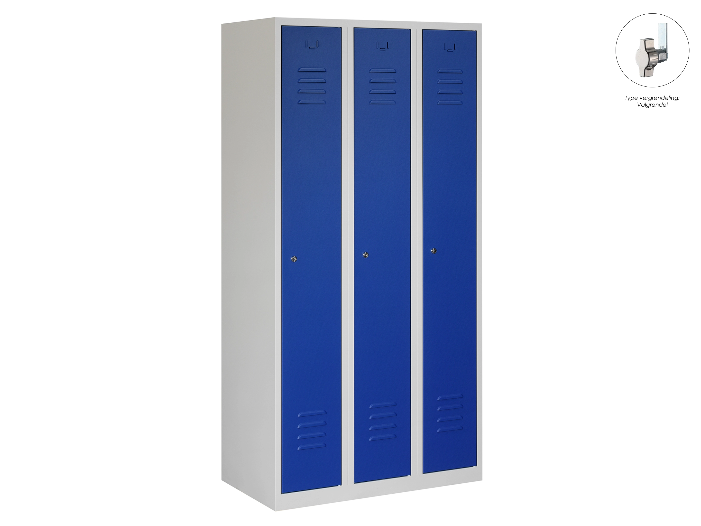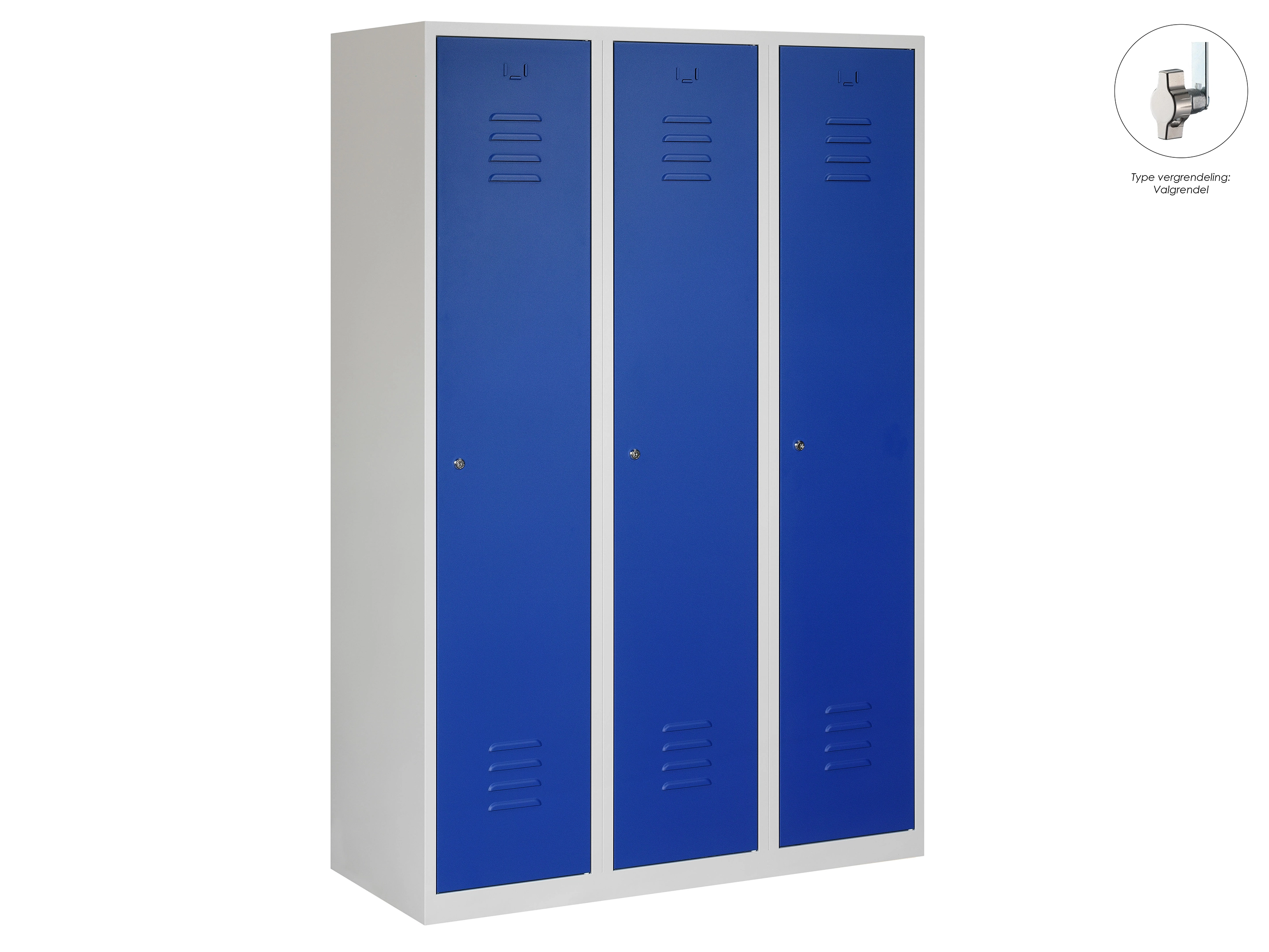Type deuren: draaideur (ventilatiesleuven), type slot: valgrendelslot. Kleur romp: grijs (RAL7035), kleur deuren: blauw (RAL5010). Afmeting: 180x90x50 cm (HxBxD). Indeling: Legbord & kledingroede Aantal deuren: 3, aantal sleutels: geen.