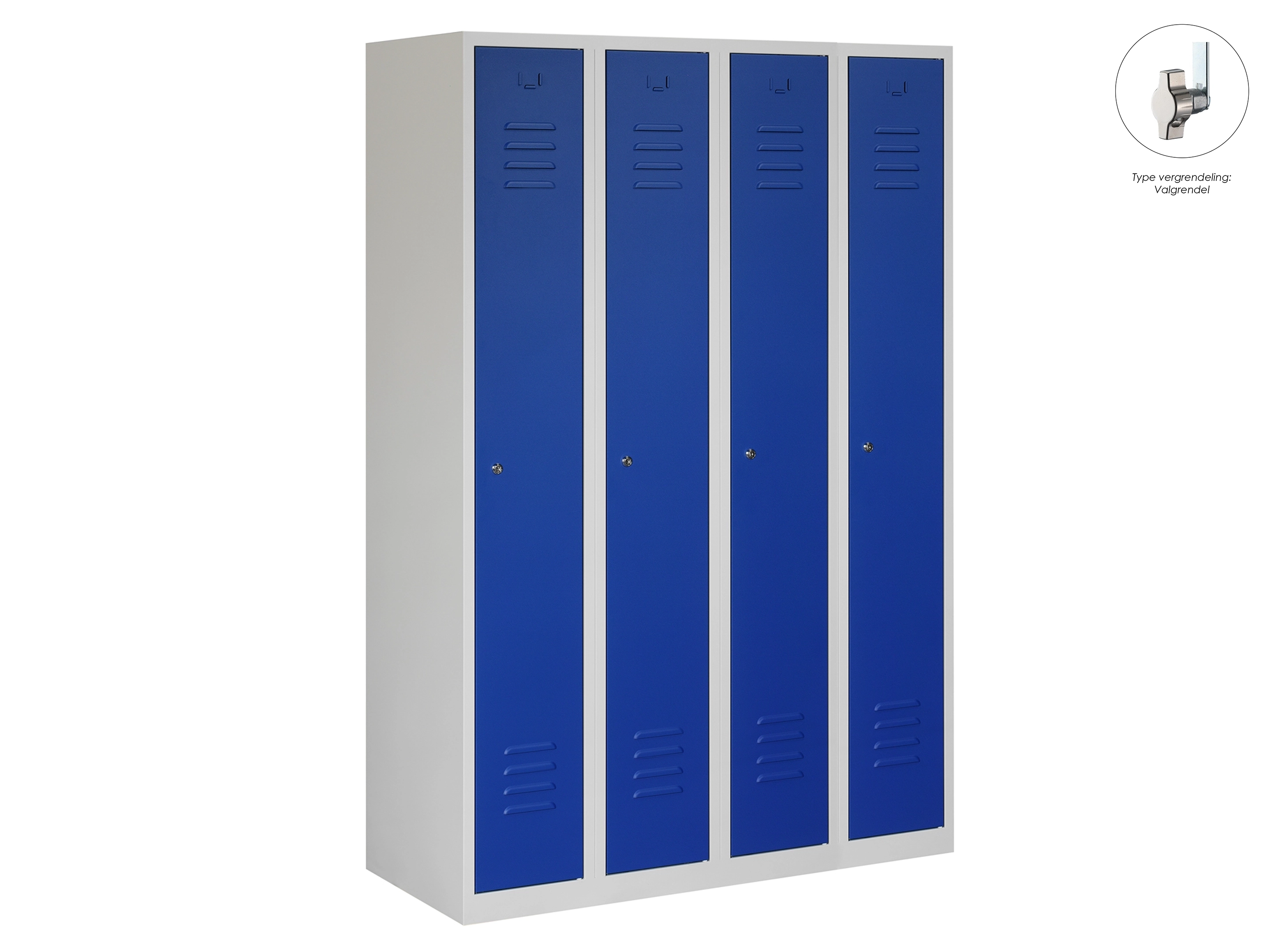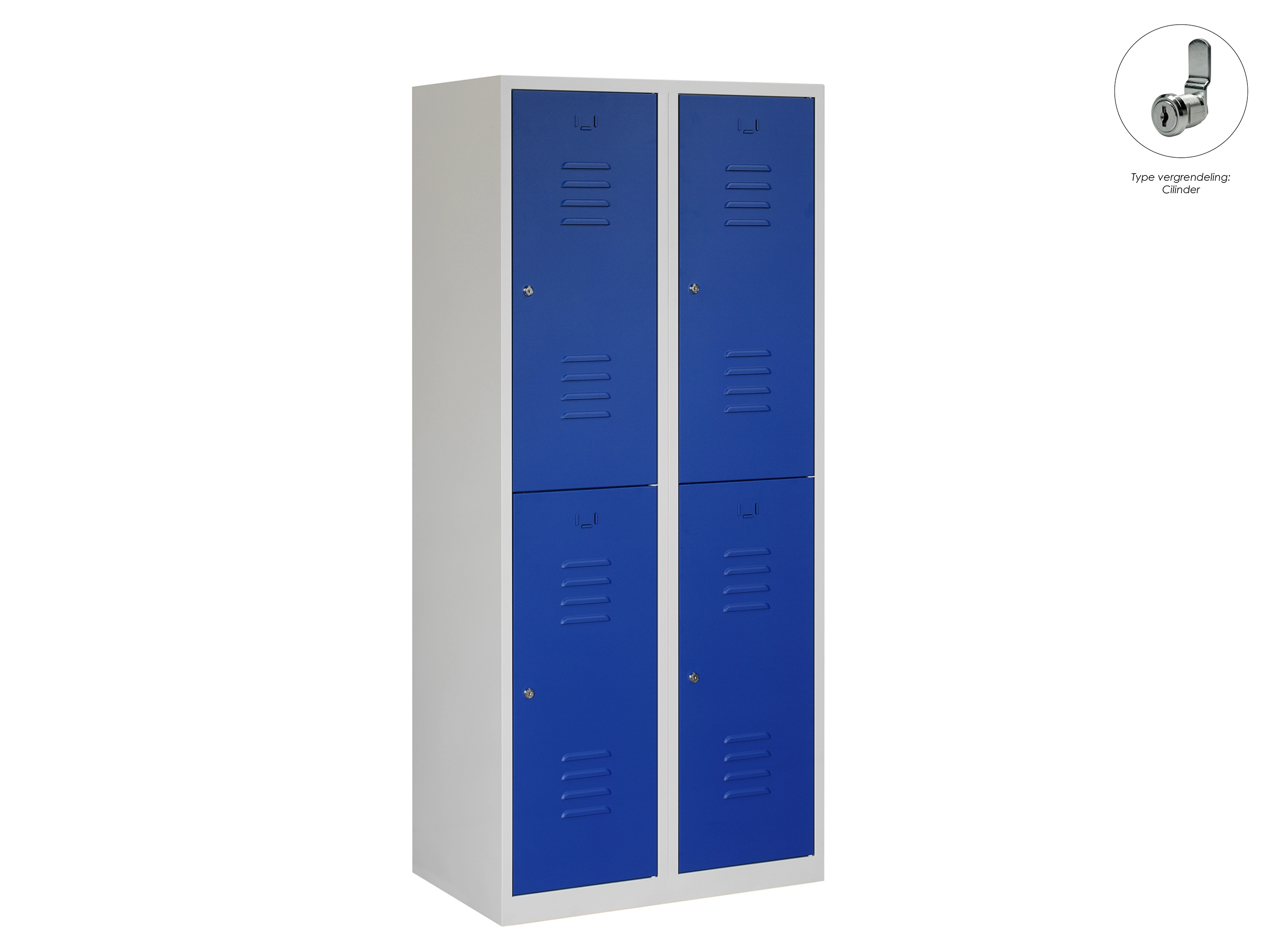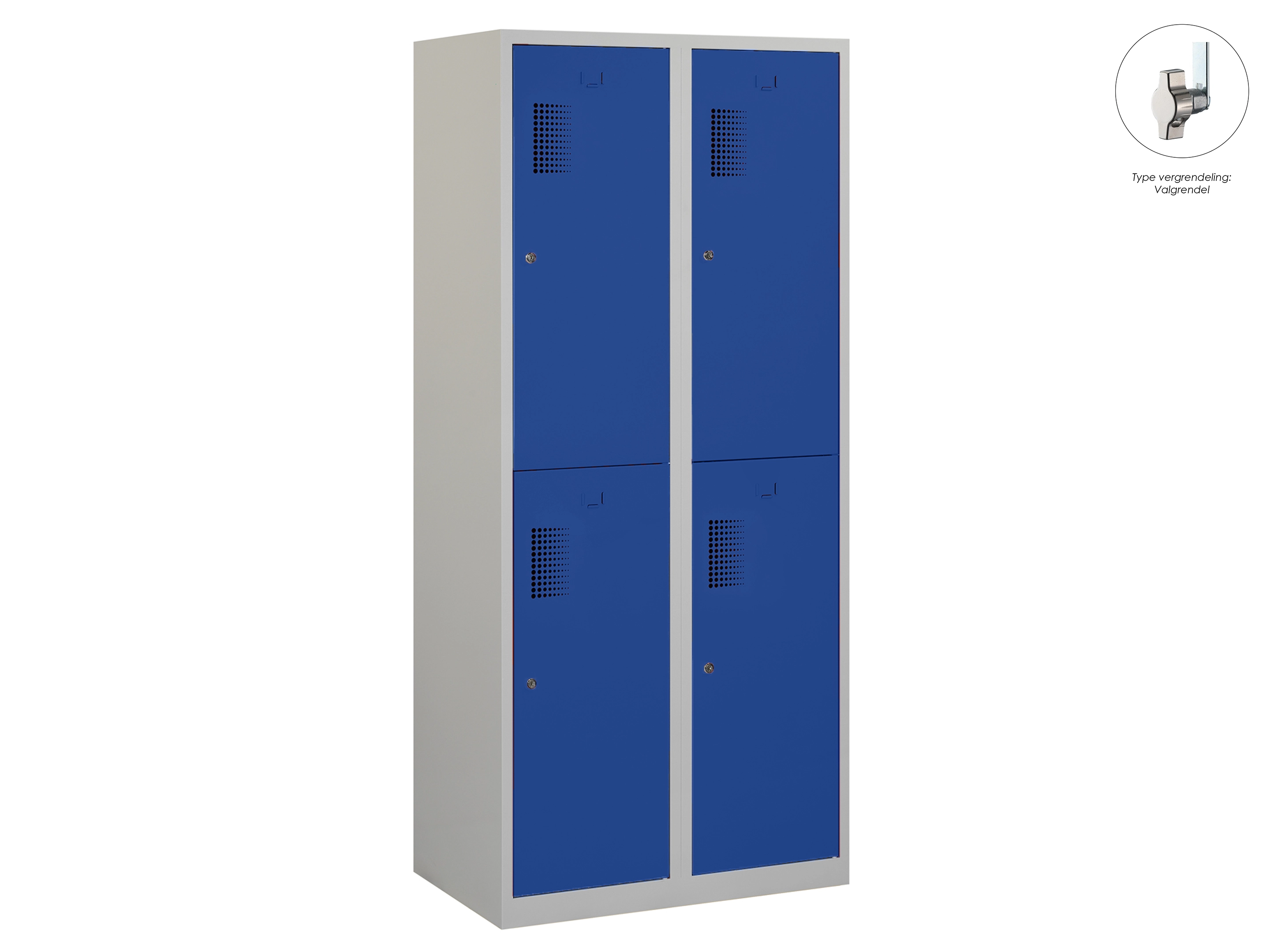 Type deuren: draaideur (geperforeerd), type slot: valgrendelslot. Kleur romp: grijs (RAL7035), kleur deuren: blauw (RAL5010). Afmeting: 180x80x50 cm (HxBxD). Indeling: Kledingroede Aantal deuren: 4, aantal sleutels: geen.