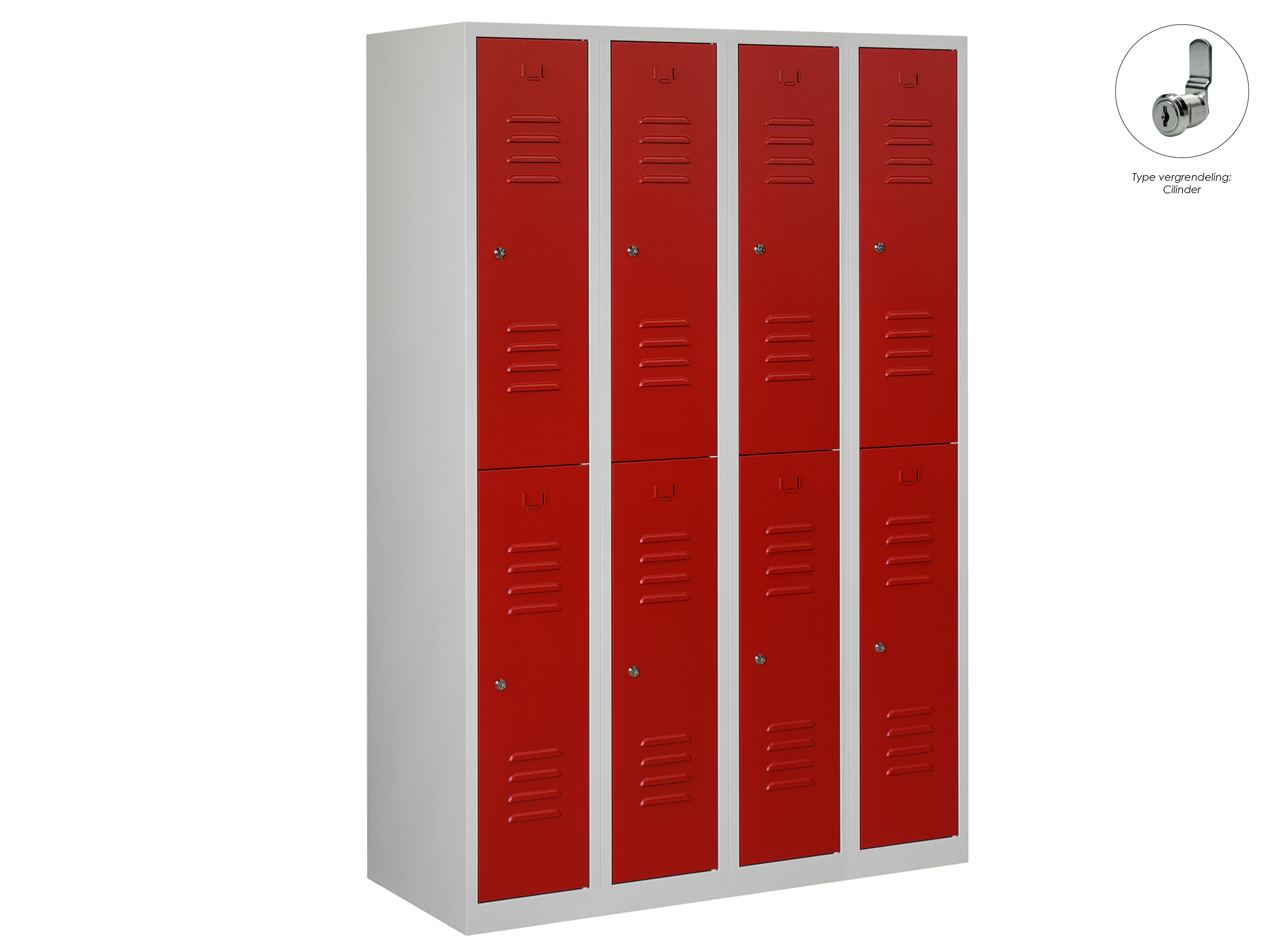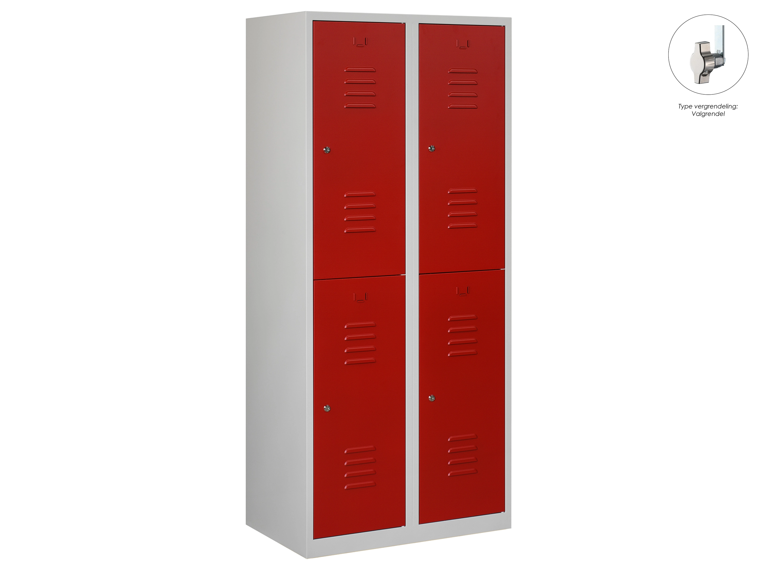 Type deuren: draaideur (ventilatiesleuven), type slot: valgrendelslot. Kleur romp: grijs (RAL7035), kleur deuren: rood (RAL3000). Afmeting: 180x80x50 cm (HxBxD). Indeling: Kledingroede Aantal deuren: 4, aantal sleutels: geen.