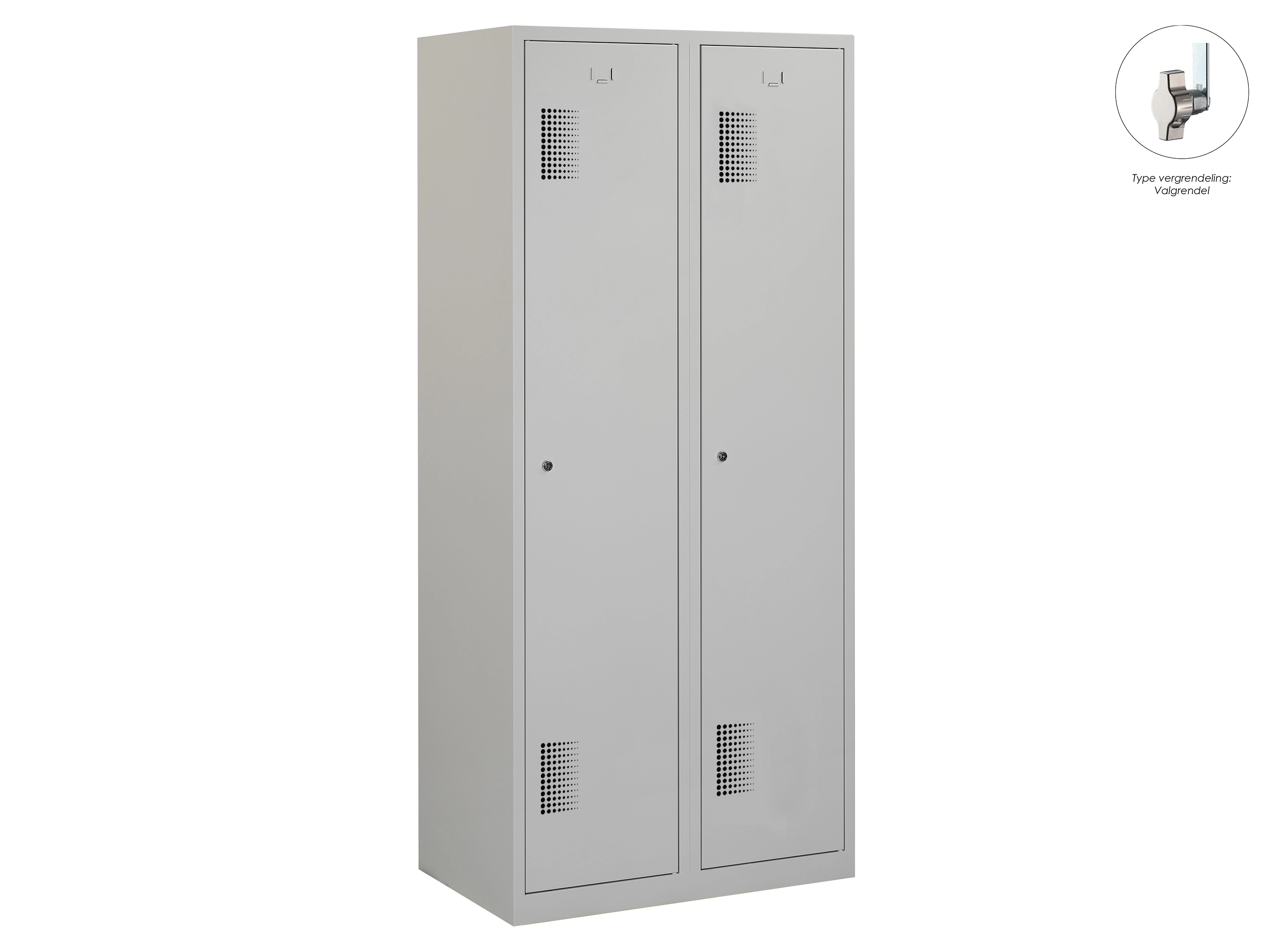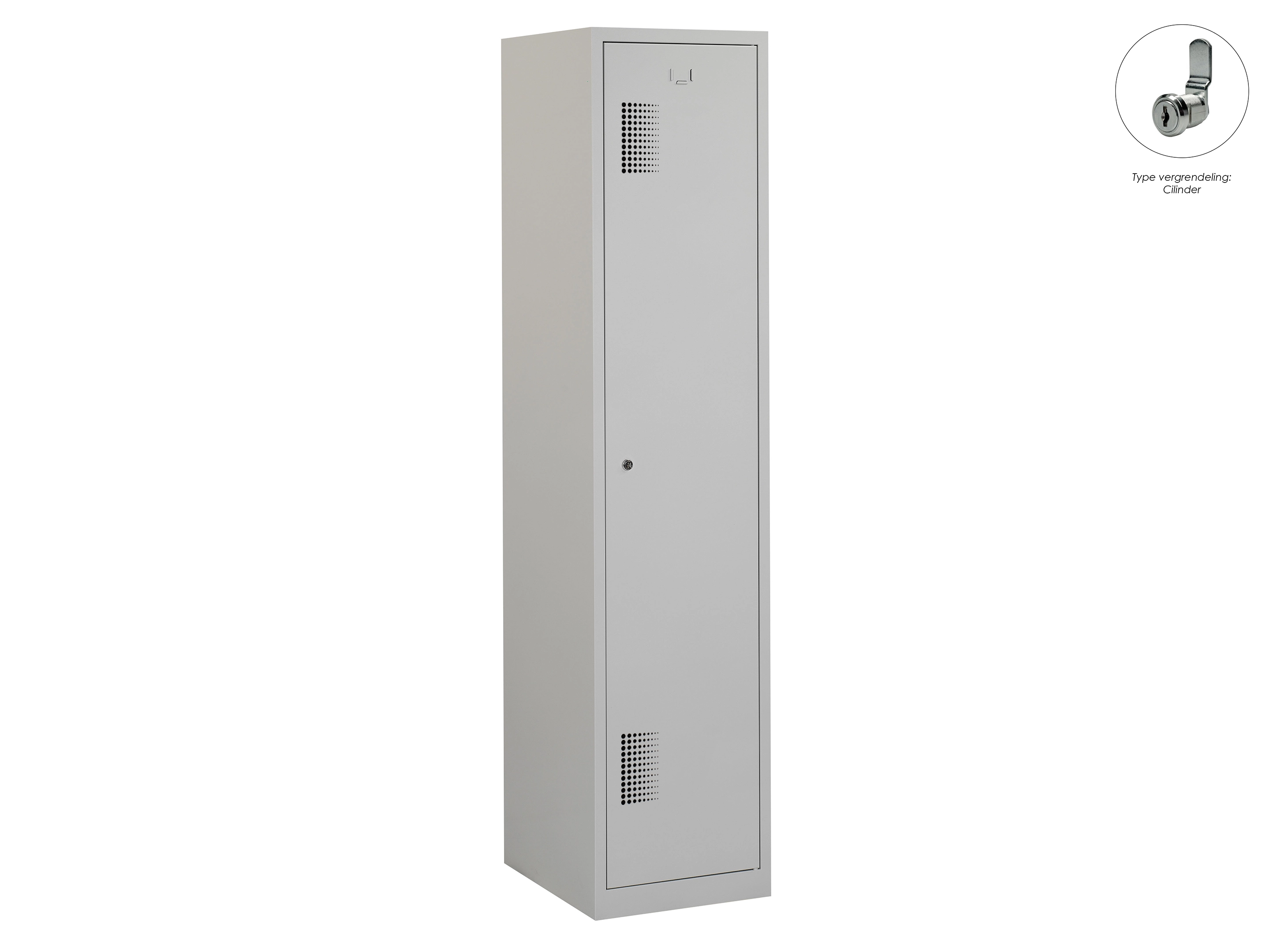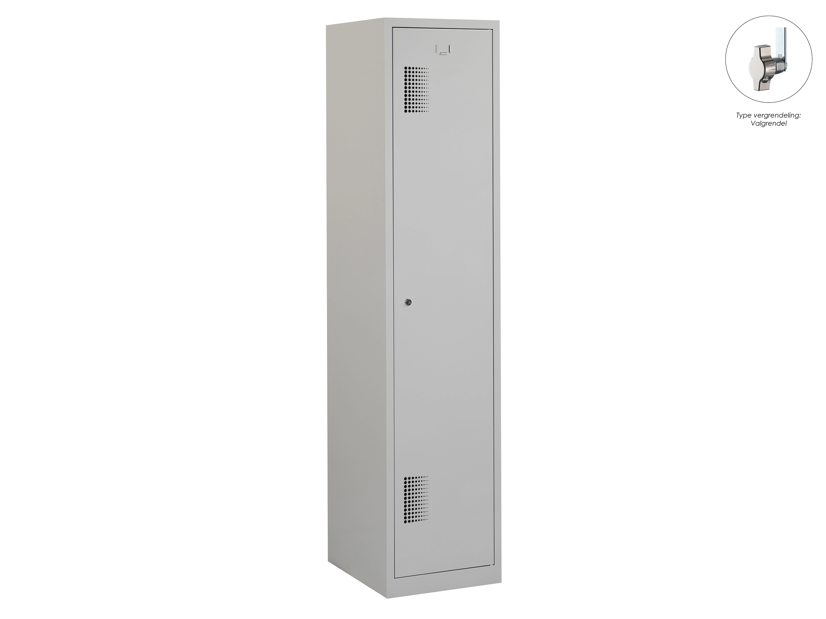 Type deuren: draaideur (geperforeerd), type slot: valgrendelslot. Kleur romp: grijs (RAL7035), kleur deuren: grijs (RAL7035). Afmeting: 180x80x50 cm (HxBxD). Indeling: Legbord & kledingroede Aantal deuren: 2, aantal sleutels: geen.